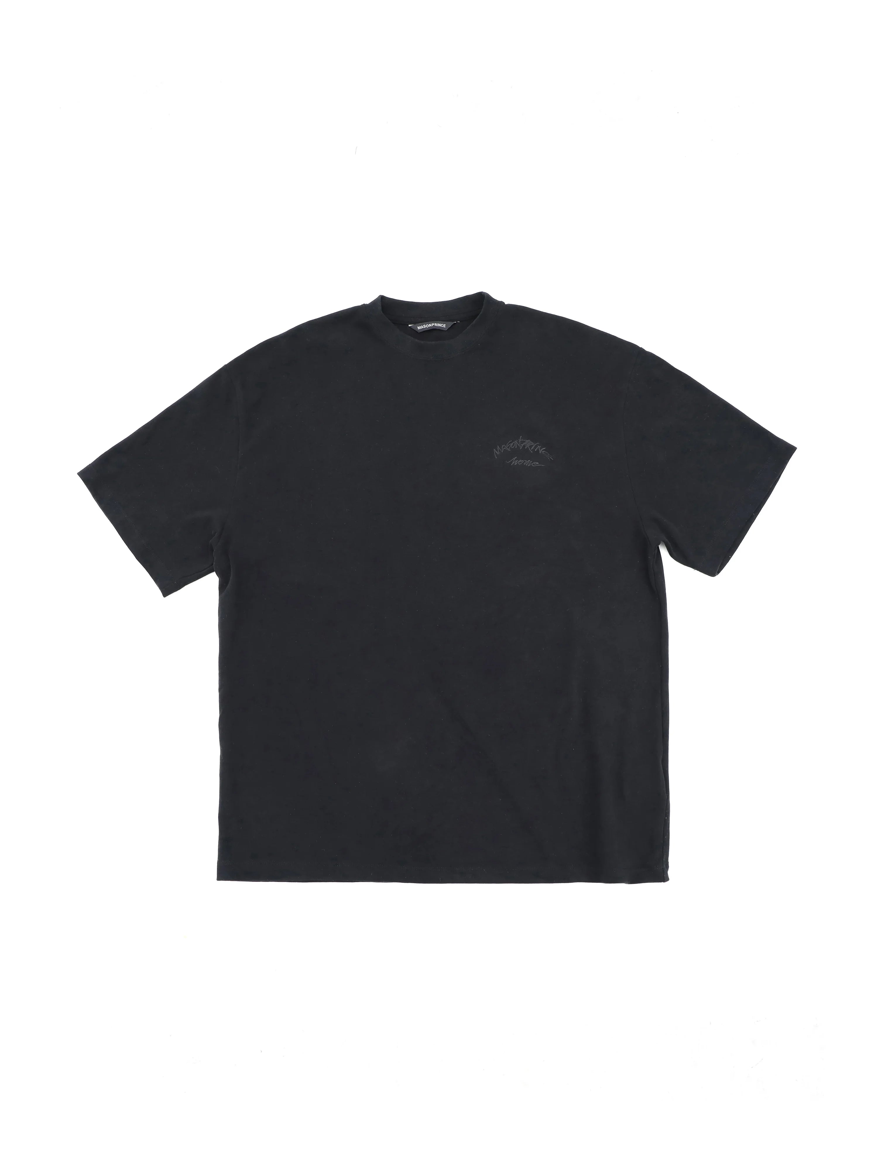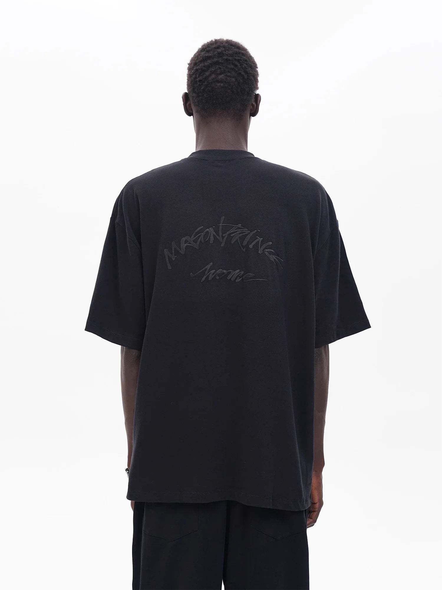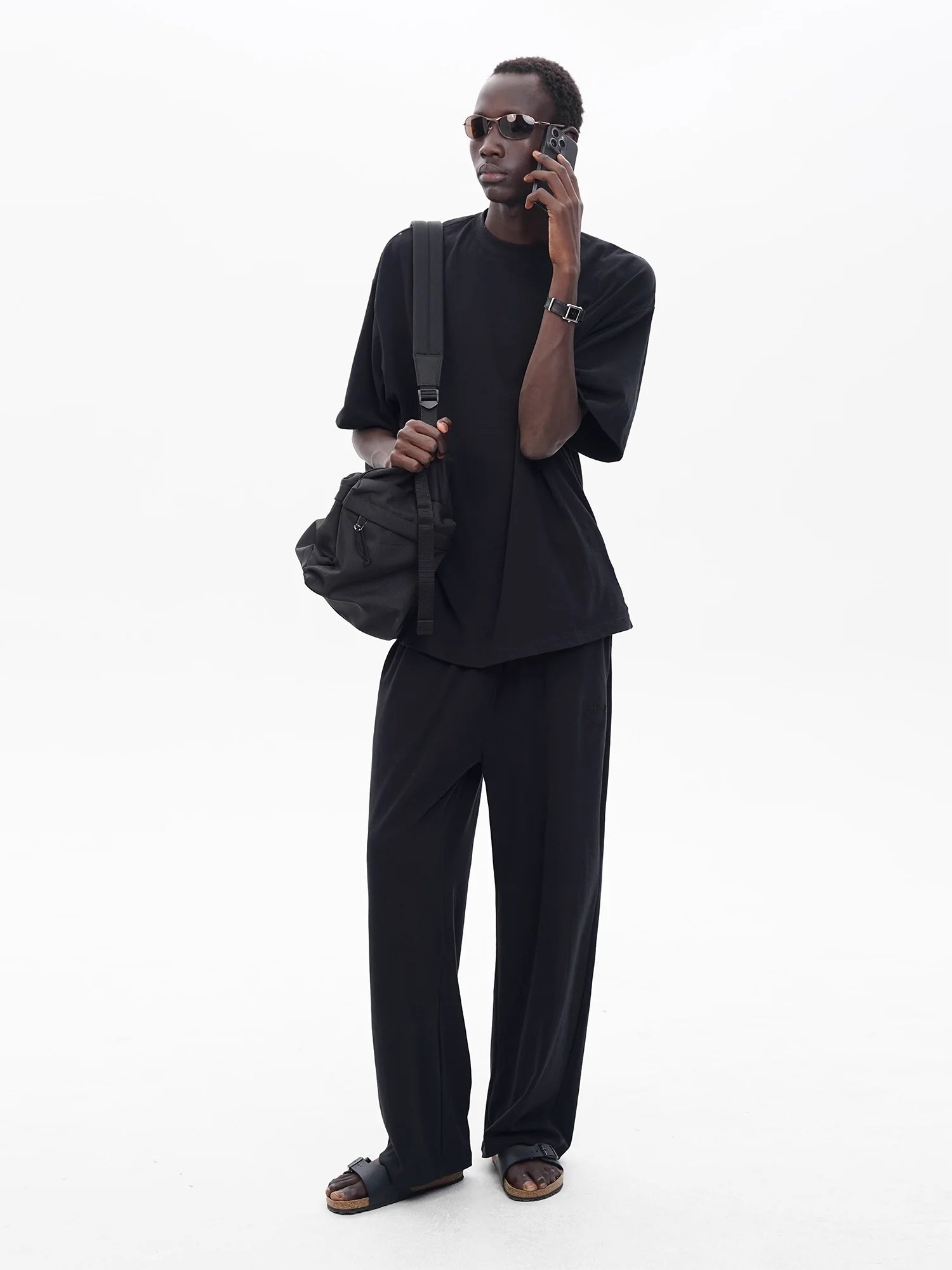 Relax in effortless style with this all-black knit loungewear set for men. The ensemble includes a loose-fitting crewneck T-shirt featuring a subtle tonal graphic on the chest, paired with wide-leg sweatpants for maximum comfort. Designed with a minimalist aesthetic, this set offers a relaxed silhouette ideal for home or casual wear. Complete your look with simple accessories and slide sandals for an understated yet refined vibe.