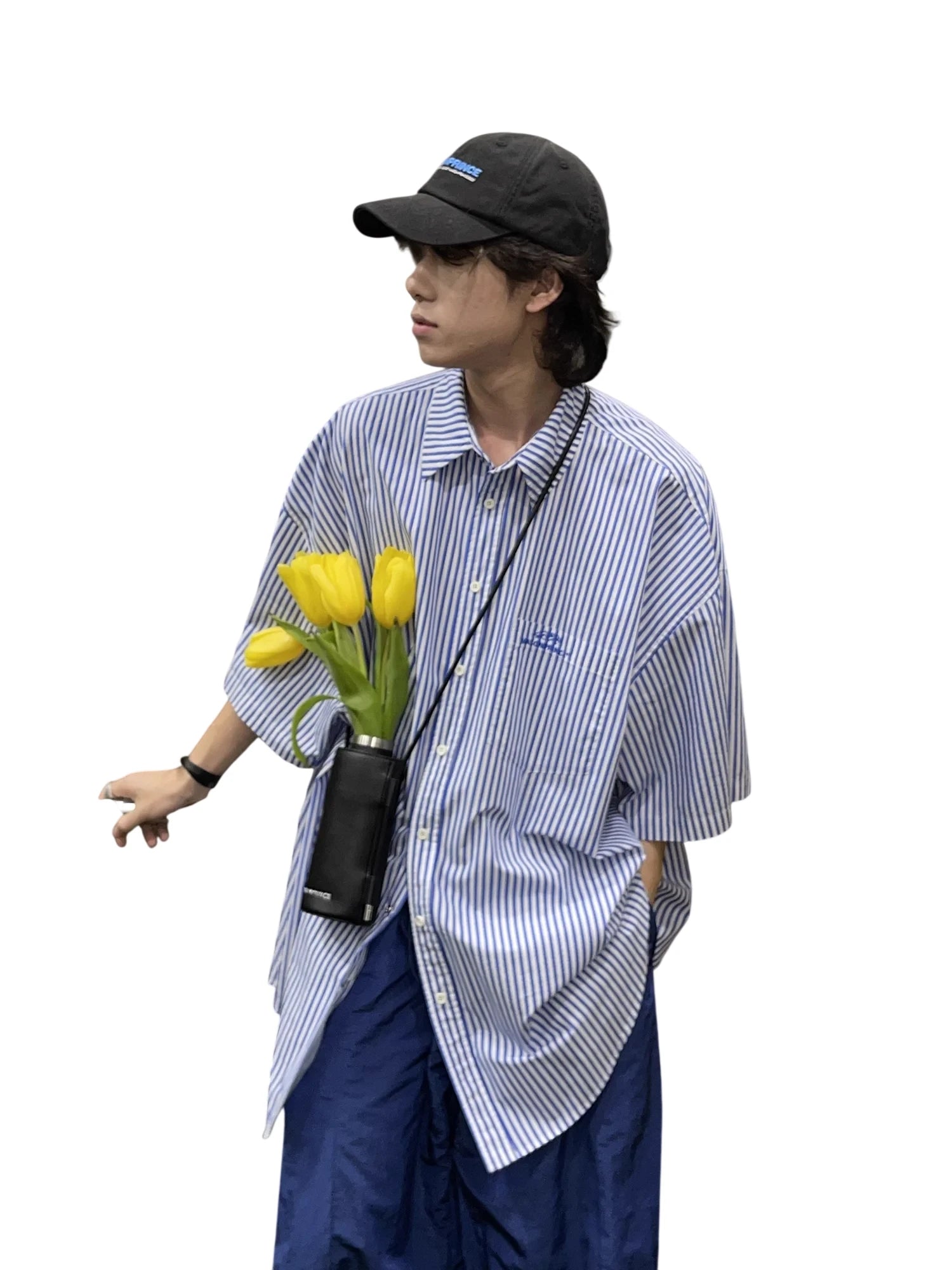 This men's short sleeve shirt features a timeless blue and white vertical stripe pattern for a classic yet casual look. Designed with a button-up front and a traditional pointed collar, it offers a loose, relaxed fit ideal for everyday wear. A subtle chest pocket logo adds a touch of modern detail. The breathable material and oversized cut make it a comfortable choice for summer styling.