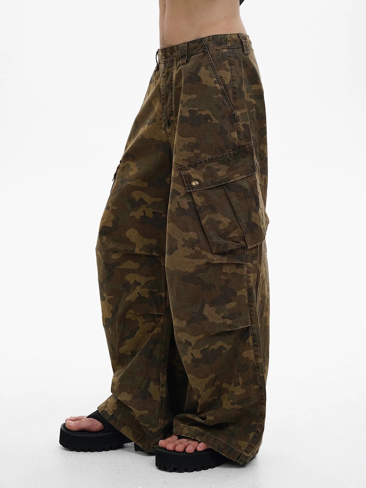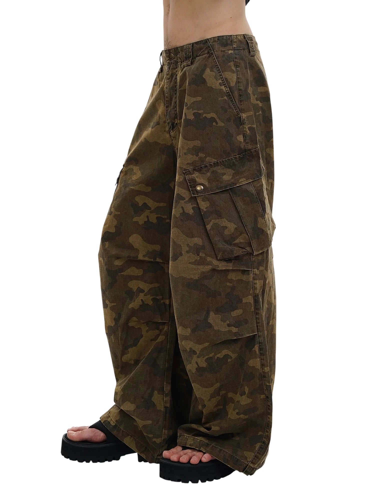 Elevate your casual style with these men's wide-leg cargo parachute pants, featuring a rugged dark green and brown camouflage print. Designed with multiple oversized flap pockets, they blend utility with a military-inspired look. The relaxed, distressed fit offers comfort and movement, making them an ideal choice for streetwear-inspired outfits. Perfect for summer wear, these cargo pants pair effortlessly with bold footwear like thick-soled sandals.