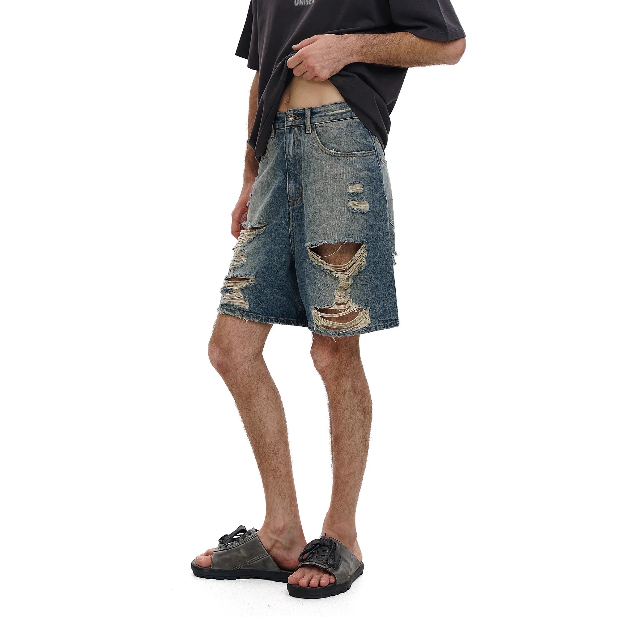 These men's knee-length denim shorts offer a rugged, streetwear vibe with their distressed and frayed detailing. Featuring a classic five-pocket design and zip-fly closure, the shorts are fashioned from medium to dark wash denim and are accented with a subtle natural tie-dye effect. The fading and vintage wear give them a well-worn appeal, perfect for casual, everyday wear.