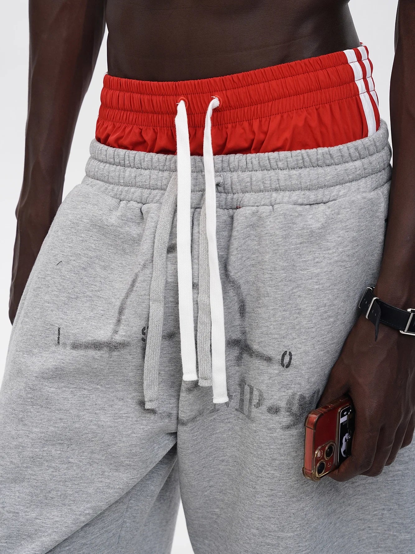 These men's casual cropped shorts feature a relaxed, knee-length fit and are crafted from a heavyweight knit fabric for comfort and durability. Designed with a double-layer waist and raw, unfinished hems, they offer a laid-back, edgy look. The back showcases a faded circular graphic print with star and text details in red and gray, adding a vintage-inspired touch. A peek of red inner lining or waistband adds a subtle layered effect. Perfect for casual wear or lounging, these shorts combine street-style flair with relaxed versatility.