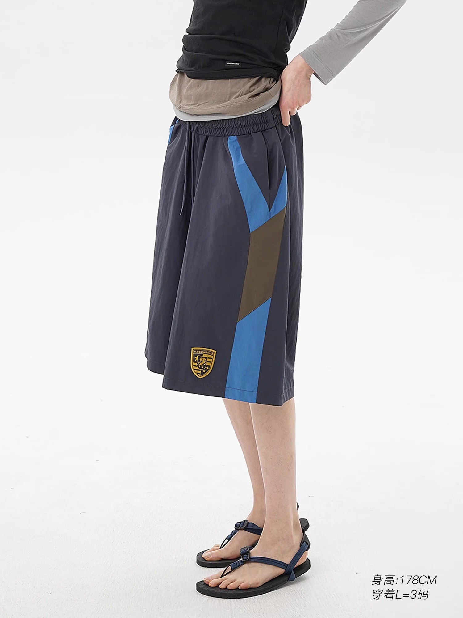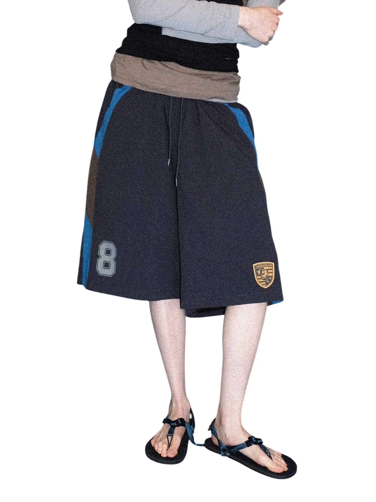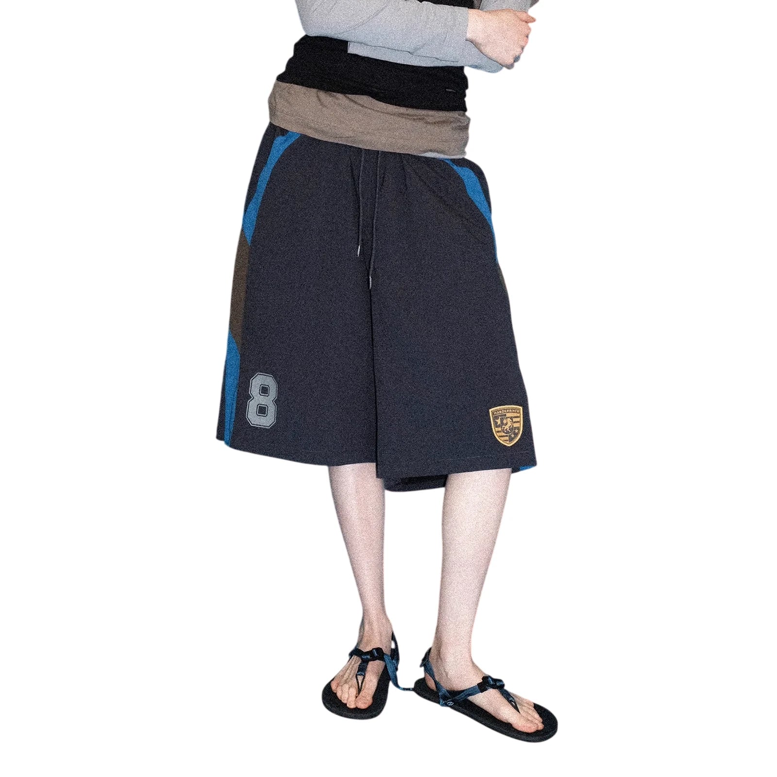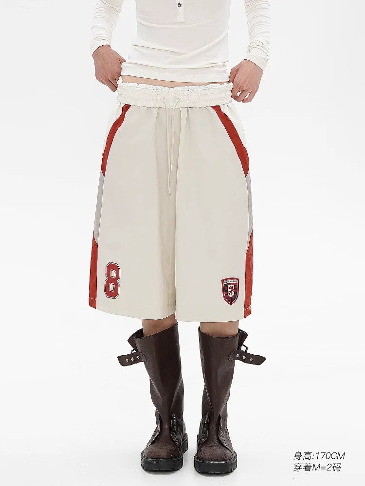 These men's athletic shorts feature an oversized, knee-length design for a relaxed fit. Styled with an elastic drawstring waistband, the shorts include bold blue and brown side panels that add a dynamic contrast. Sporty design details such as a large number "8" on the left leg and a collegiate-style patch on the right leg enhance their athletic appeal.