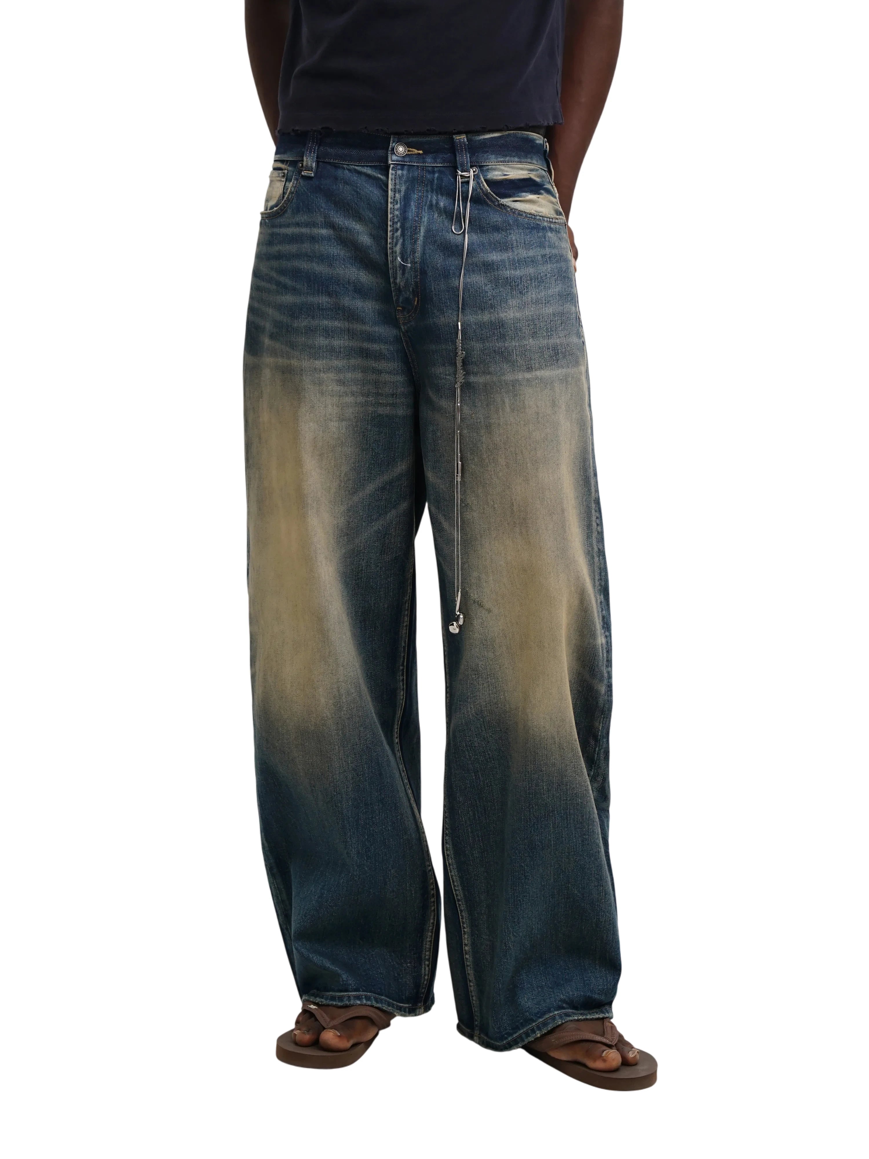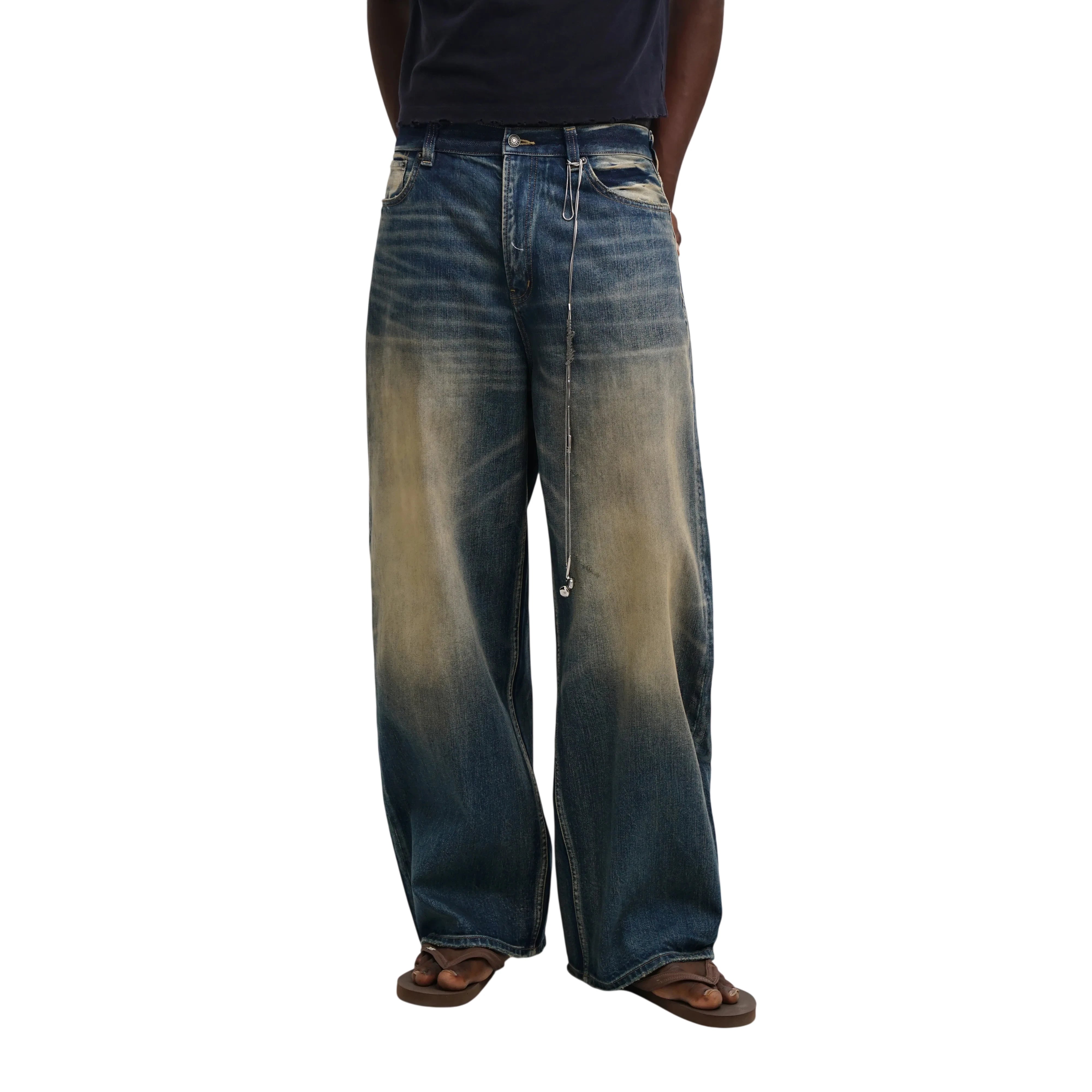 Upgrade your casual style with these men's loose fit wide-leg jeans, designed for comfort and rugged appeal. Featuring a distinctive yellow-tan washed finish, these jeans showcase natural fading on the front thighs and knees, adding a vintage character.