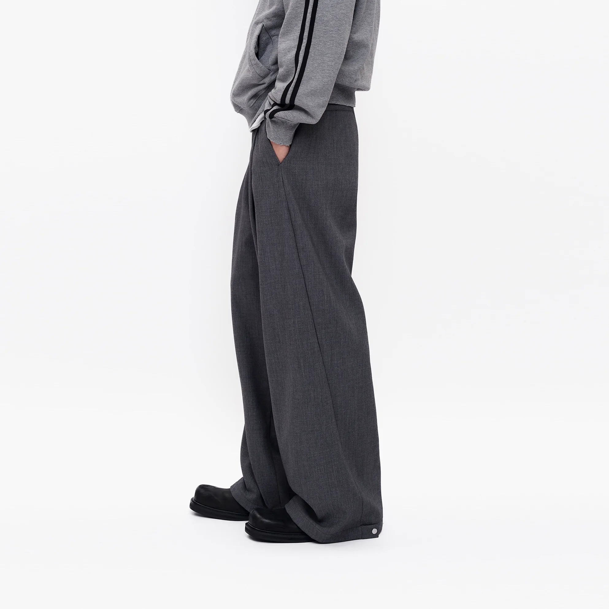 Elevate your everyday style with these classic men's high-waisted trousers. Featuring pleated detailing and a wide-leg, curved silhouette, these trousers offer a relaxed and contemporary fit. Crafted from structured fabric, they provide a smooth drape that extends over the shoes, creating a clean, elongated look.