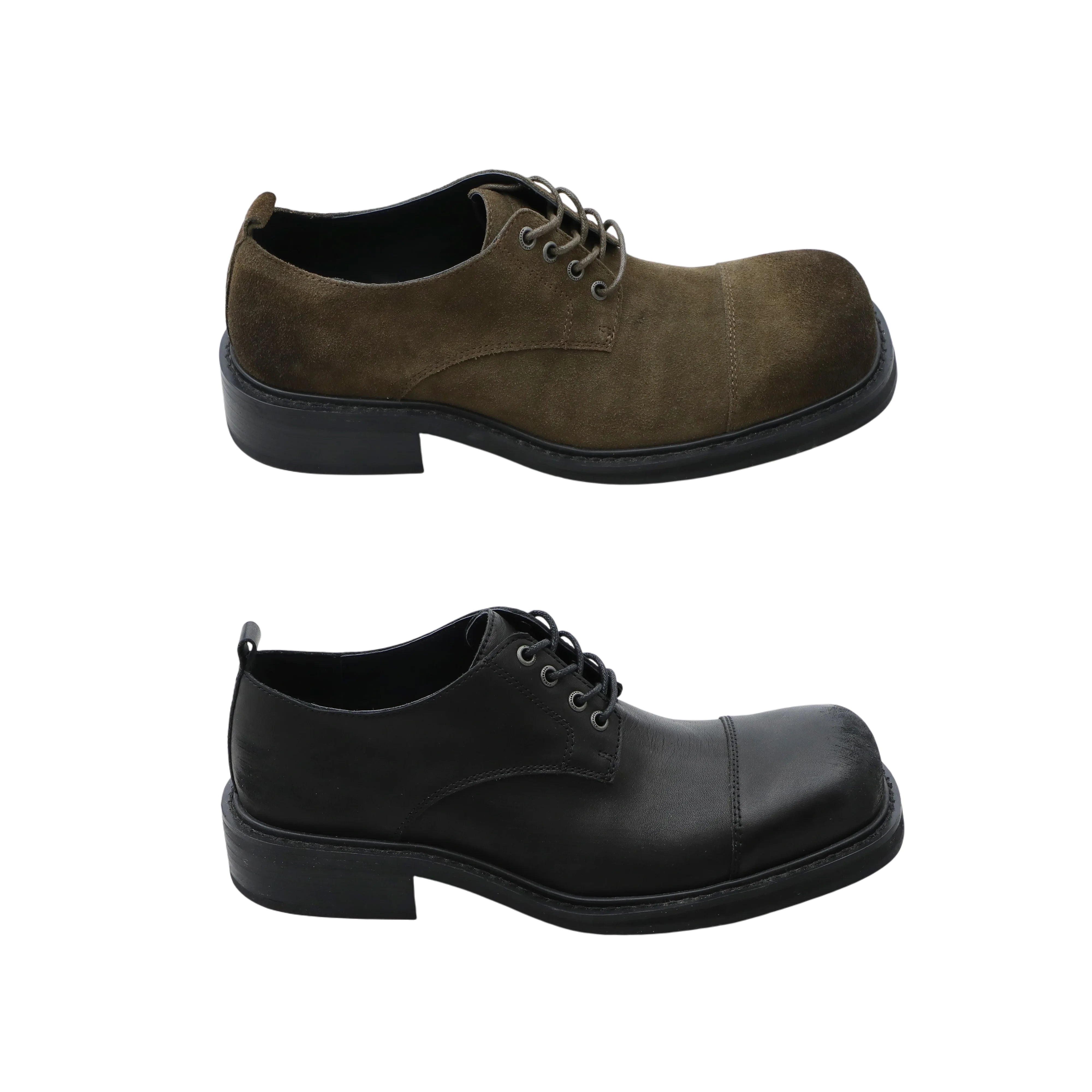 These men's derby shoes are crafted from premium first layer leather, combining durability with a refined style. Featuring a classic cap toe design, they are available in two variations: smooth black leather and matte brown suede. Each pair includes a five-eyelet lace-up closure system and a sturdy low-profile outsole, offering a secure and comfortable fit. Ideal for formal and semi-formal occasions, these shoes blend timeless elegance with military-grade craftsmanship for lasting wear.