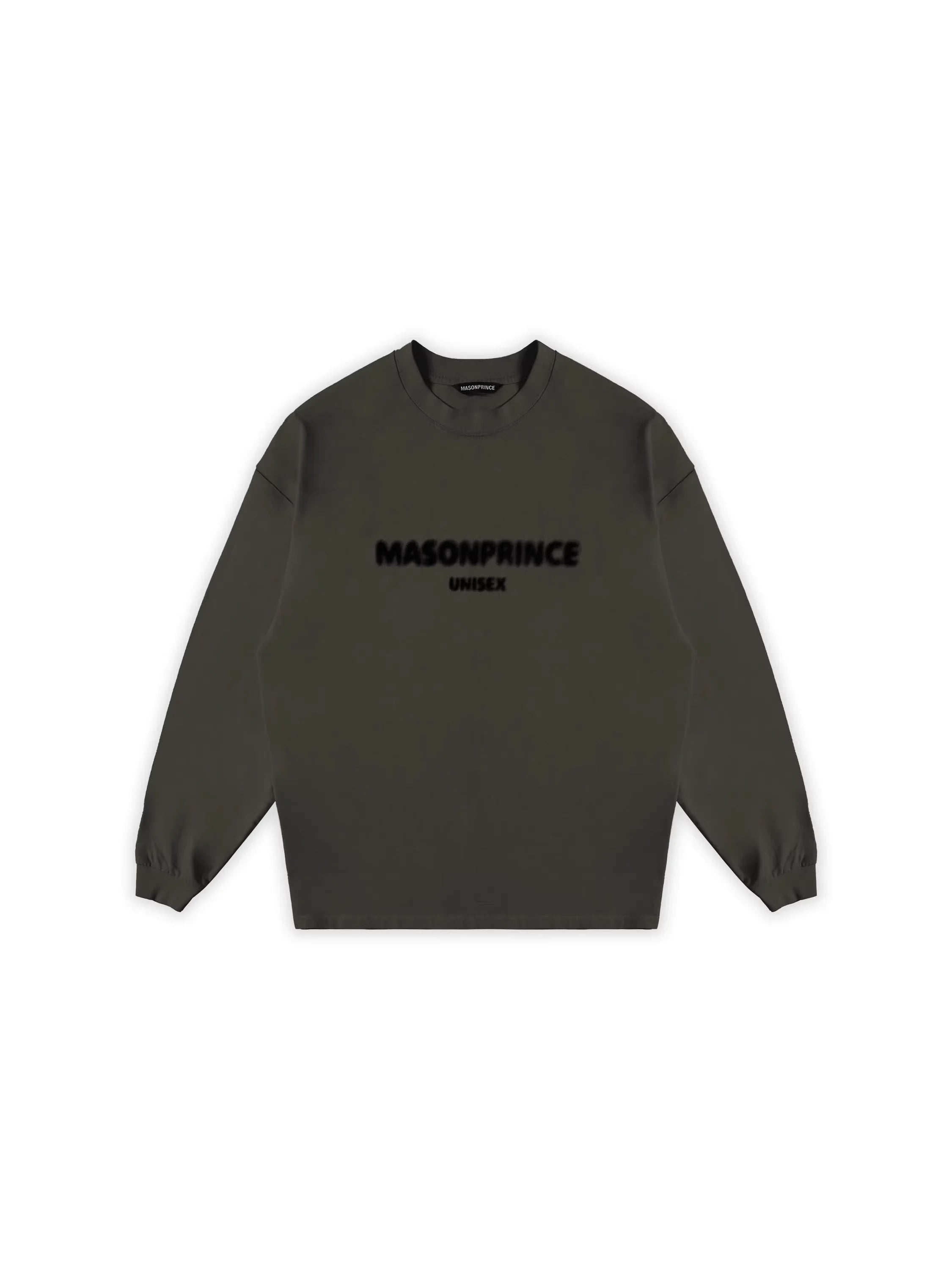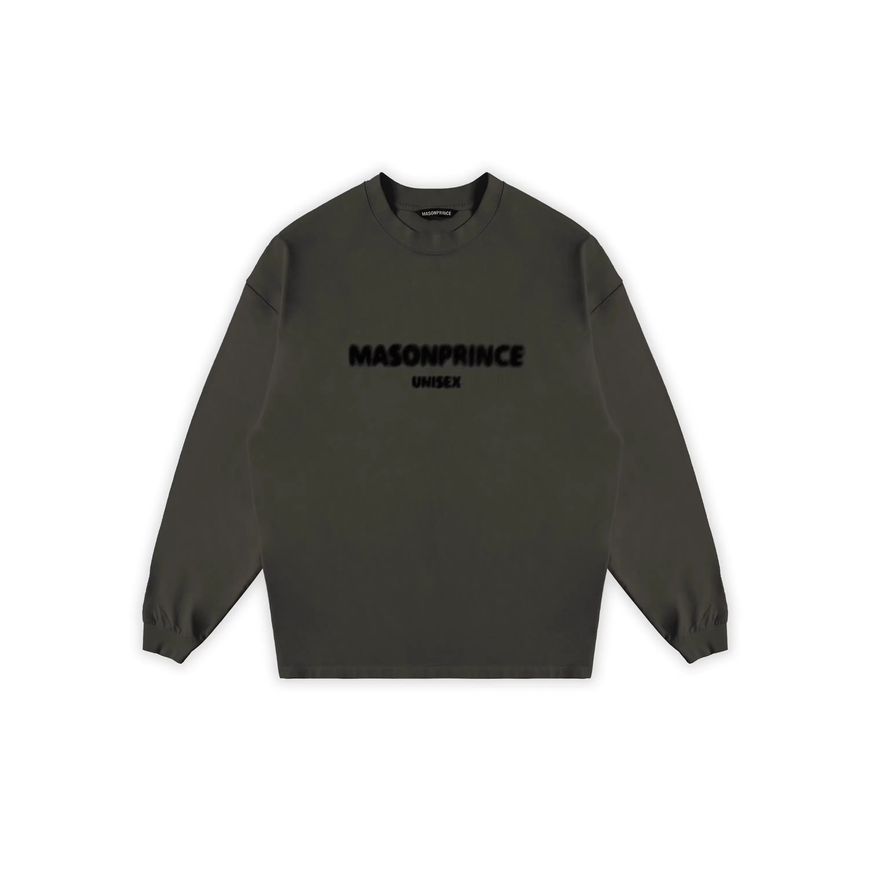 Elevate your everyday style with this lightweight long-sleeve t-shirt designed for men. Crafted in a deep olive green hue, this top features a relaxed fit with dropped shoulders and ribbed cuffs for comfort and ease. The minimalist crew neckline complements the bold black chest print that reads “MASONPRINCE” with “UNISEX” beneath, adding a modern graphic touch. Simple yet stylish, it's ideal for layering or wearing on its own.