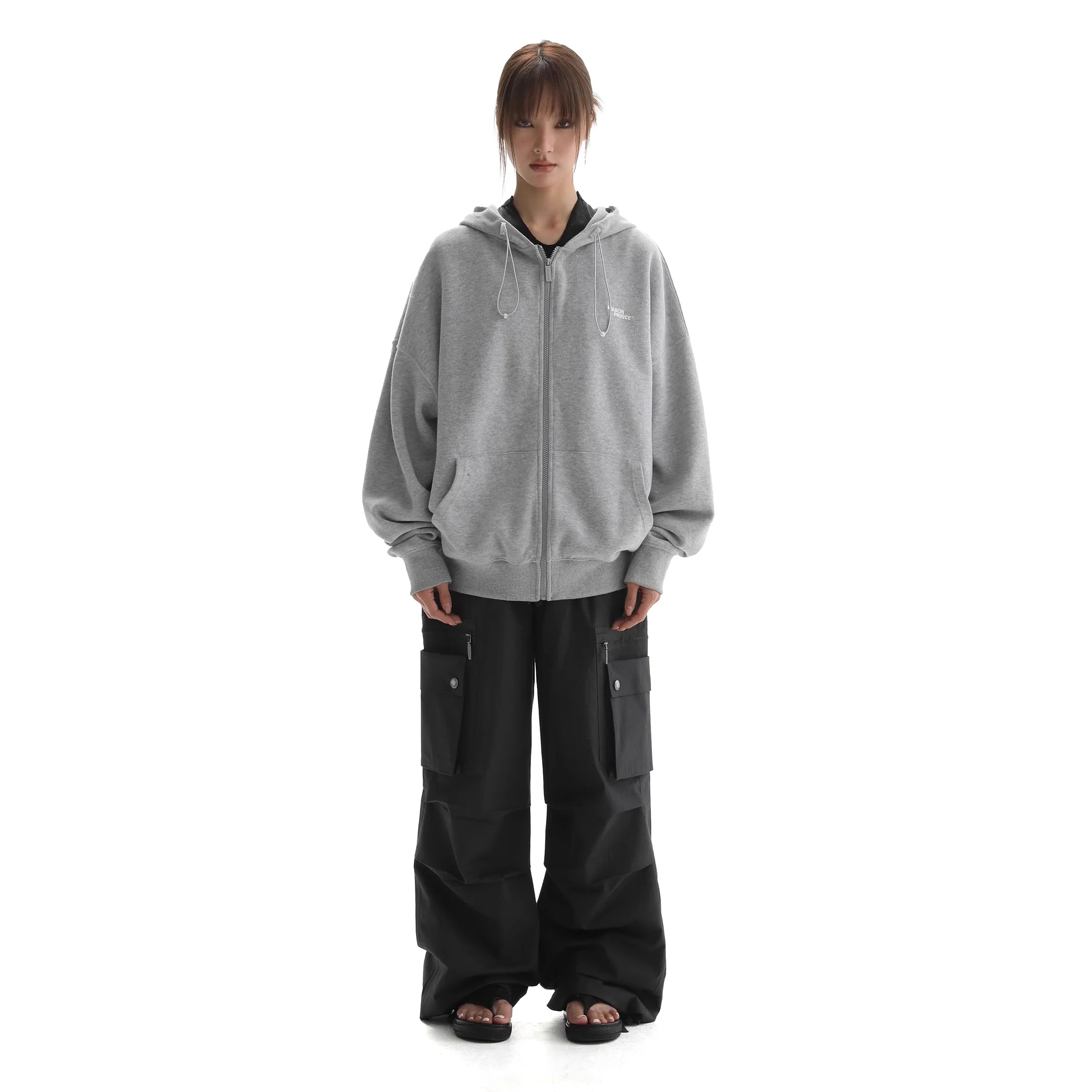 Stay comfortable and stylish with this men's loose fit zip-up hoodie, designed for casual wear during spring and autumn. Featuring a relaxed streetwear silhouette, the hoodie includes a front zipper, drawstring hood, and ribbed cuffs and hem for added comfort. Two hand pockets provide functionality, while the light grey color and oversized fit offer a versatile, retro-inspired look. Ideal for everyday wear and perfect for couples seeking coordinated casual outfits.