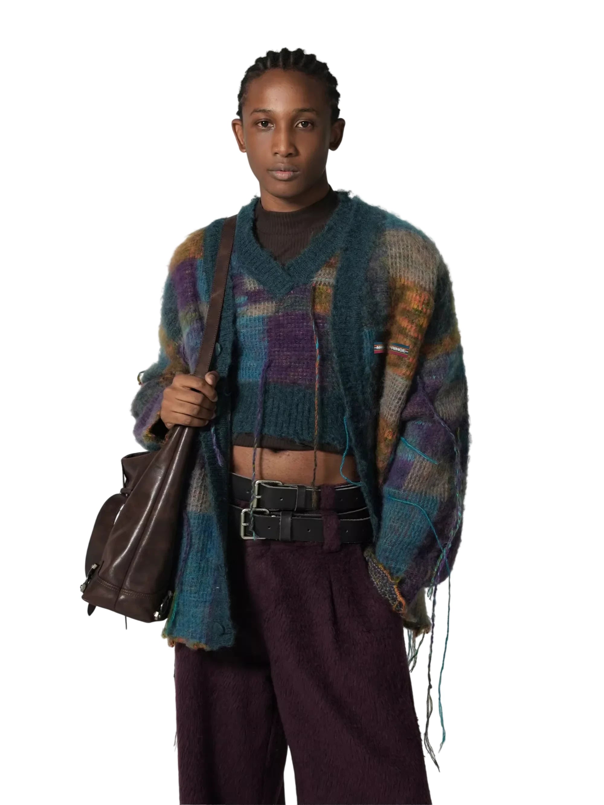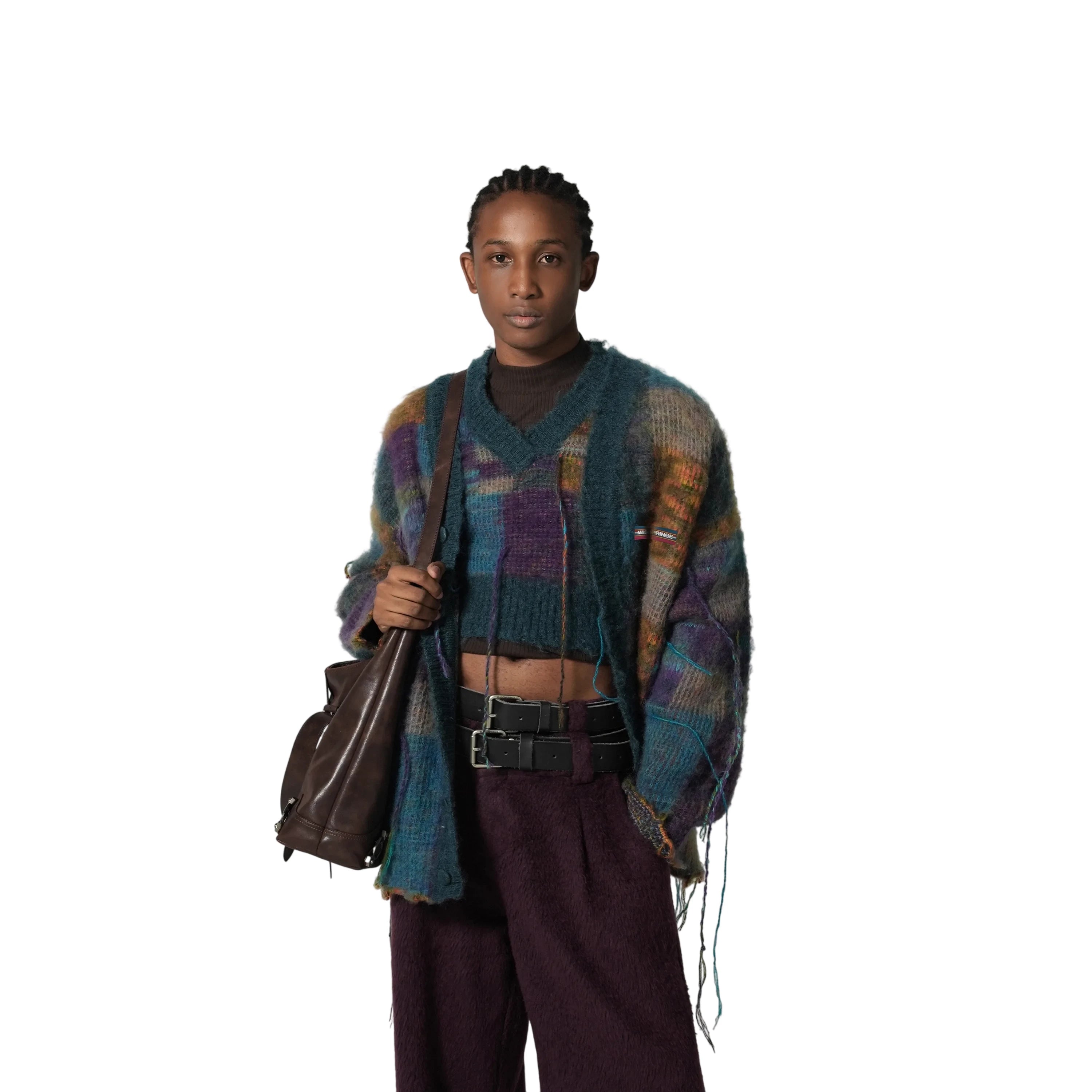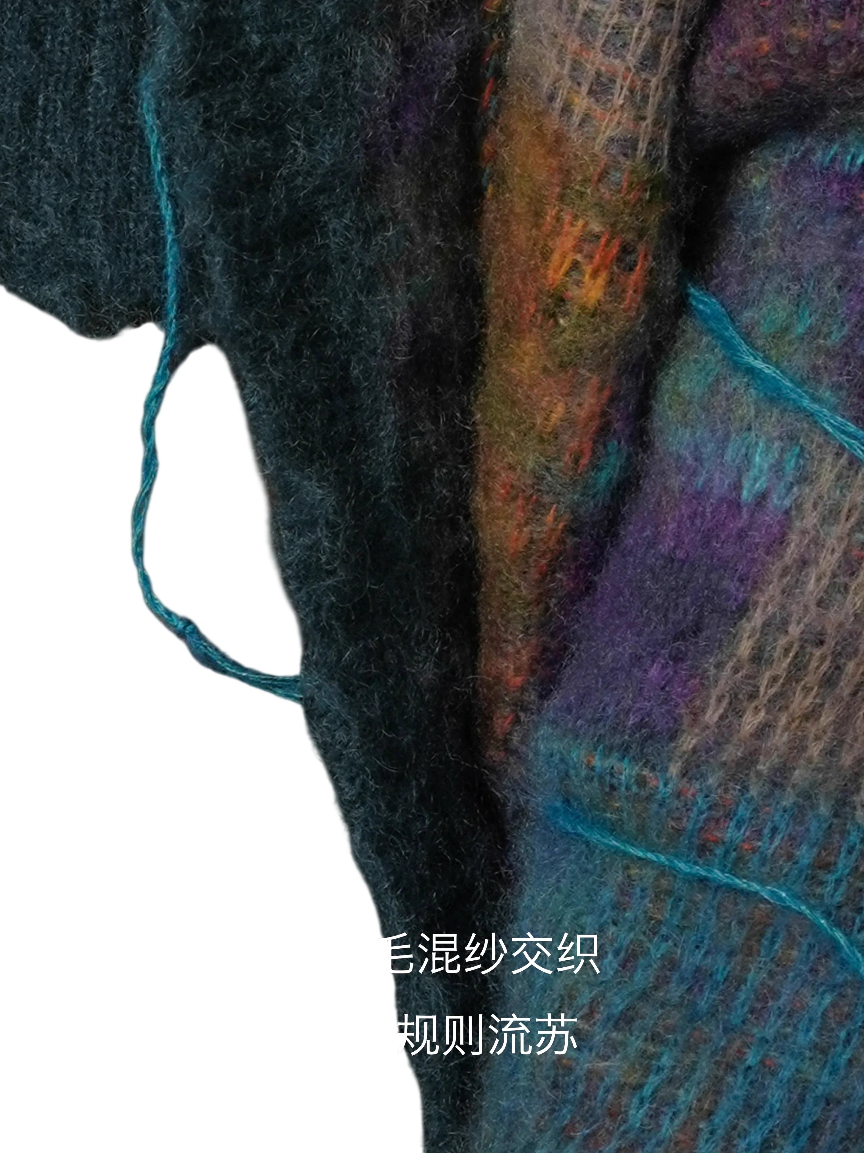 Elevate your winter style with this men's mohair blend cardigan. Featuring a bold checkered pattern in a rich palette of teal, purple, and gold, this oversized, loose-fit jacket offers both warmth and contemporary flair. The textured knit is accented with tassels for a stylish edge, making it a standout piece for any wardrobe. Layer it over sweaters or tees for a fashion-forward cold-weather look.