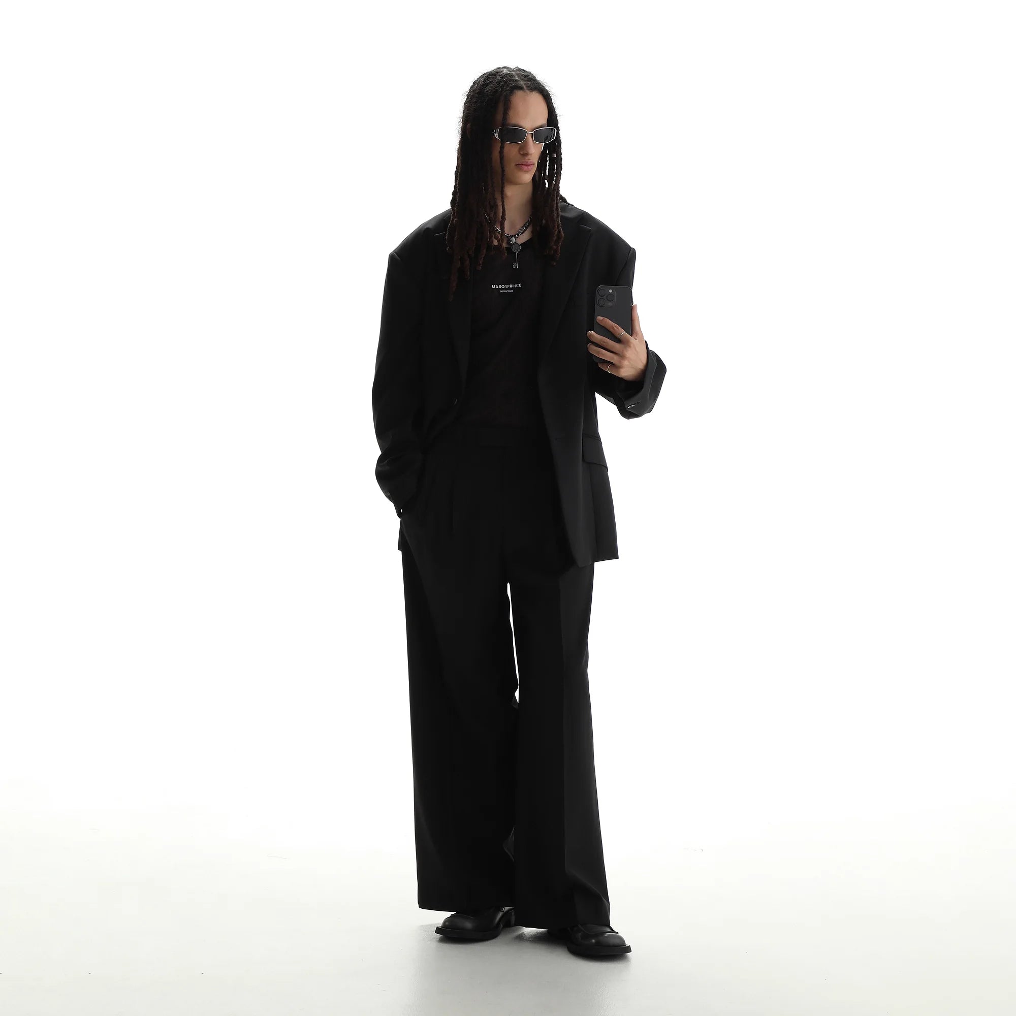 Elevate your wardrobe with this contemporary two-piece suit set designed for men. The ensemble features a high-end oversized blazer paired with matching wide-legged trousers, offering a bold and fashion-forward silhouette. A black shirt with visible branding adds a streetwear edge, while dark sunglasses and a chunky metallic necklace enhance the modern appeal. Completed with sleek black shoes, this outfit is ideal for those seeking a minimalist yet impactful look. Perfect for high-fashion occasions or editorial styling.