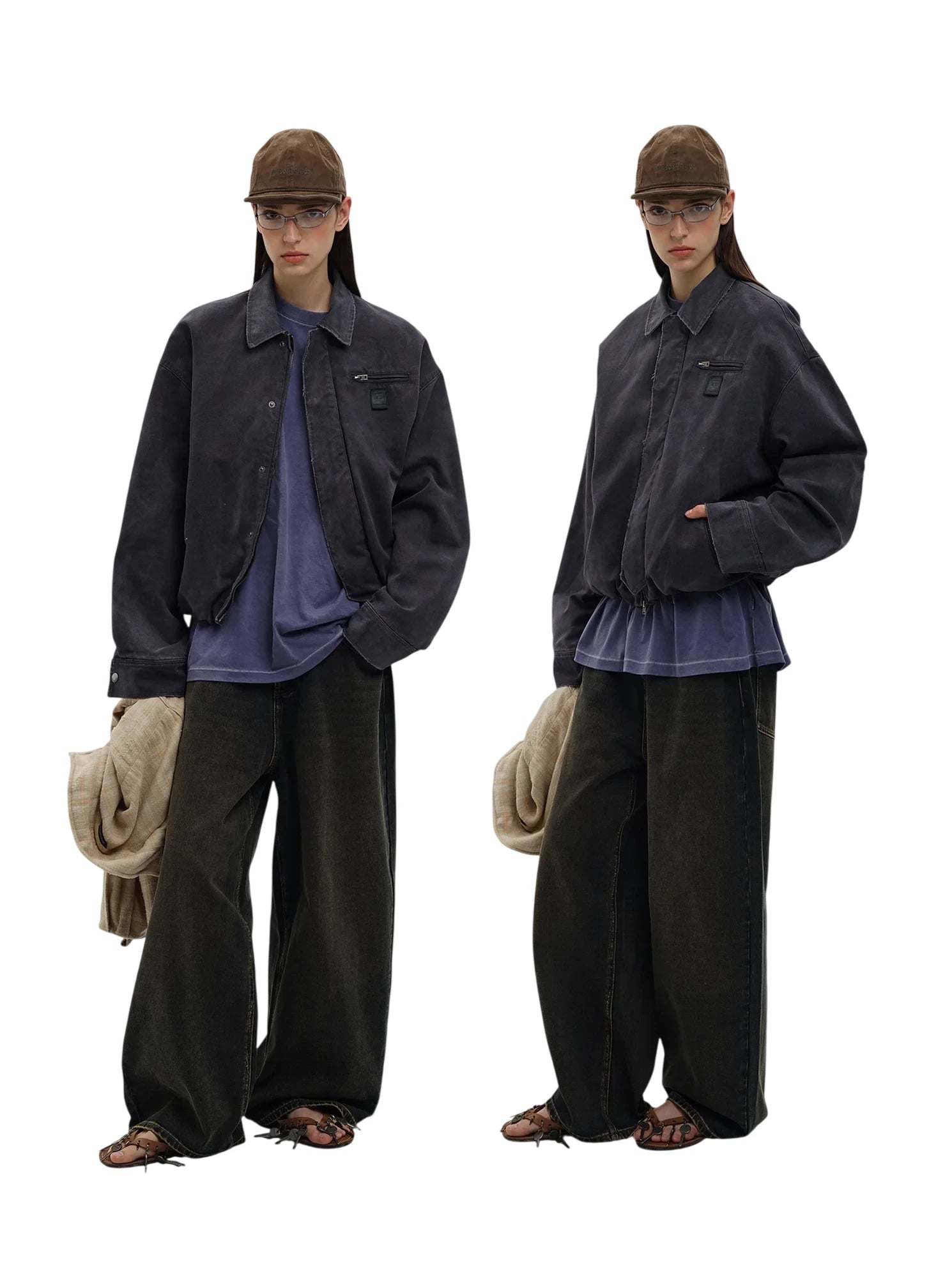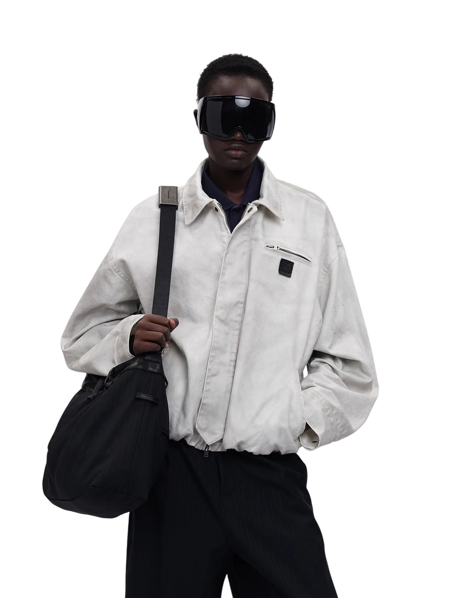 Step into autumn with this men's oversized workwear jacket, designed for ultimate comfort and street-style appeal. Crafted from a soft suede-like fabric in a light gray tone, this jacket features a stylish wide bud collar, a zip-up front, and a zippered chest pocket for added utility.