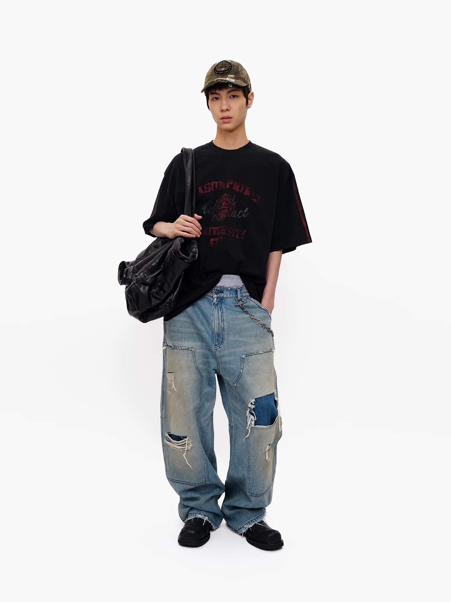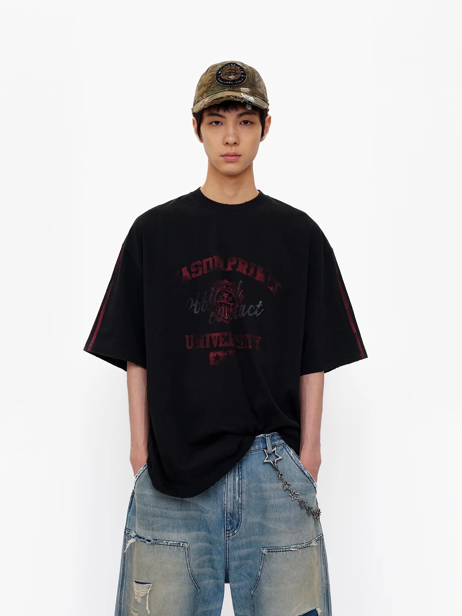 This men's oversized black T-shirt features a bold red "Atmosphere University" badge-style graphic on the front, offering a standout streetwear look. Crafted from natural cotton, the tee combines comfort with style, making it ideal for early autumn wear. The relaxed fit adds a laid-back vibe that's perfect for casual settings or campus life. Pair it with distressed jeans and sneakers for an effortlessly cool outfit.