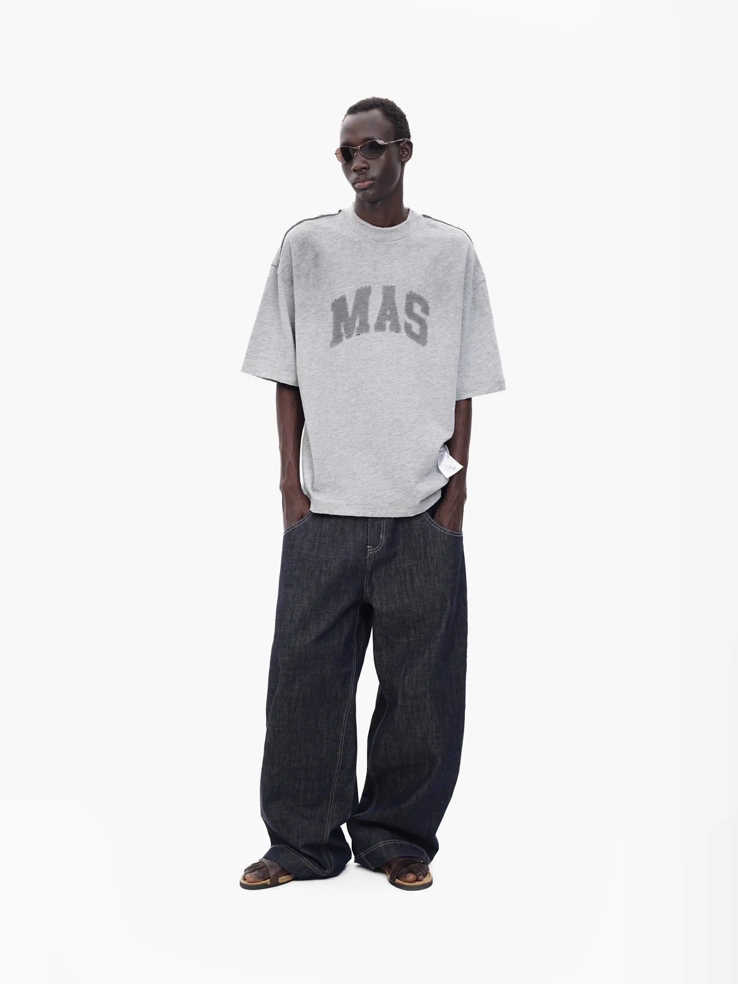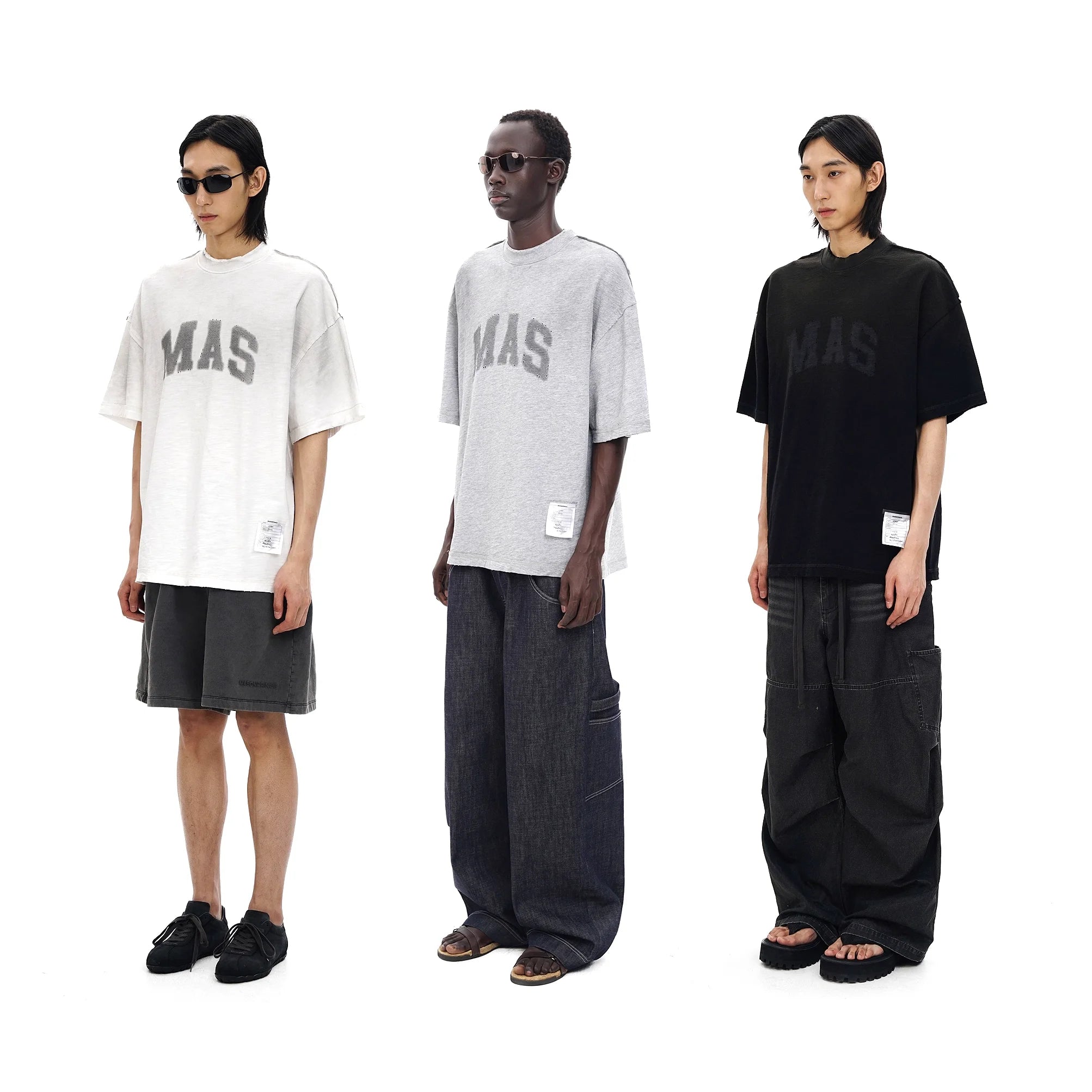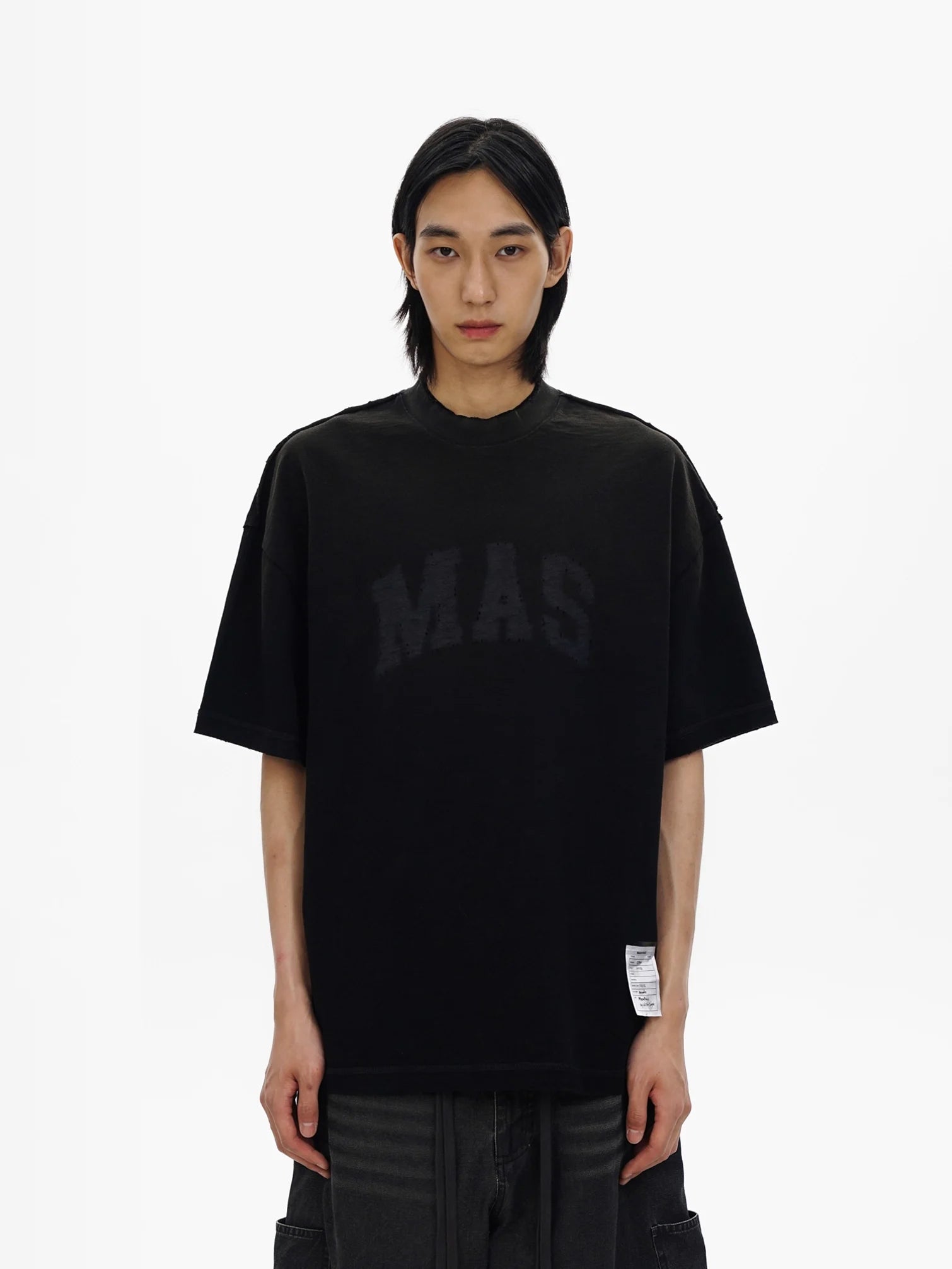 Elevate your streetwear game with this men's oversized short sleeve t-shirt, crafted from textured cotton fabric for a soft yet structured feel. The t-shirt features a bold "MAS" print across the chest, distressed and perforated details for a vintage-inspired edge, and a relaxed silhouette with dropped shoulders. Available in off-white, light gray, and black, this piece is finished with a subtle patch label above the hem for added style. Perfect for pairing with cargo pants, shorts, or wide-leg jeans to complete a modern urban look.