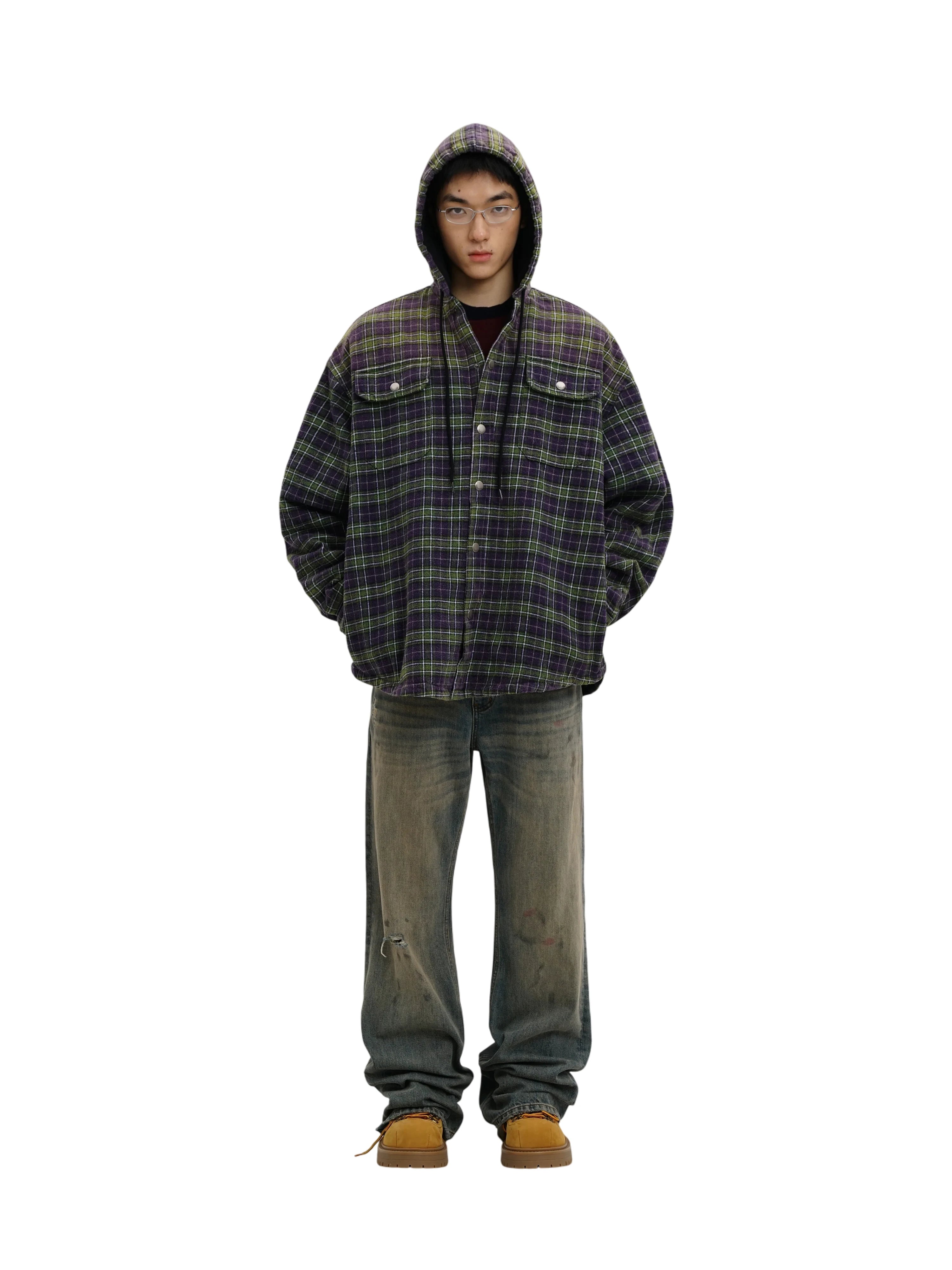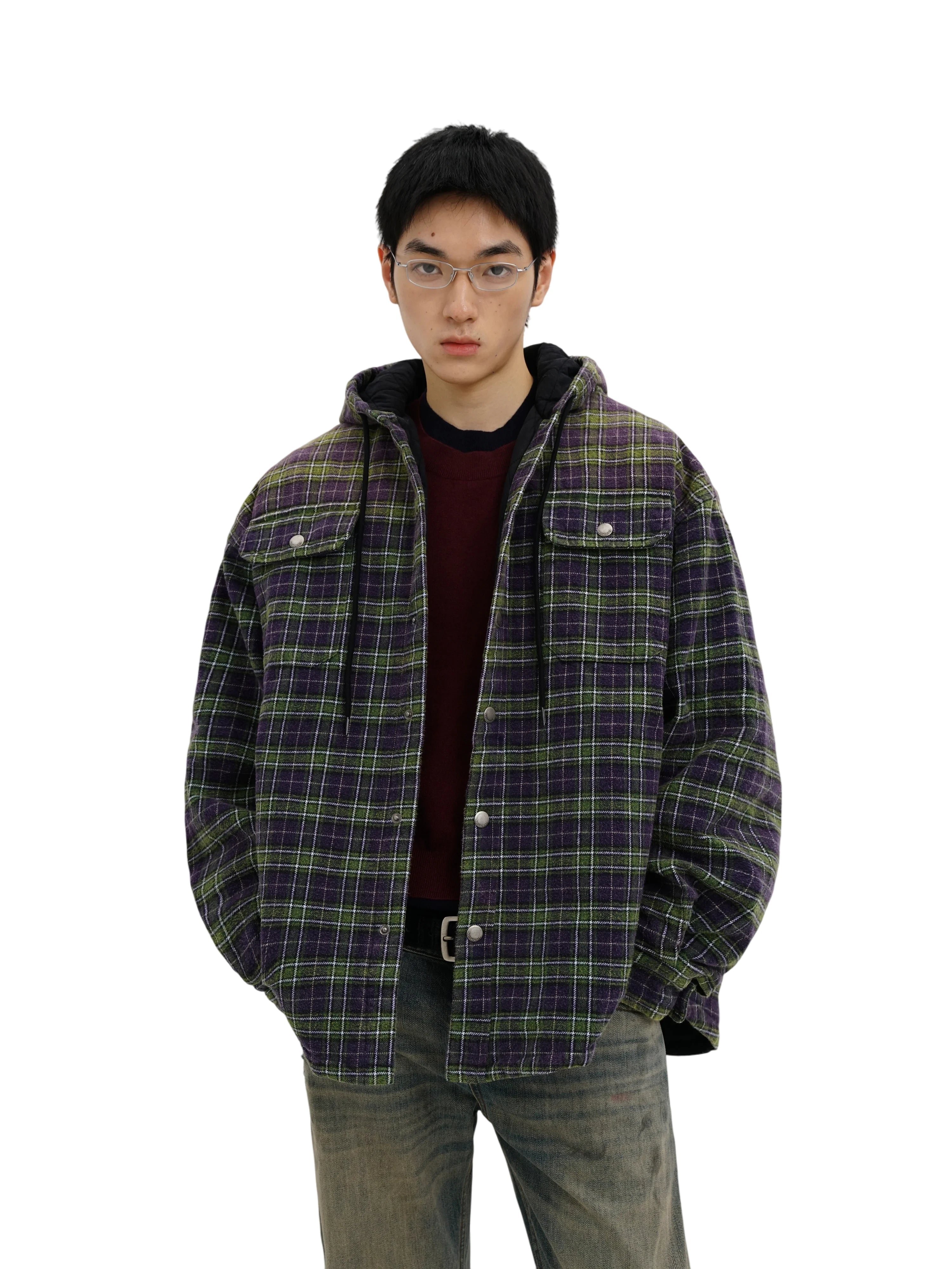 Stay warm and stylish with this men's hooded flannel shirt jacket. Designed with a quilted inner lining for added insulation, this versatile outerwear piece combines comfort and function. The eye-catching plaid pattern features a mix of green, purple, and black tones, offering a rugged yet modern look.