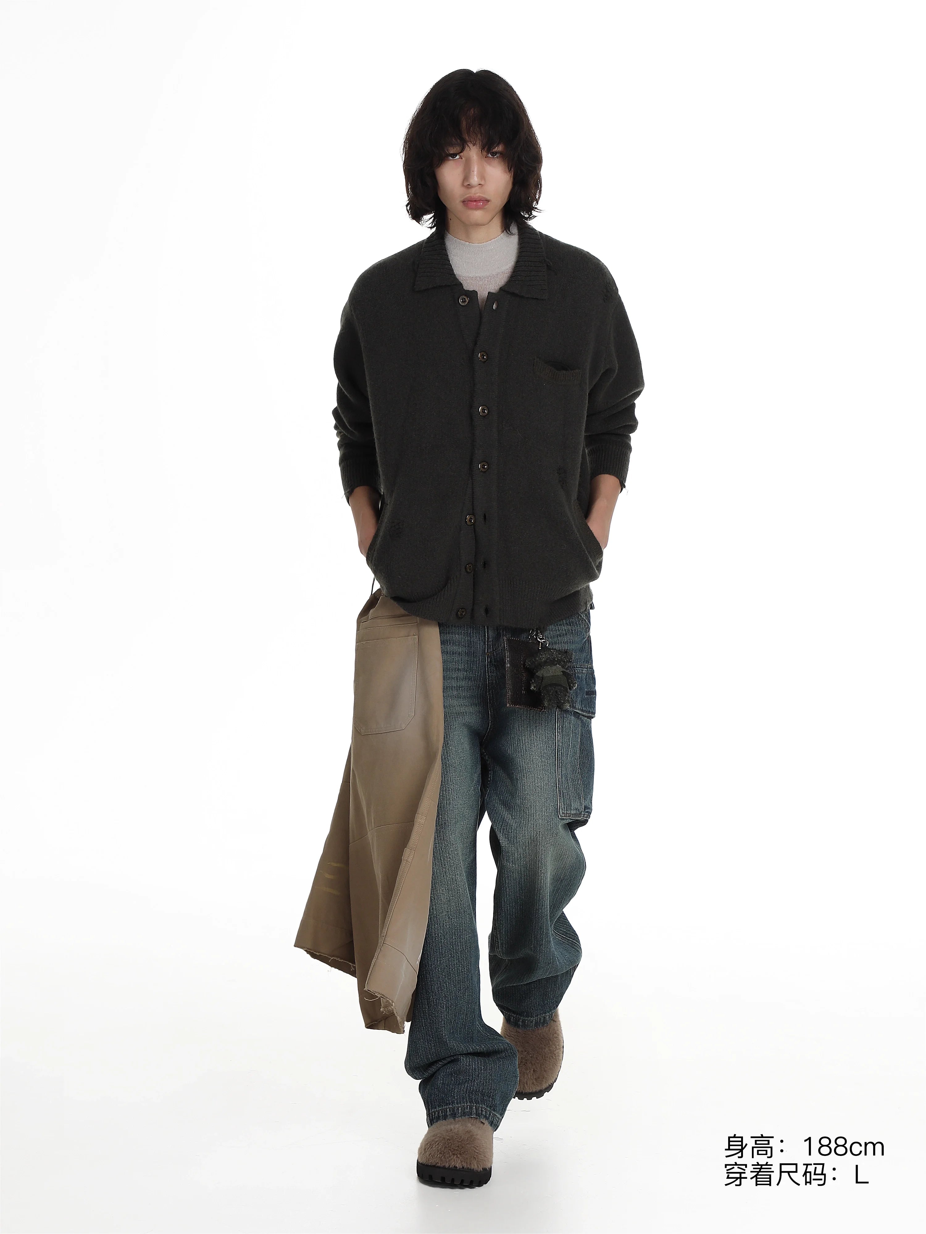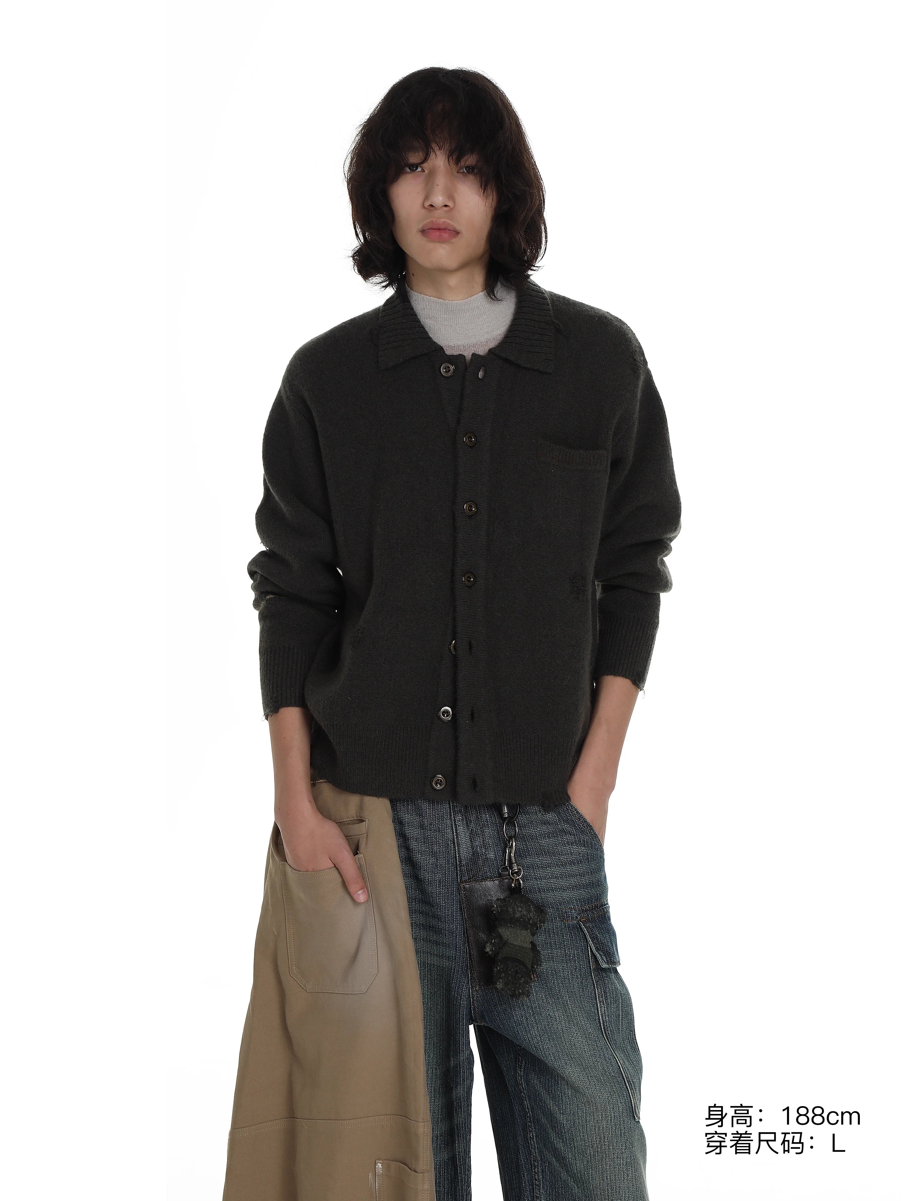 This men's wool knit cardigan features a relaxed, oversized fit with a vintage-inspired design. Crafted with subtle distressing for added character, the dark gray cardigan includes a small chest pocket and two practical side pockets. Its button-up front and textured knit make it perfect for layering over casual outfits, while the visible sleeve cuffs and soft structure enhance its comfortable style. Ideal for those seeking a blend of rugged streetwear and timeless handmade appeal.