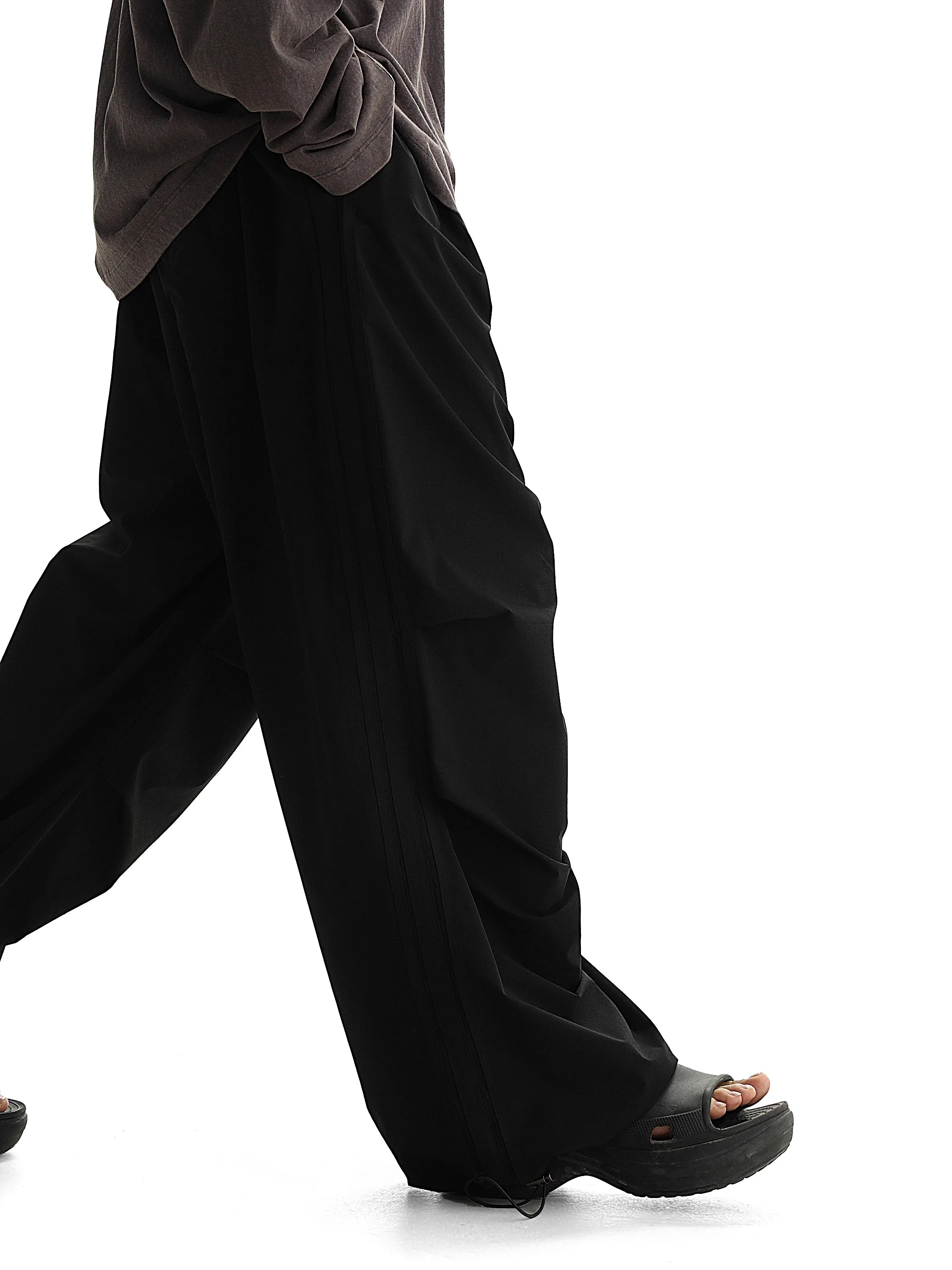 Elevate your streetwear style with these men's summer parachute pants, designed in a retro American aesthetic. These lightweight, high-waisted pants feature a loose, straight-leg silhouette with draped fabric that offers maximum comfort and breathability. Functional cargo-style pockets and visible seam detailing add versatility and a rugged edge. Perfect for casual wear, these pants pair effortlessly with oversized T-shirts and sandals for a laid-back, fashion-forward look.