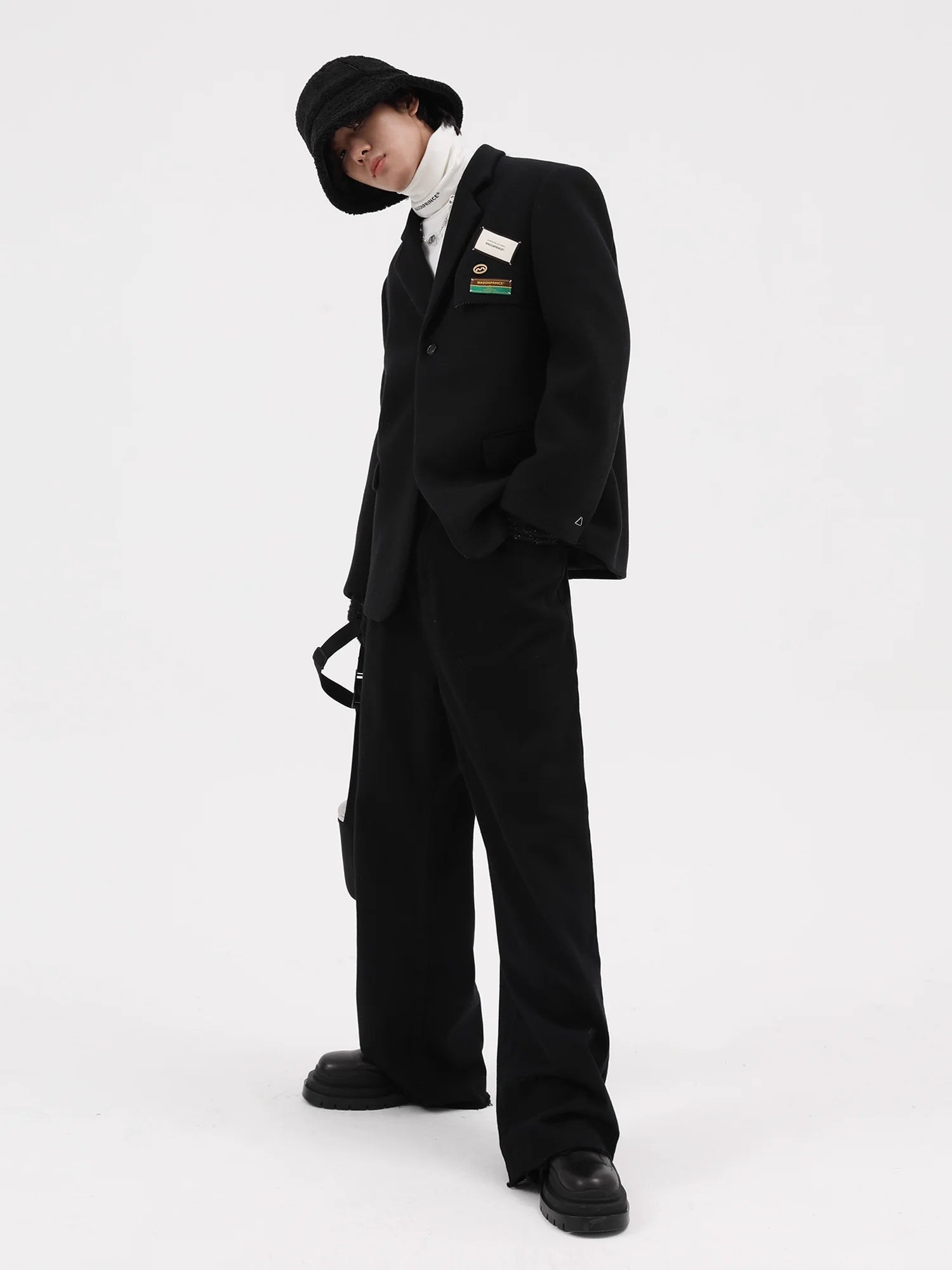 This men's retro-style blazer is designed with a structured, oversized fit ideal for spring and autumn seasons. Featuring a classic notched lapel collar and flap pockets on both sides, it combines timeless tailoring with modern flair. Decorative fabric swatches and label-style accents pinned on the chest add a creative twist, while the soft brown tone offers versatile styling options. Paired here with a white turtleneck and denim jeans, this jacket brings a magazine-inspired aesthetic to casual wardrobes.