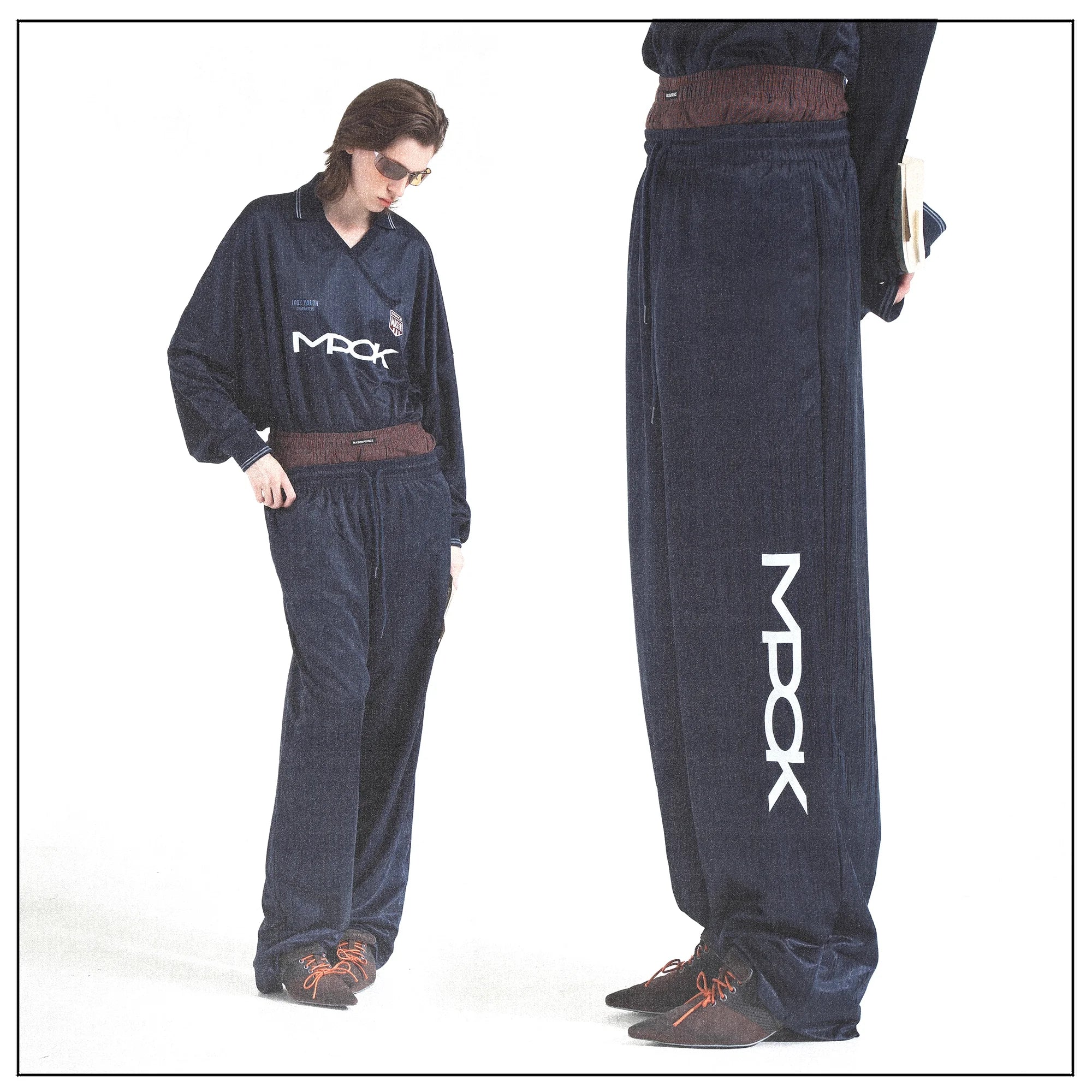 Elevate your casual look with this men's retro-inspired tracksuit set. Featuring a long-sleeved top with a classic polo collar and bold chest graphics, the outfit combines vintage flair with modern comfort. The matching wide-leg pants offer a relaxed fit with an elasticated waistband for easy wear. Coordinated branding details and a clean navy blue design add visual appeal, making this set ideal for laid-back outings or light sports activities.