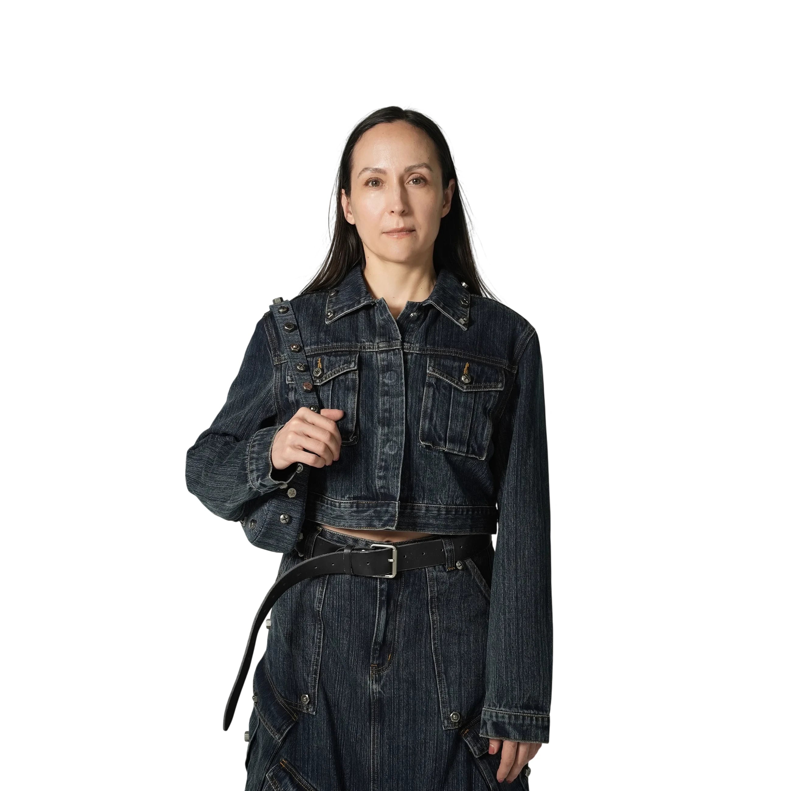 Elevate your casual style with this retro-inspired men's denim jacket. Designed in a dark slub denim, this short jacket features a structured silhouette with buttoned chest pockets, a pointed collar, and metal detailing for an edgy, modern feel. Perfect for layering in autumn, it's an ideal choice for fashion-forward looks or coordinated couple outfits.