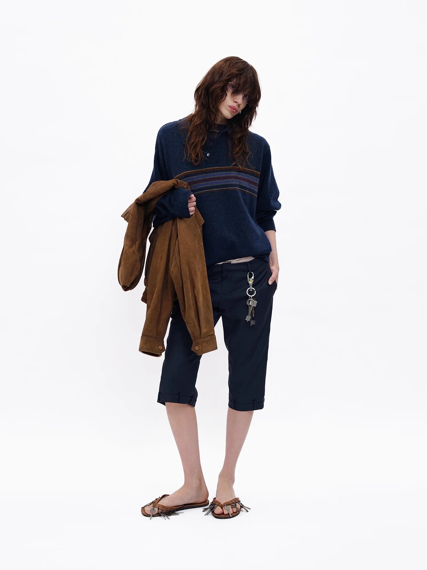 Elevate your fall wardrobe with this men's retro-inspired wool sweater. Featuring a classic navy blue color, this long-sleeve pullover showcases a henley collar with button placket for timeless appeal. A series of multi-colored horizontal stripes in brown, mustard, and blue span the chest, adding vintage charm. The sweater also includes an embroidered "M" insignia on the upper left chest. Designed with a relaxed fit, it's perfect for layering in cooler weather.