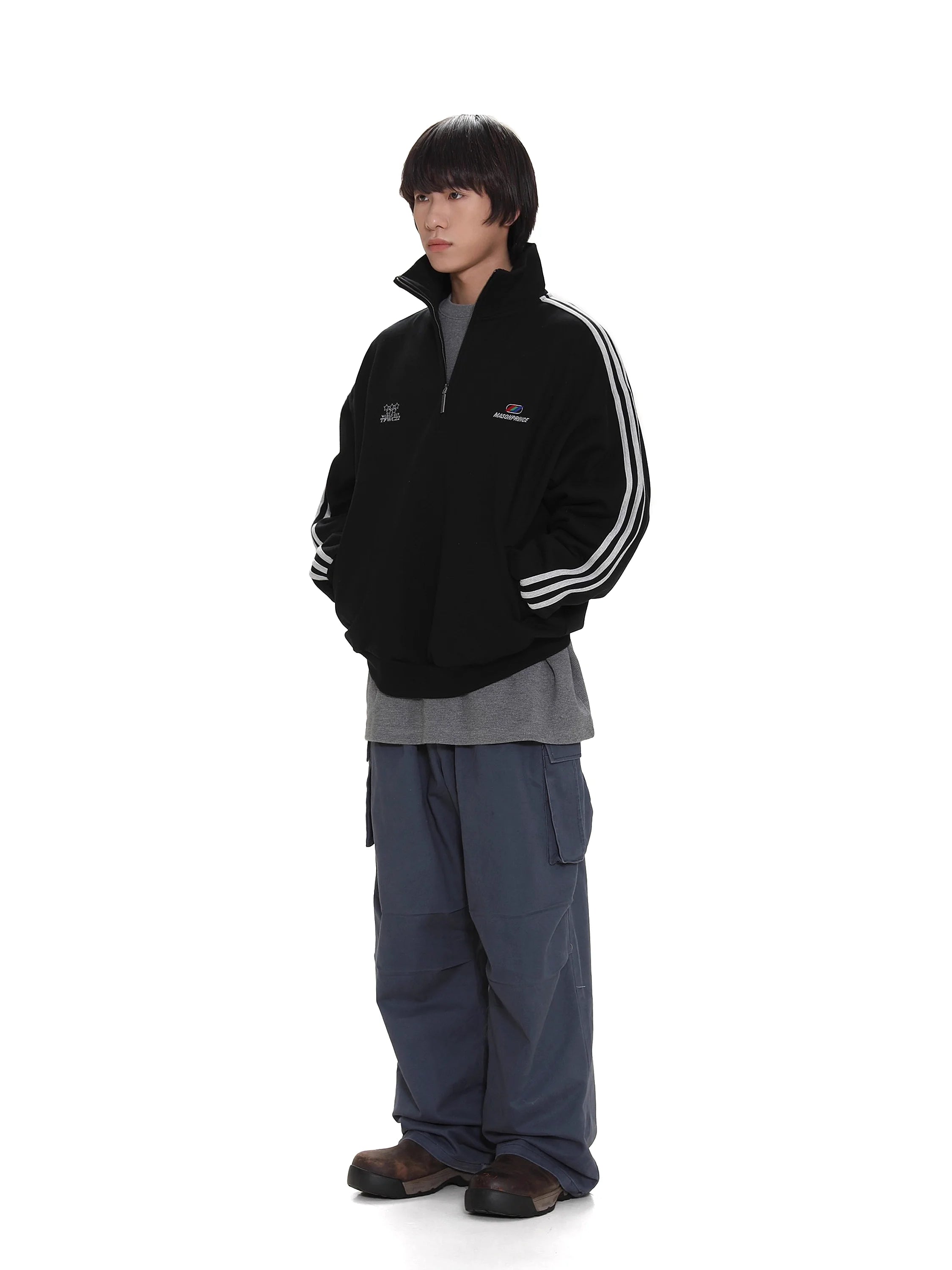 Stay effortlessly stylish in this men's casual pullover sweatshirt, designed with a modern stand collar and a functional half-zip front. Perfect for spring and autumn, this loose fit top features bold black stripes running down each sleeve and multiple embroidered graphic accents on the chest for a streetwear-inspired look. Pair it with your favorite trousers or cargo pants for an easygoing, comfortable outfit.