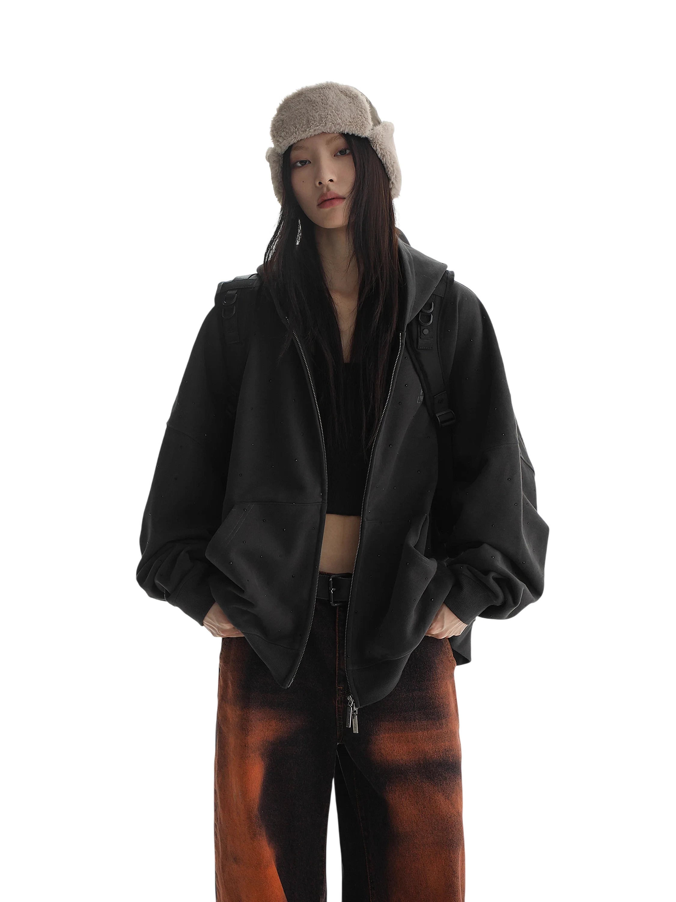 The hoodie showcases a full-front zipper, ribbed cuffs and hem, a streamlined drawstring-free hood, and two front pouch pockets. The matching sweatpants provide an elastic waistband with an internal drawstring for a secure fit and unrestricted movement. Subtle rhinestone embellishments and minimalist detailing add a touch of refined edge to this sporty yet understated set.