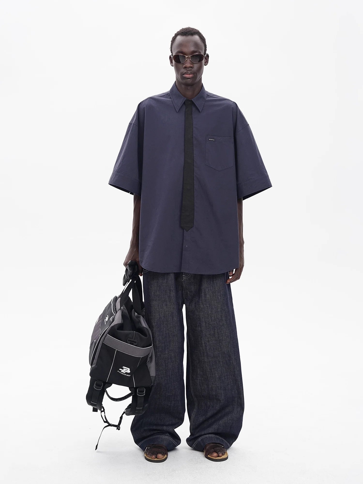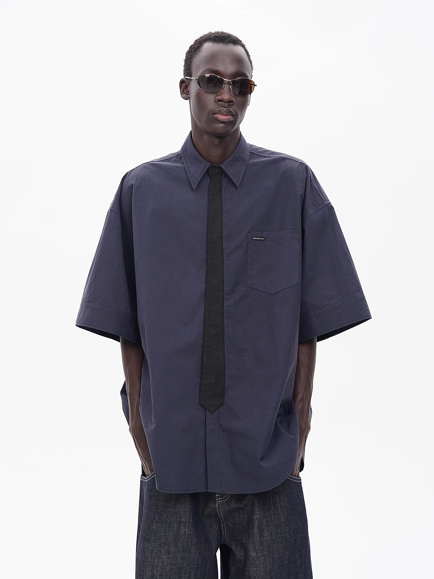 Elevate your streetwear style with this men's two-in-one short-sleeve button-up shirt, crafted from 100% cotton for all-day comfort. Designed with a loose fit and a modern urban flair, the shirt features a pointed collar, single chest pocket, and a sleek black tie for a polished contrast. Pair it effortlessly with wide-leg denim or casual trousers for a bold, fashion-forward look.