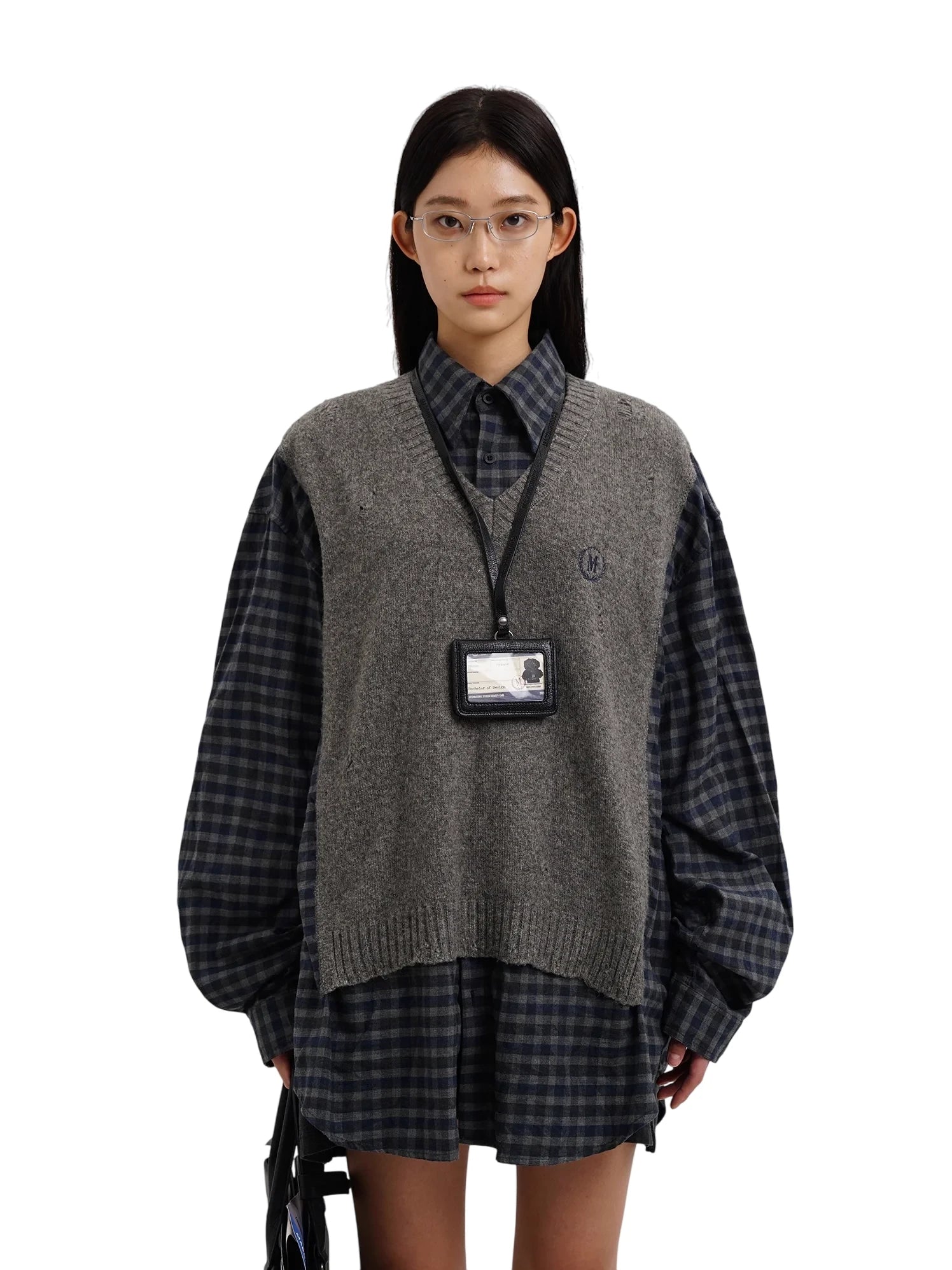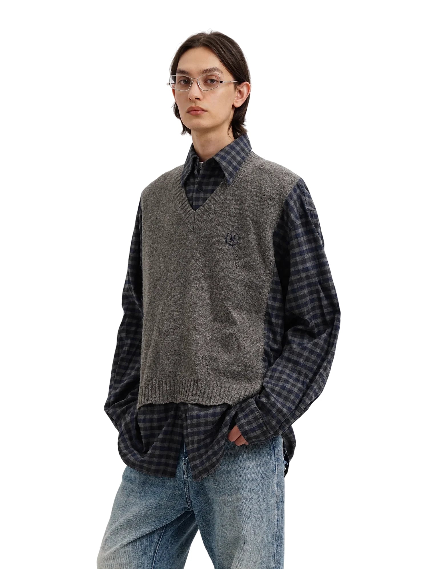 Elevate your casual style with this men's two-piece outfit set, featuring a classic gray sleeveless V-neck sweater vest layered over an oversized navy and black plaid dress shirt. The vest includes a subtle embroidered chest logo, adding a refined touch to the relaxed silhouette. The long-sleeve shirt is designed with an elongated fit, offering a trendy layered effect perfect for effortless everyday looks. Pair this versatile set with denim for a smart yet casual outfit.