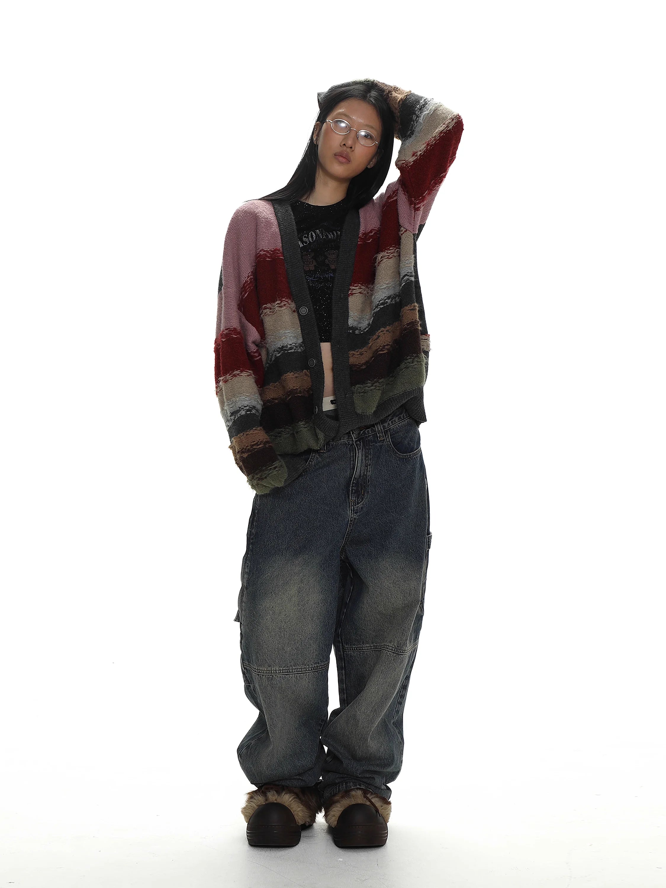 This unisex cardigan features a vibrant jacquard knit design with horizontal stripes in muted tones of pink, red, cream, navy blue, olive green, and brown. Designed with a deep V-neckline, the cardigan includes a grey button placket and coordinating ribbed cuffs and hem. Its textured knit offers a cozy look perfect for casual layering.