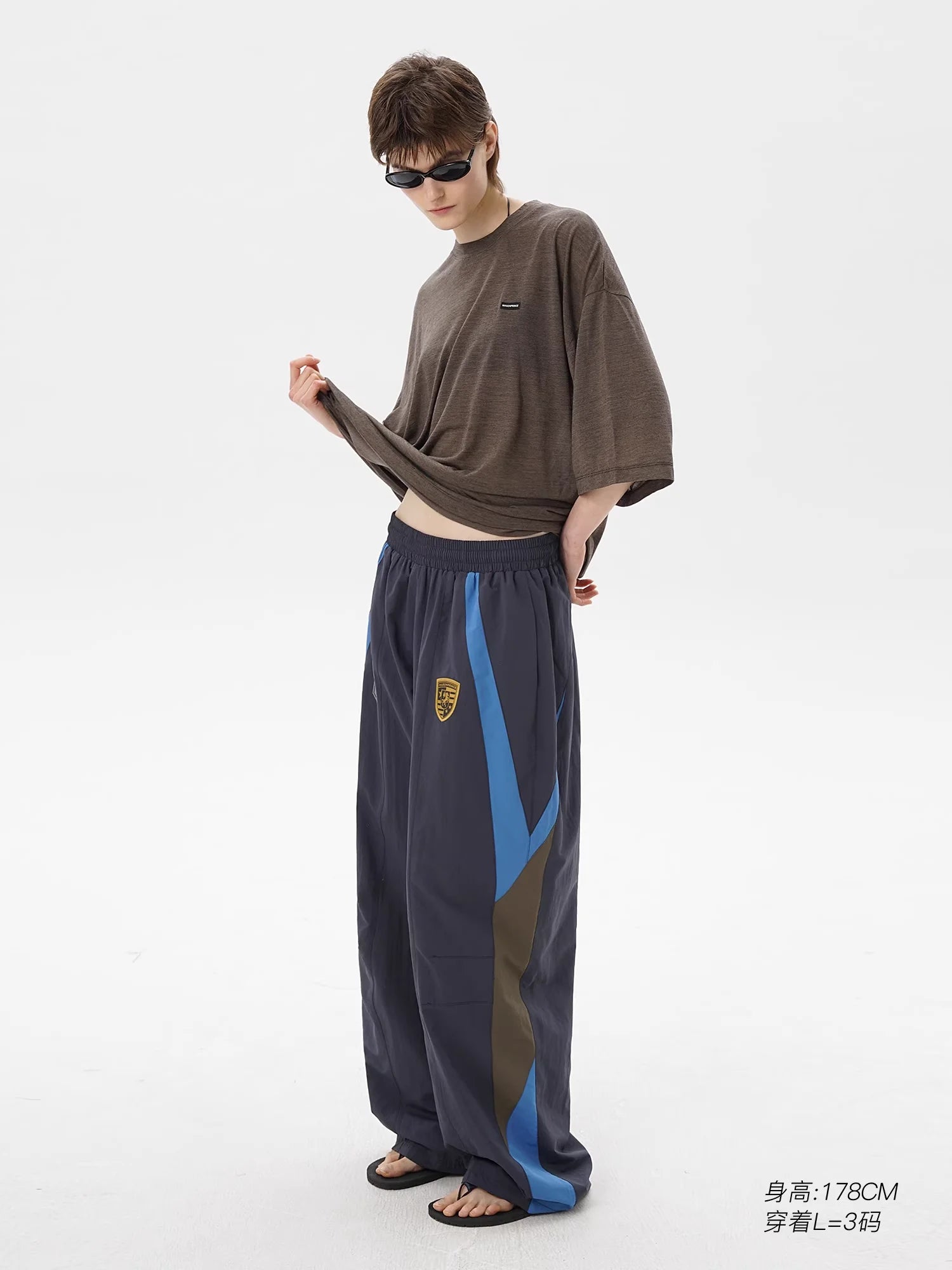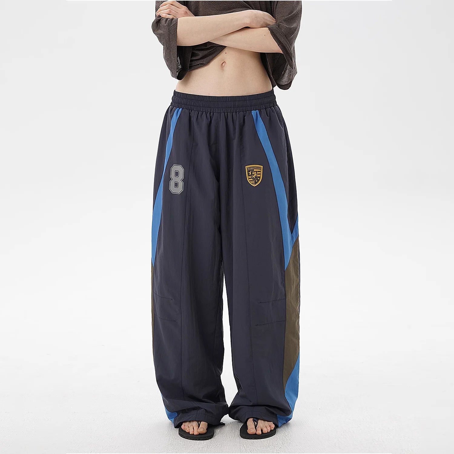 Elevate your sporty style with these No. 8 badge wide-leg track pants, designed for women or unisex wear. Featuring a bold oversized silhouette, these lightweight pants are crafted from synthetic fabric with a crinkled texture for breathable comfort. The elastic waistband ensures an adjustable fit, while contrasting navy, blue, and olive green panels add a dynamic edge. Accented with a prominent printed “8” and athletic-style shield emblem on the front thighs, they embody a modern, athletic aesthetic.