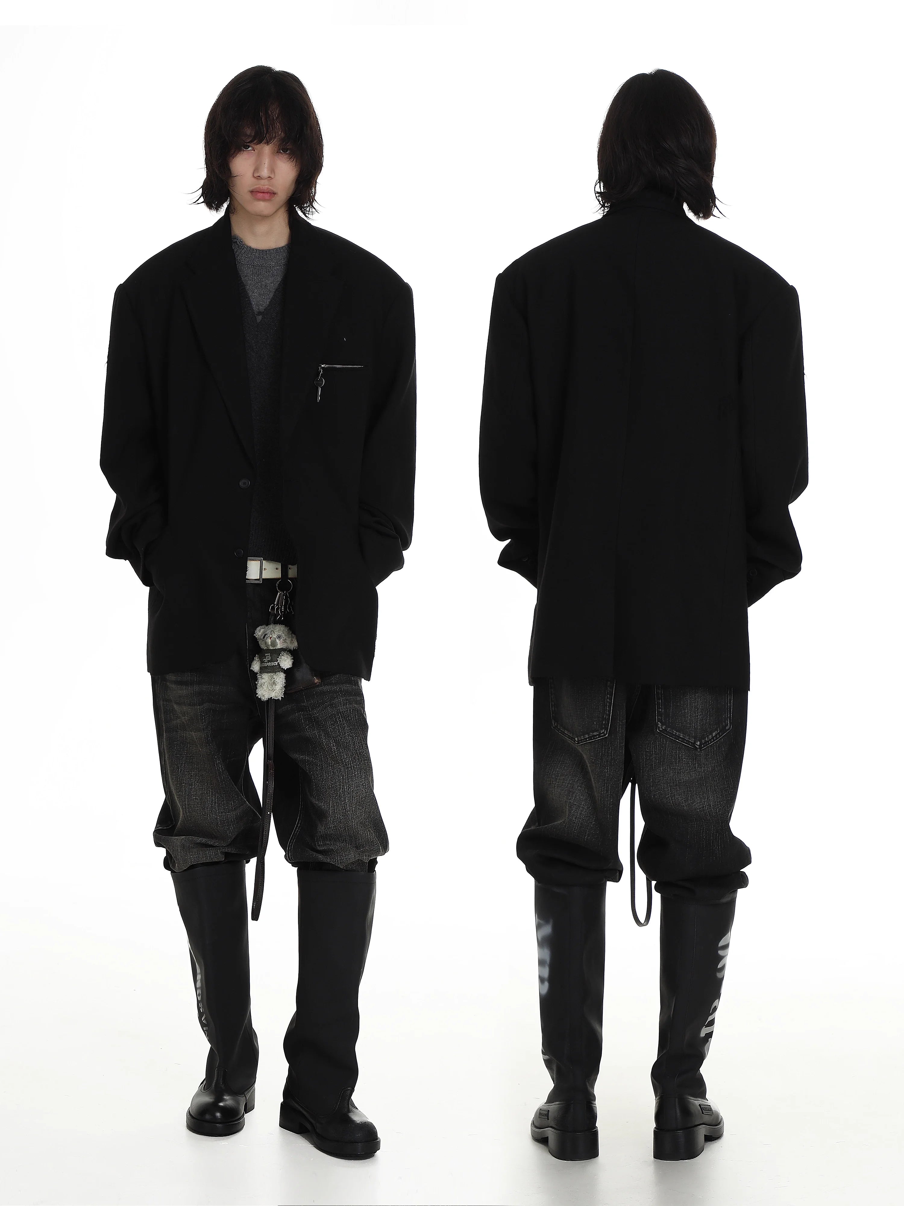 This men's oversized suit jacket is crafted from premium merino wool, offering a relaxed and structured silhouette with broad shoulders. Featuring a classic notched lapel and a single-breasted button front, it delivers a modern twist on traditional tailoring. Styled here with layered monochrome pieces and distressed jeans, it suits fashion-forward, streetwear-inspired looks.