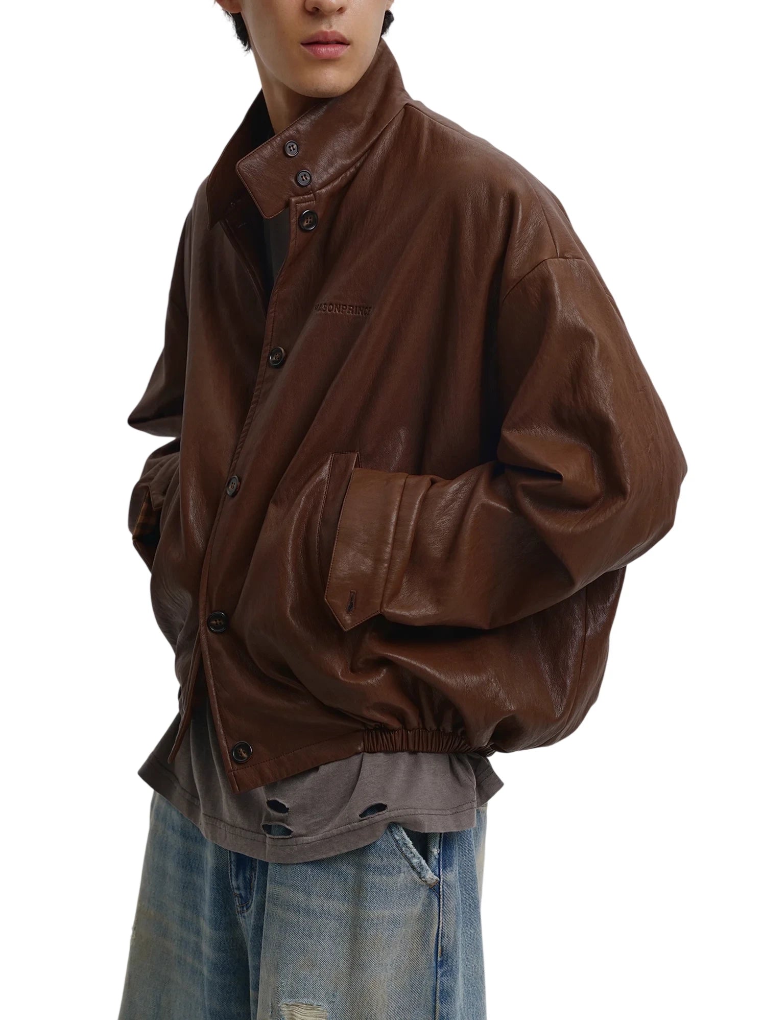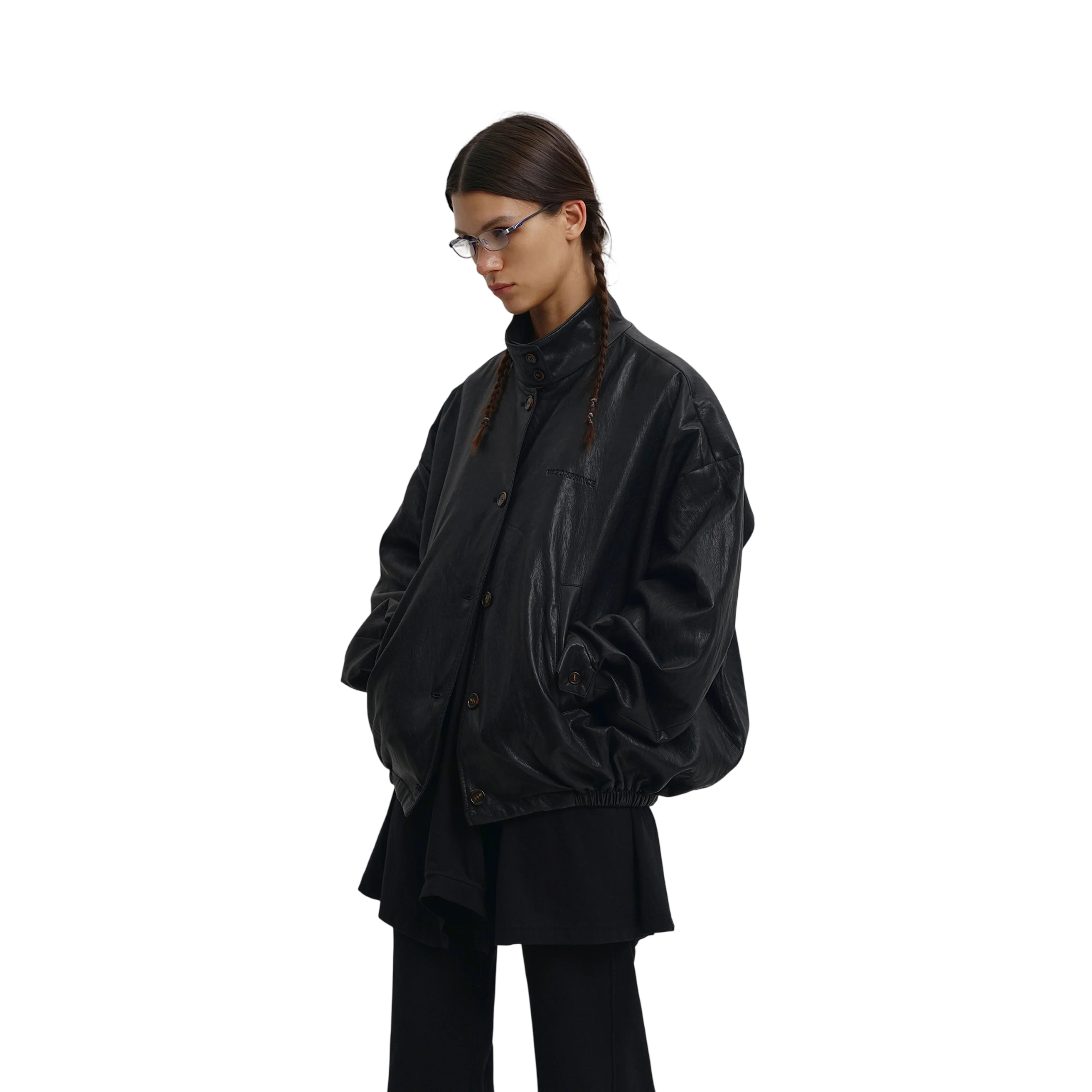 Embrace vintage style with this oversized retro plaid Harrington jacket. Crafted from faux leather for a sleek yet durable look, it features classic plaid detailing and a relaxed silhouette that adds a nostalgic flair to your wardrobe. Designed with a high button-up collar, front button closures, and elasticized cuffs and hem for structure and comfort. Perfect for layering during crisp autumn days, this unisex jacket pairs effortlessly with casual or streetwear ensembles.