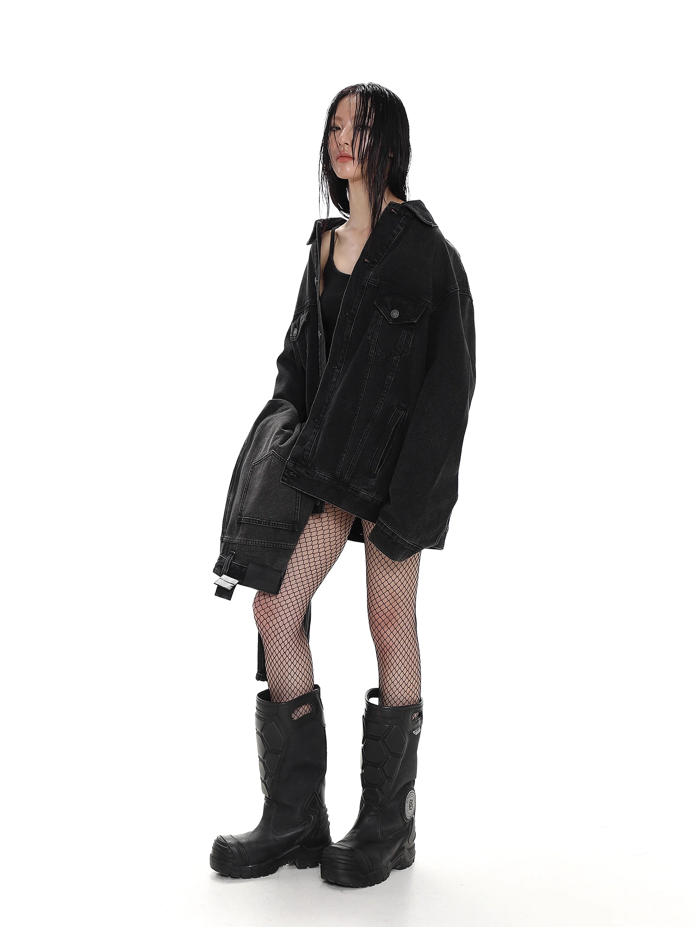This women's oversized black denim jacket features a softened washed finish and bold reverse hem detailing for a modern edge. Designed with classic flap chest pockets and pronounced stitching, this jacket blends streetwear with an alternative fashion aesthetic. Its structured lapel and roomy silhouette make it a stylish layering piece for cooler seasons.