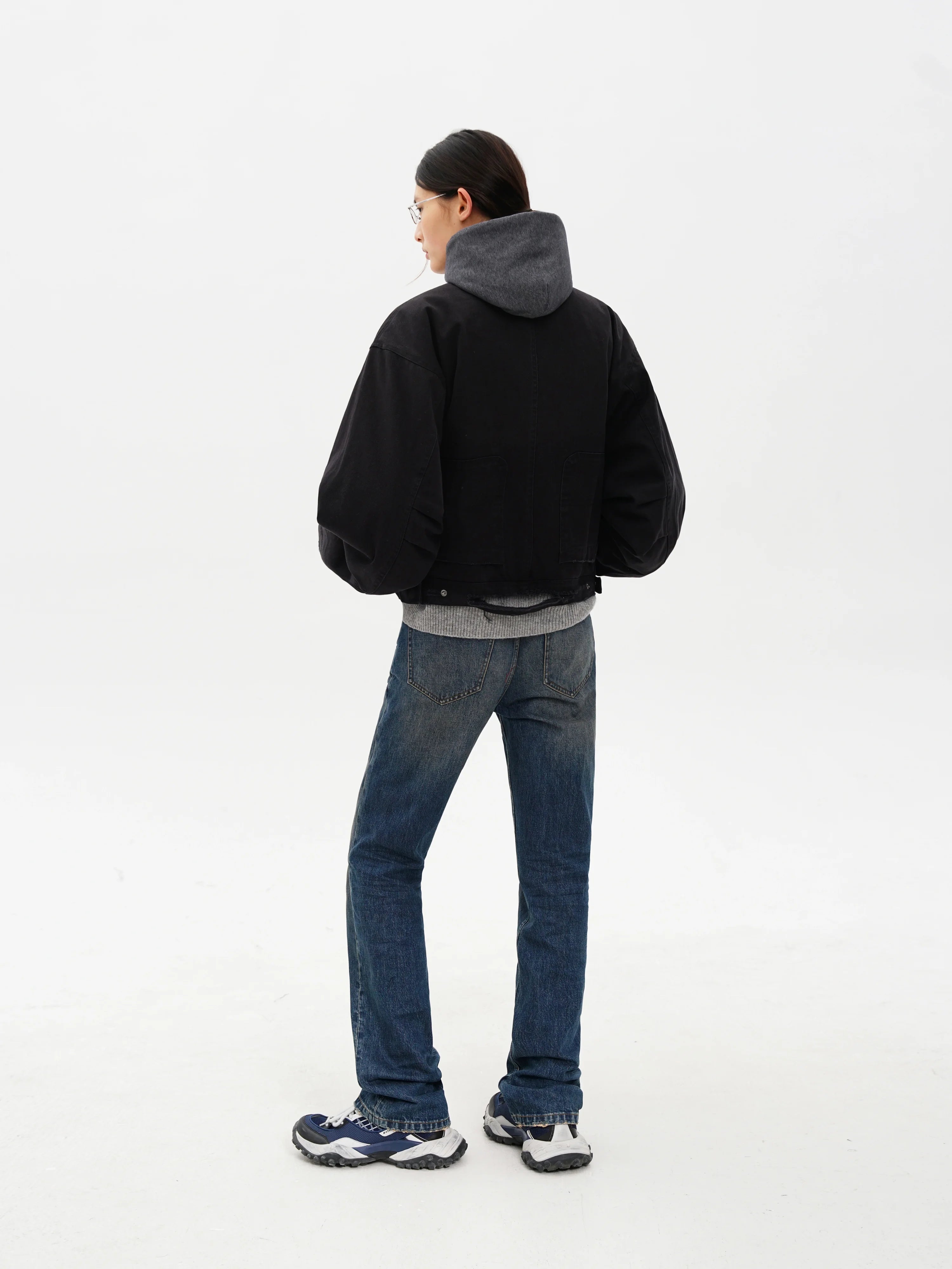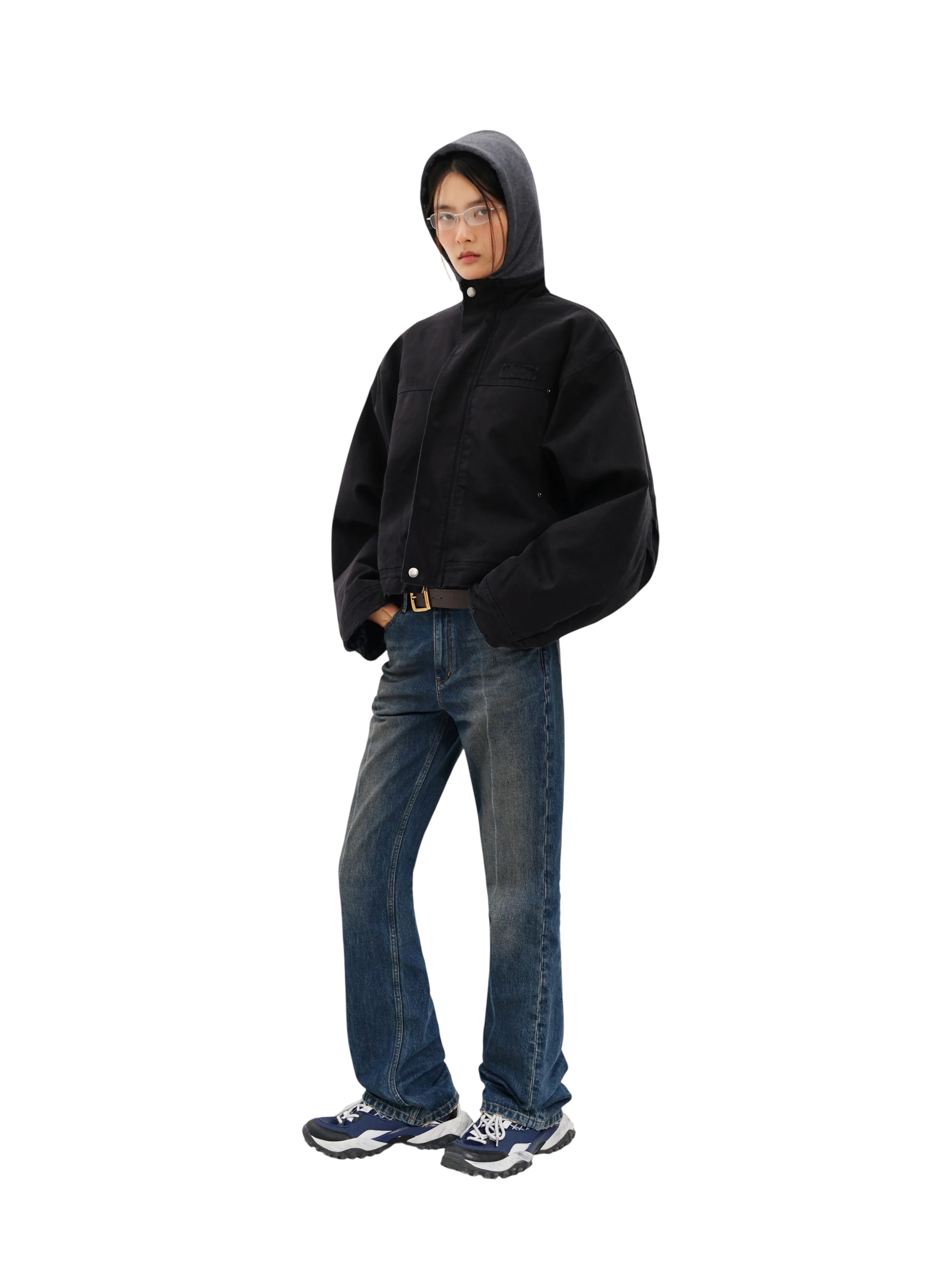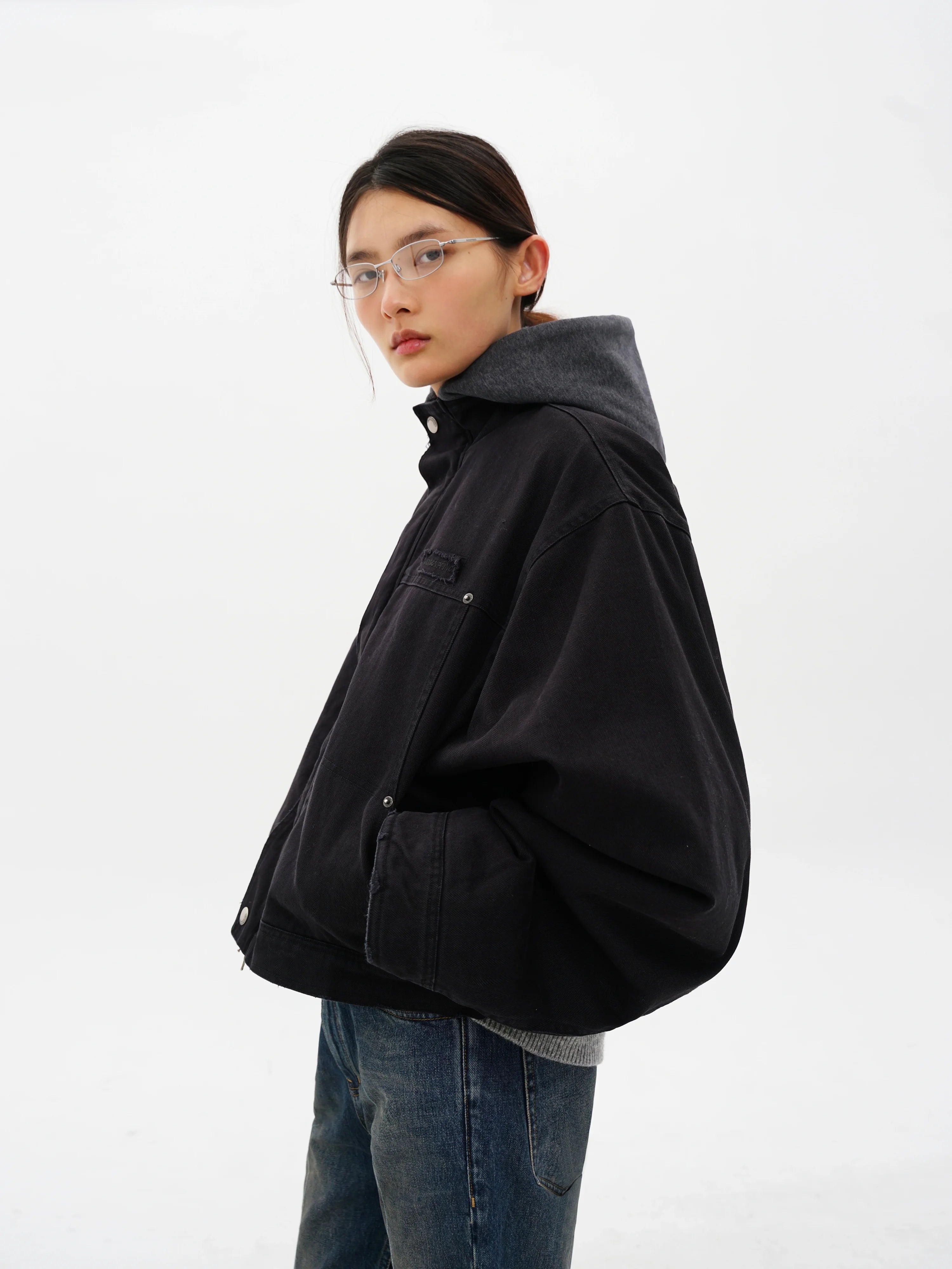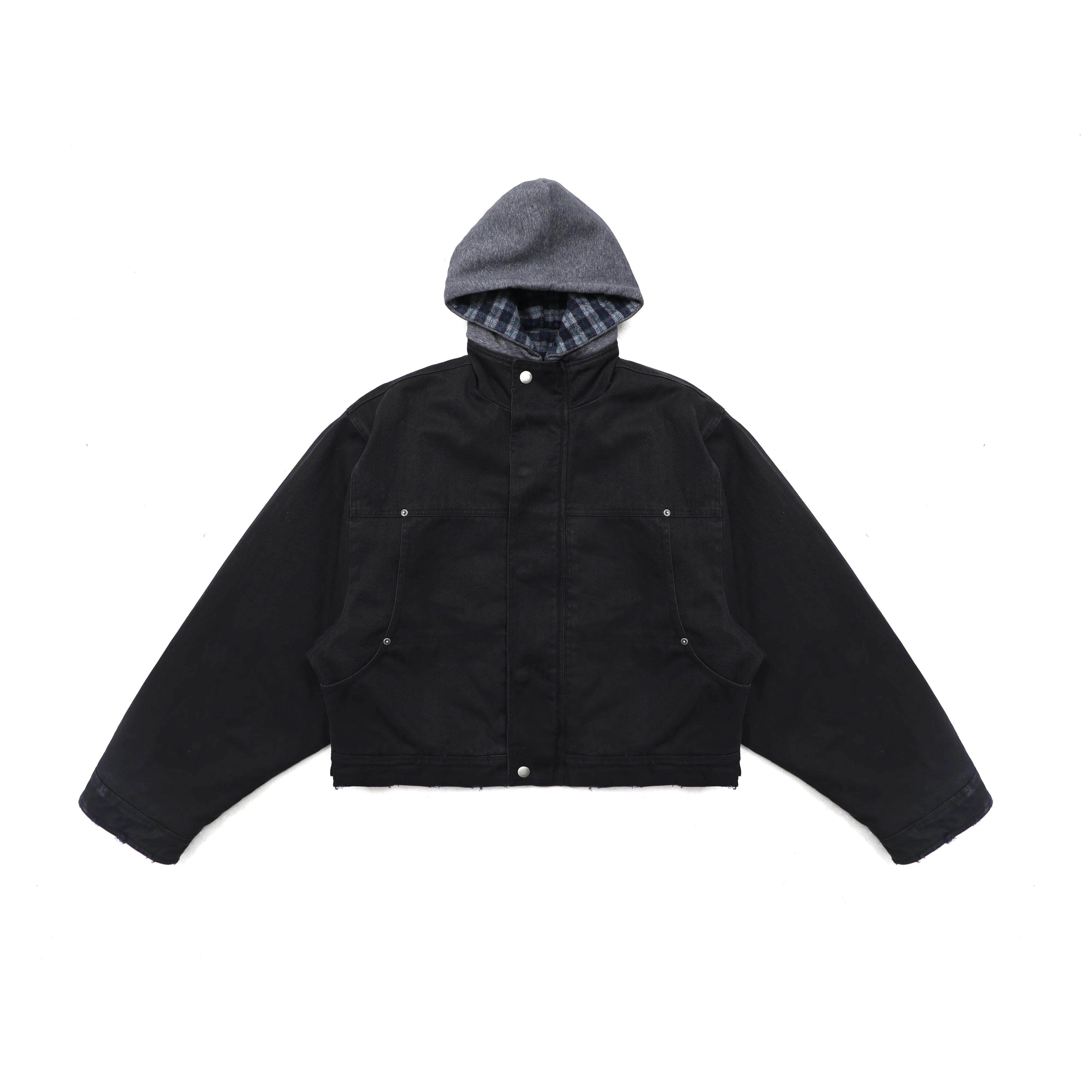 Designed for women, this cropped black denim jacket features a boxy silhouette with oversized sleeves for a structured, modern fit. A contrasting grey hood, lined with blue-and-black plaid fabric, adds layered texture and visual interest. The jacket includes two front pockets with silver snap closures and a full snap-button front. A slightly frayed hem completes the look with an edgy, street-style vibe.