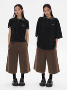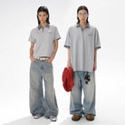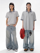 Designed with a subtle chest graphic, the polo combines classic elements with contemporary oversized proportions. The female and male models each showcase the unisex versatility of the garment, pairing it with wide-leg distressed jeans for a bold, expressive look.