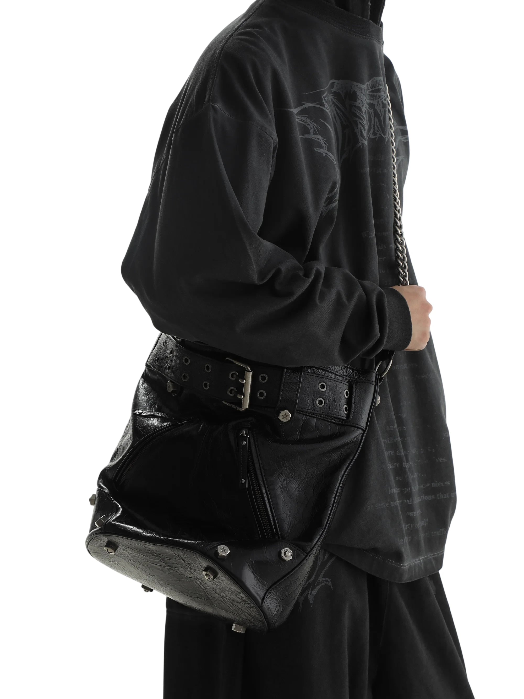 Make a bold statement with this premium motorcycle-style crossbody bag, designed for those who embrace edgy, streetwear fashion. Crafted from black leather with metallic accents and an attached belt detail, this large crossbody bag brings an industrial flair to any outfit.