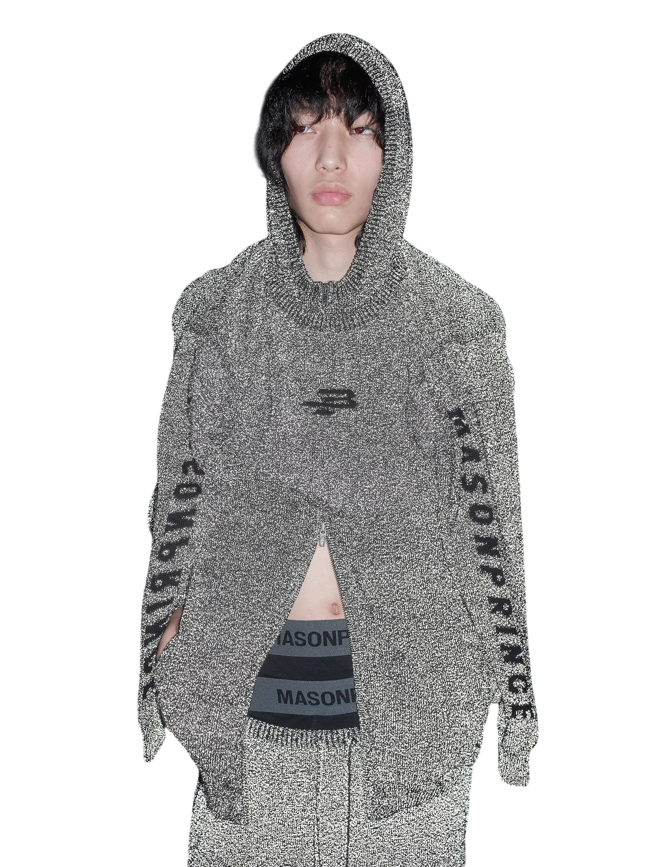 This coordinated knitwear set includes a speckled grey and black hooded sweater paired with matching pants, designed for both comfort and high-street style. The oversized hoodie features bold text detailing along the sleeves and an asymmetrical front slit that adds an avant-garde edge. Also included is a windproof face mask, completing the modern, urban aesthetic. Worn here by a male model, the ensemble delivers functionality and distinct fashion flair.