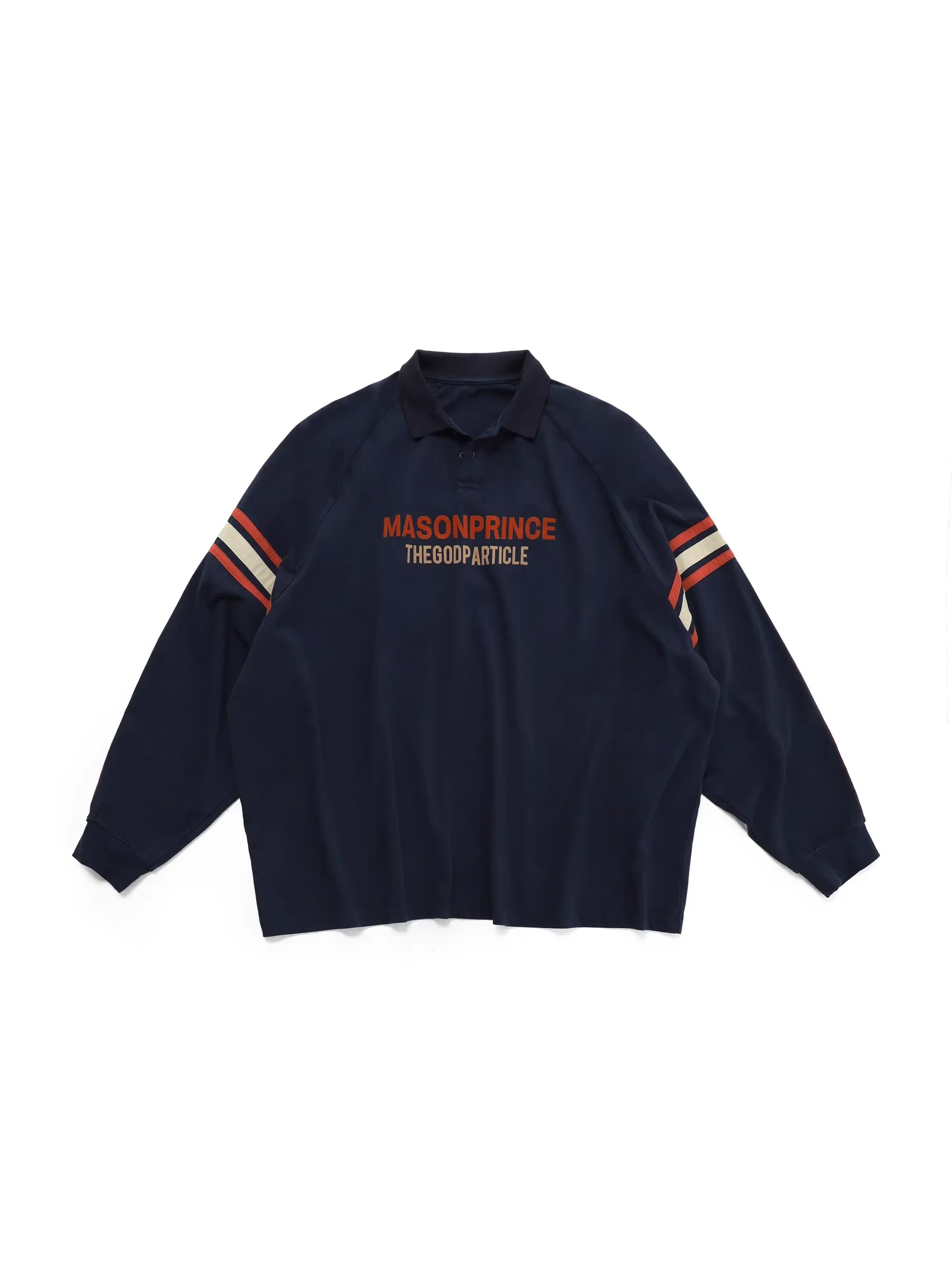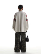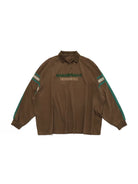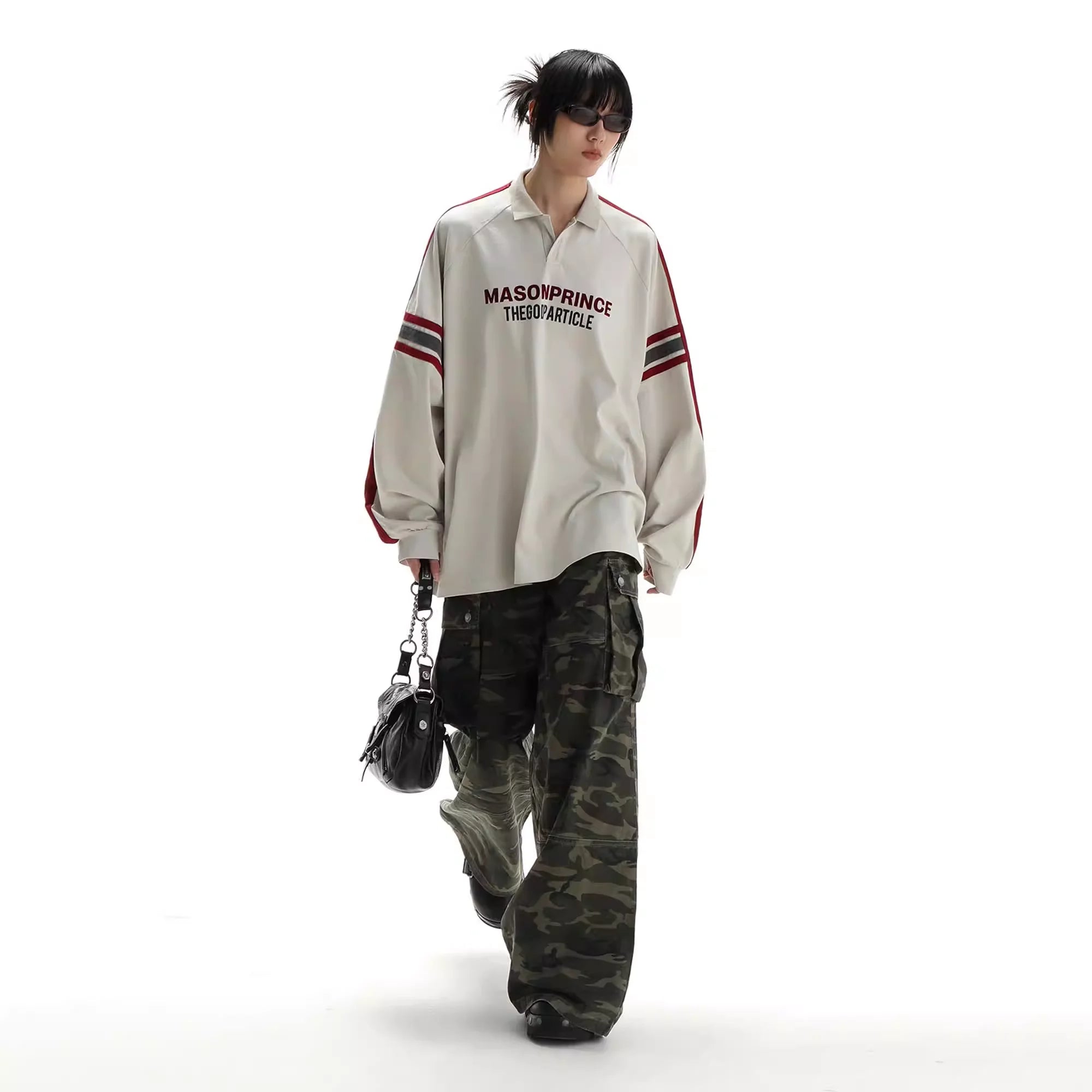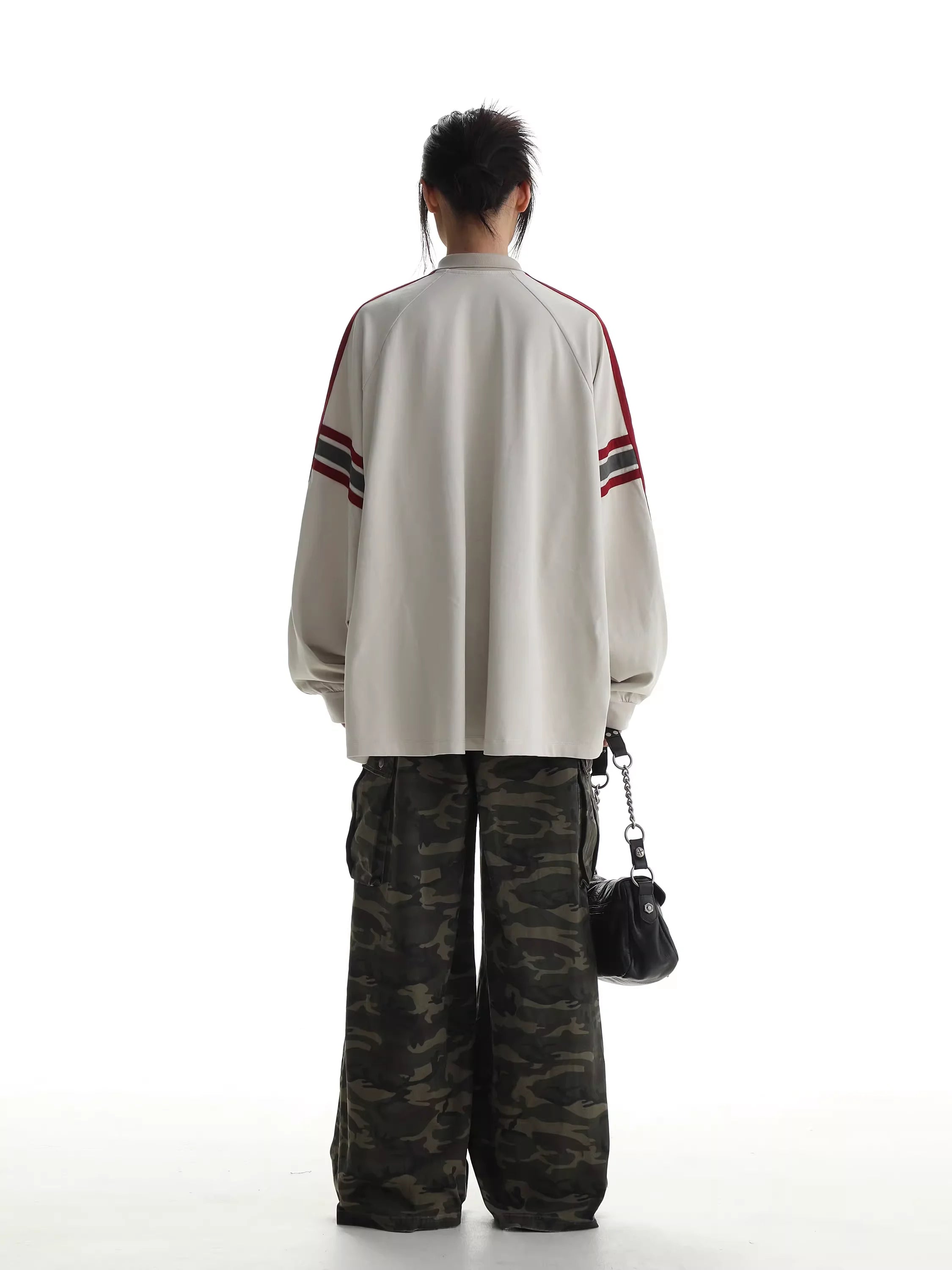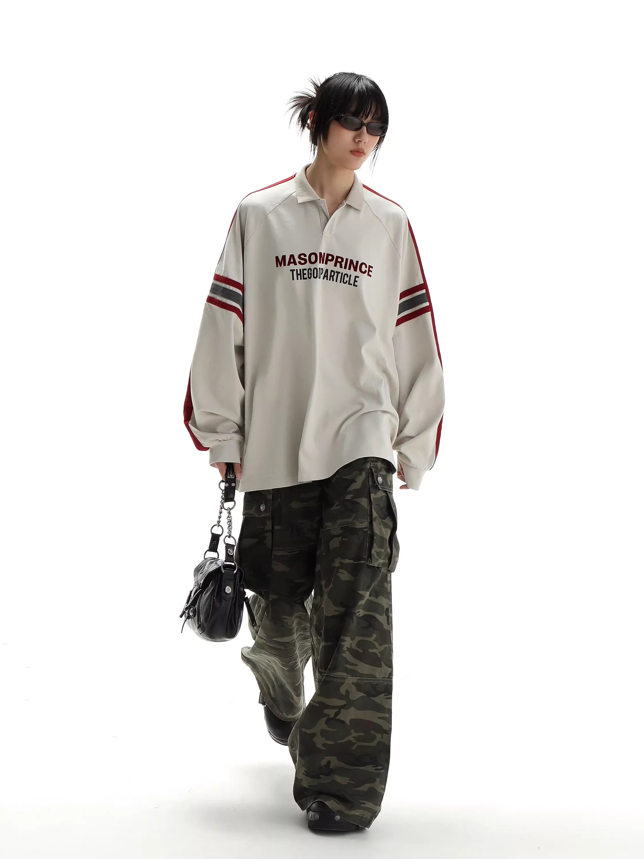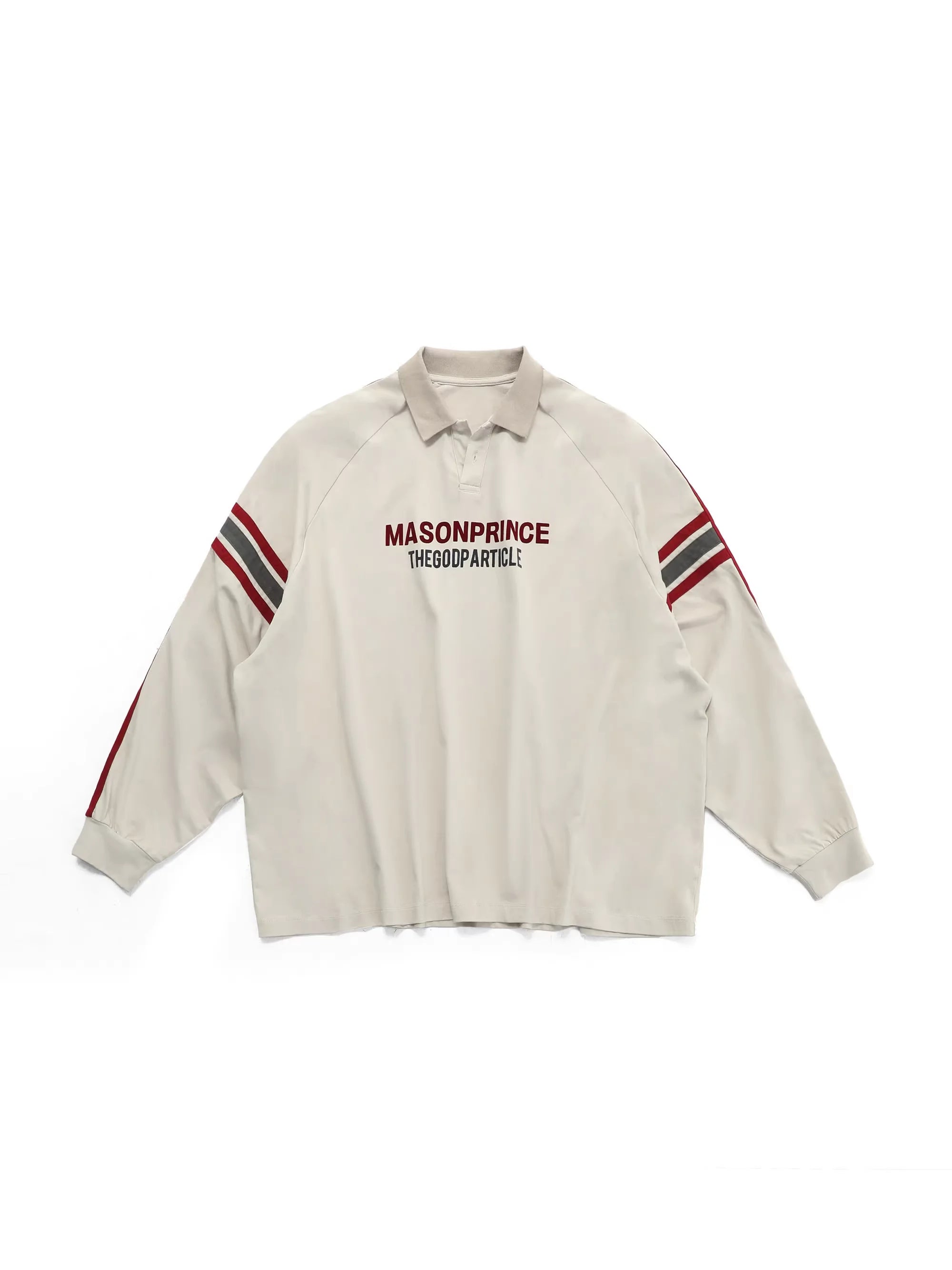 Elevate your fall and winter streetwear with this stylish unisex long sleeve polo shirt. Designed with a relaxed fit for comfort and versatility, the shirt features bold red stripes along the sleeves and a striking front graphic that adds a modern, sporty edge. The oversized silhouette makes it perfect for layering, while the off-white colorway ensures easy pairing with seasonal staples like cargo pants or denim.