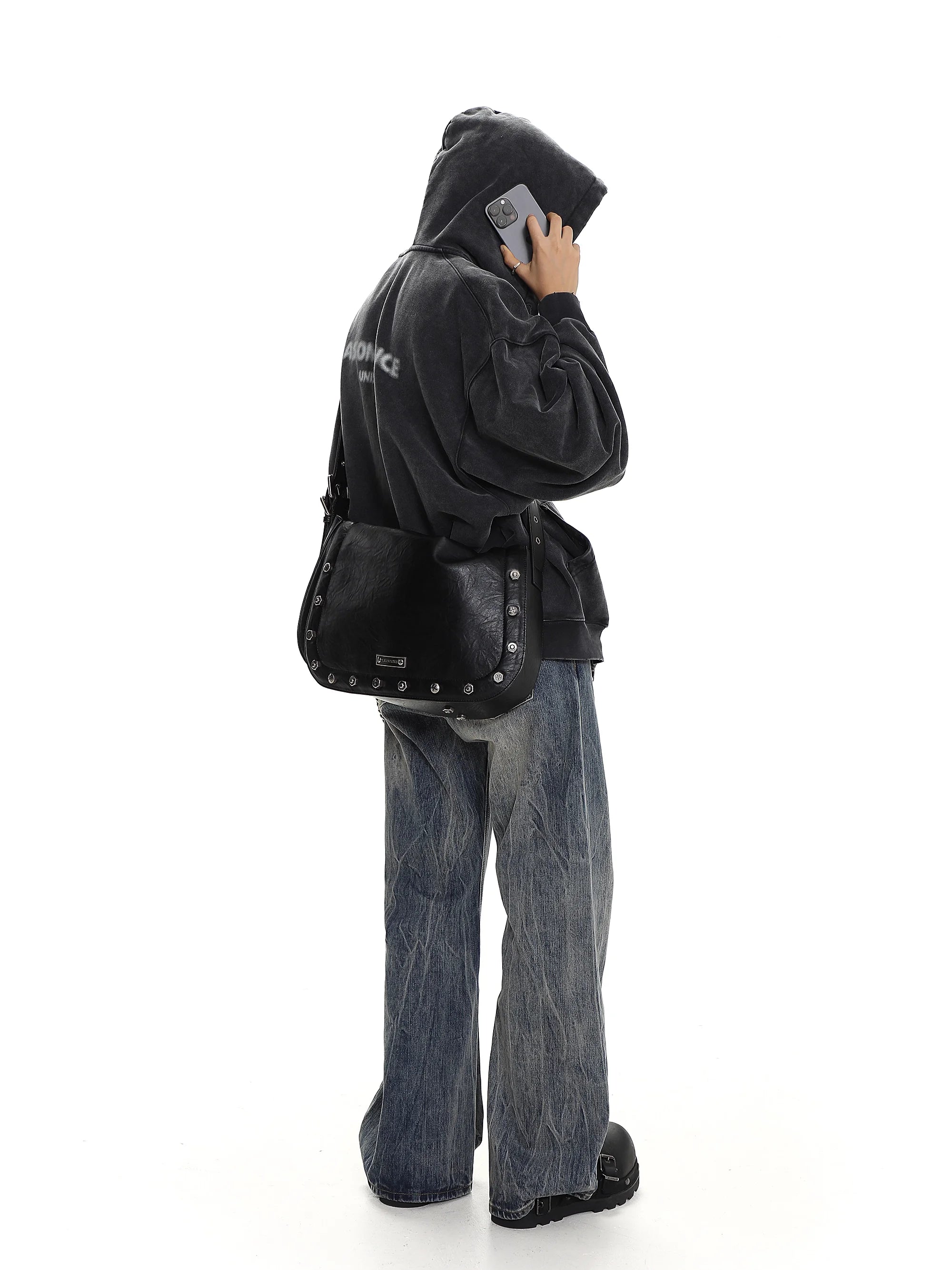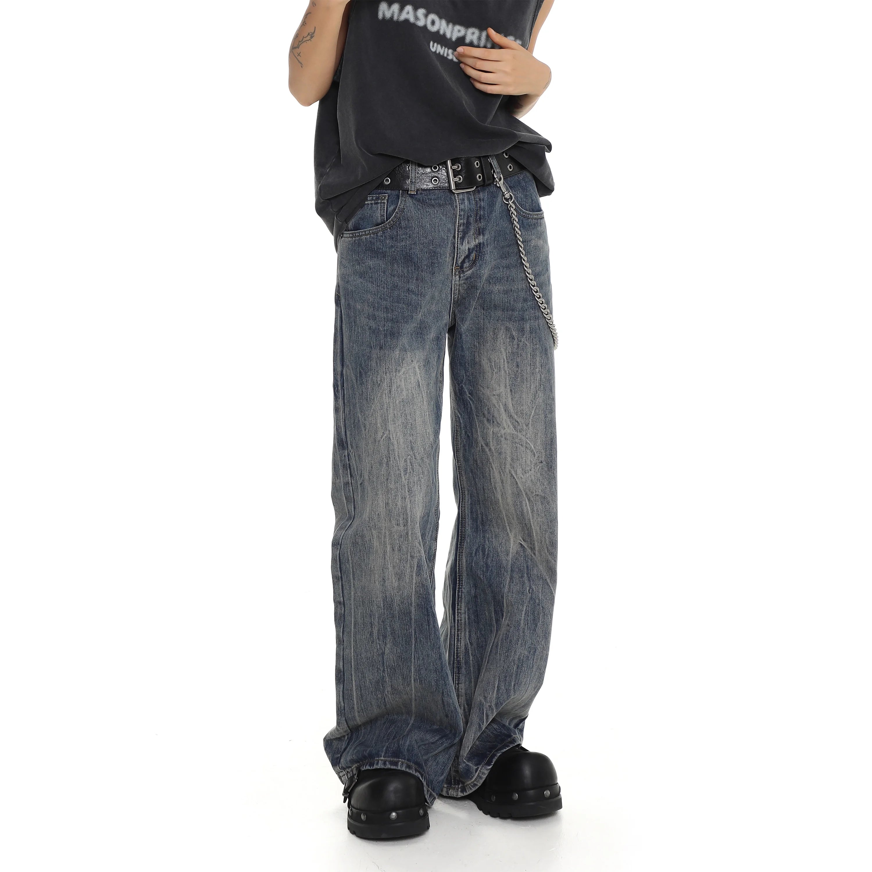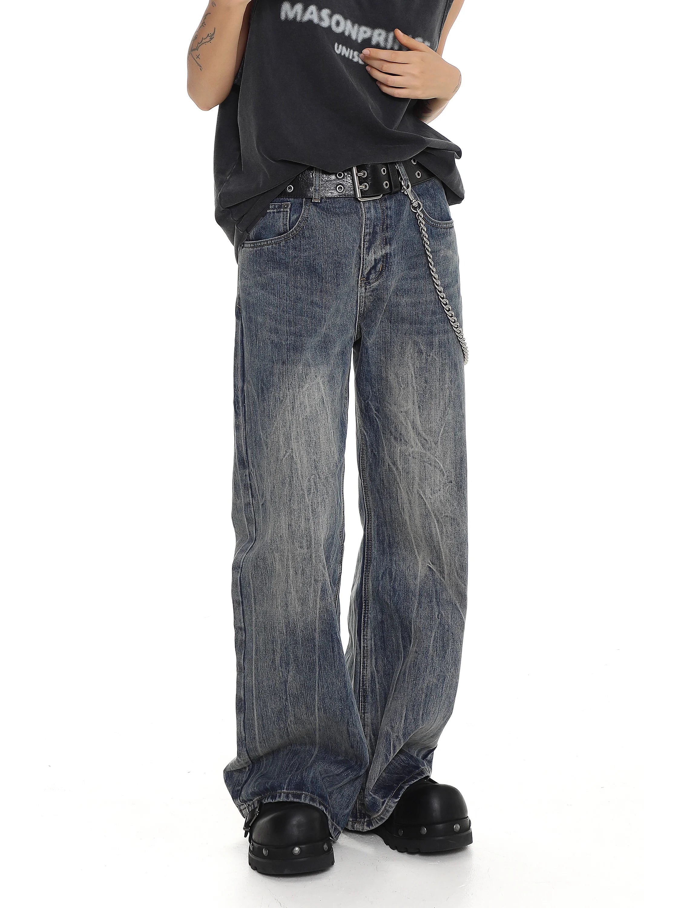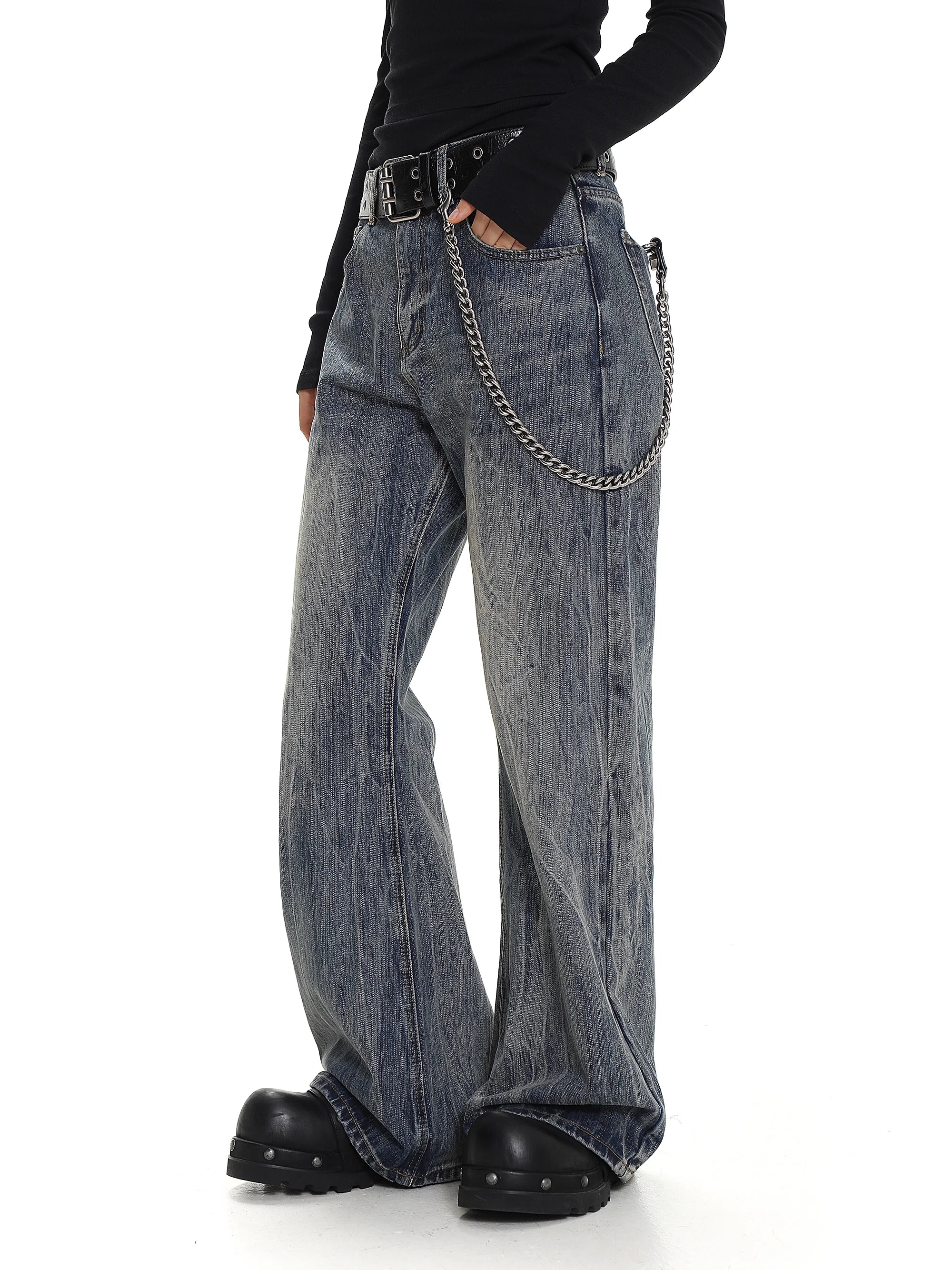 Make a bold fashion statement with these retro-inspired distressed denim jeans. Designed with a high-waisted fit and wide flared legs, these jeans feature a vintage wash and softly faded patterns for a stylish worn-in look. The loose, casual fit provides all-day comfort, while the black grommet belt and decorative chain detail at the waist add an edgy, unisex flair. Perfect for contemporary streetwear ensembles, these jeans pair effortlessly with platform footwear and relaxed tops.