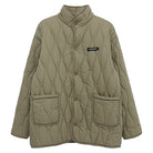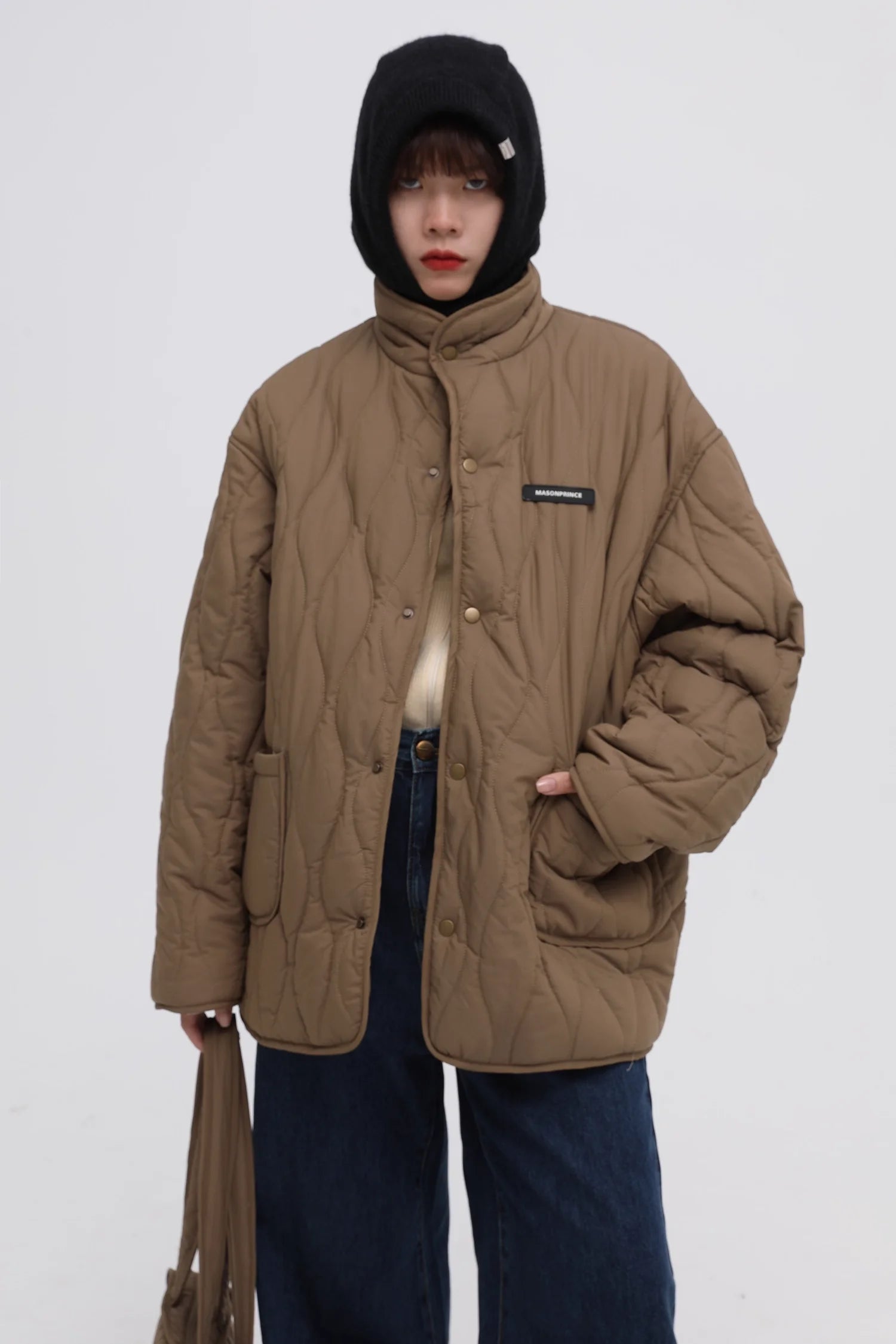Stay warm and stylish with this retro-inspired quilted cotton jacket. Featuring a stand collar and lightweight padding, this olive-green jacket offers a cozy yet breathable fit for transitional weather. Designed with practicality in mind, it includes front pockets and a relaxed silhouette perfect for layering.