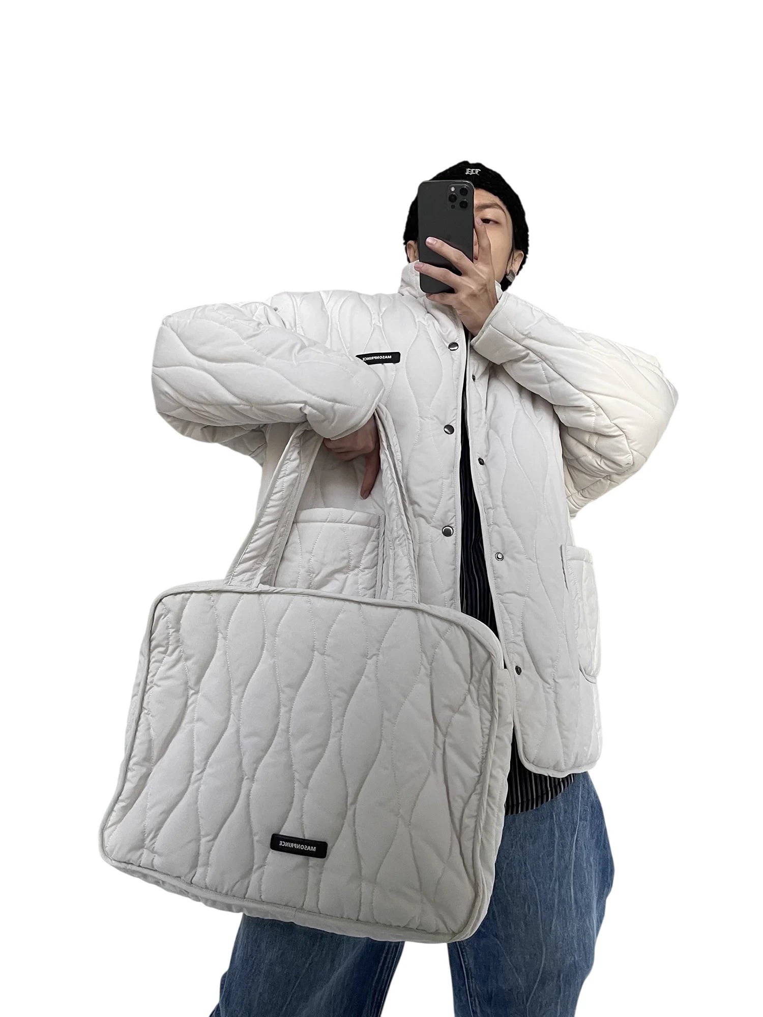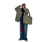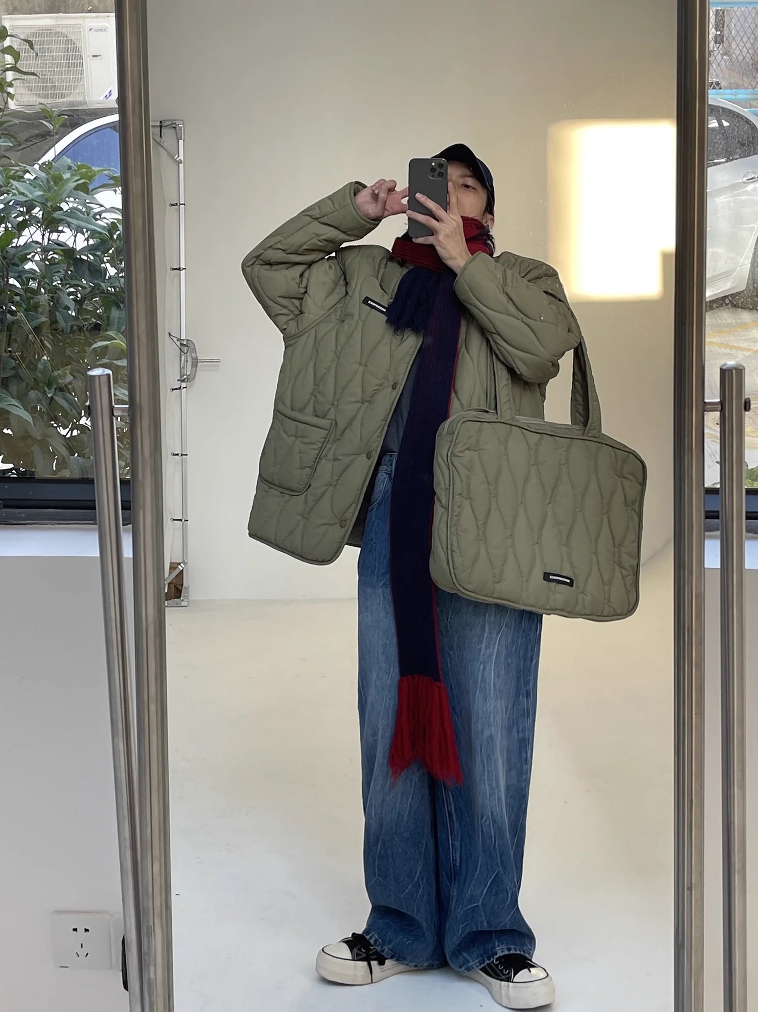 This unisex jacket is styled with casual essentials like loose-fitting jeans, black-and-white sneakers, and accessorized with a quilted tote bag, a navy scarf, and a black baseball cap for a laid-back, modern look. Ideal for both indoor and outdoor wear during cooler months.