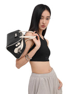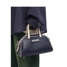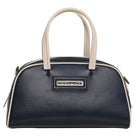 This retro-inspired crossbody bag features a stylish two-tone navy blue and cream design. With a structured silhouette, dual top handles, and silver hardware, it offers both fashion and functionality. The top zip closure secures your essentials, making it a versatile accessory ideal for casual and semi-formal occasions. Designed as a unisex piece, it complements a variety of styles and outfits.