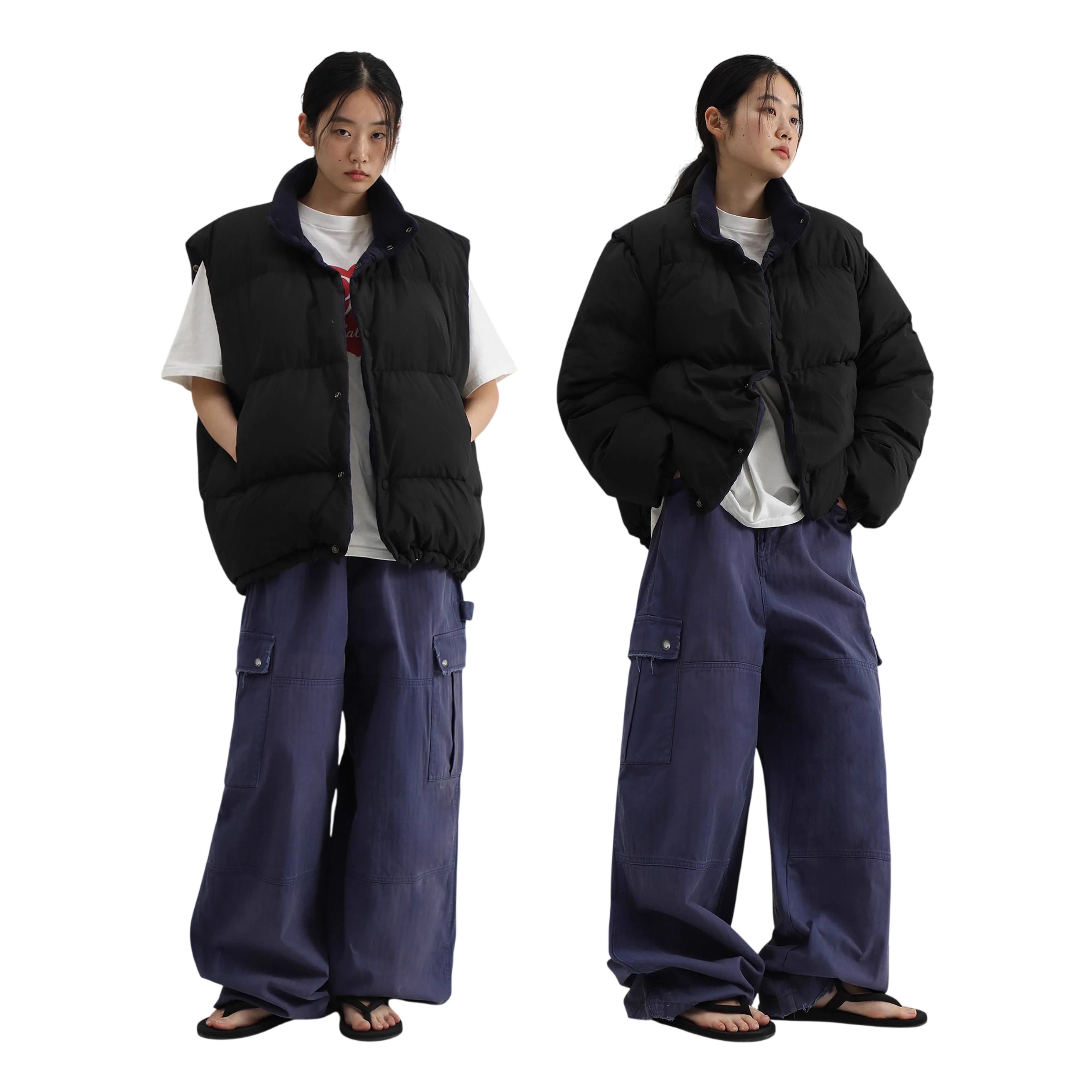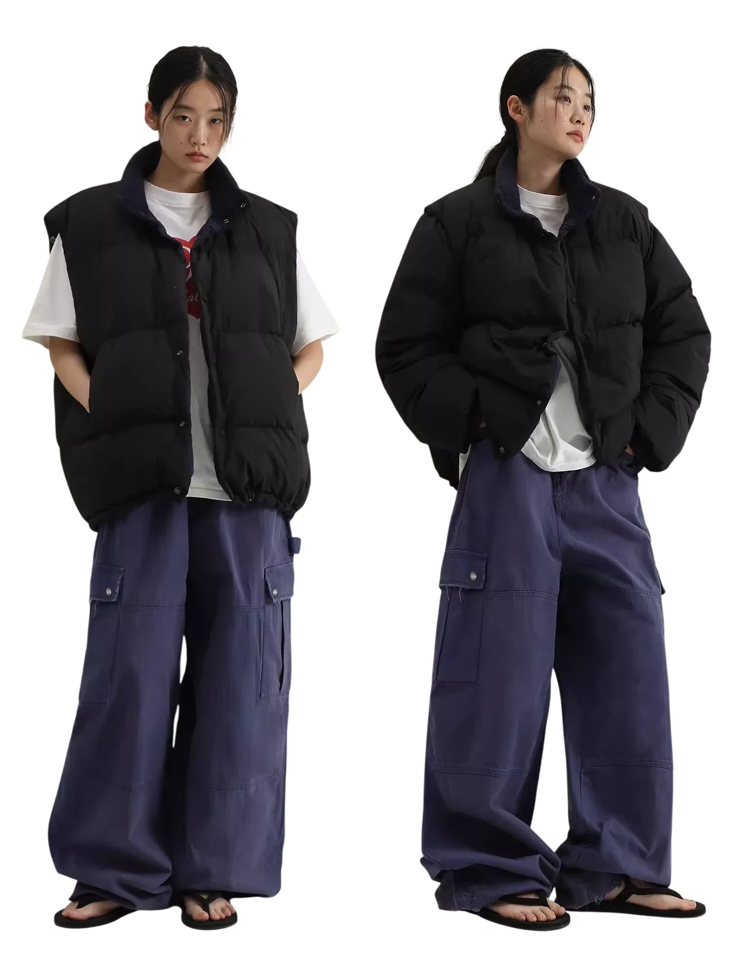 This versatile women's quilted down jacket offers both warmth and style, filled with 90% white duck down for lightweight insulation. Designed for adaptability, it features a reversible construction and detachable sleeves, allowing it to be worn as a full-sleeve puffer or converted to a sleeveless vest. With a clean, contemporary silhouette, it's the perfect layering piece for changing seasons and streetwear-inspired looks.