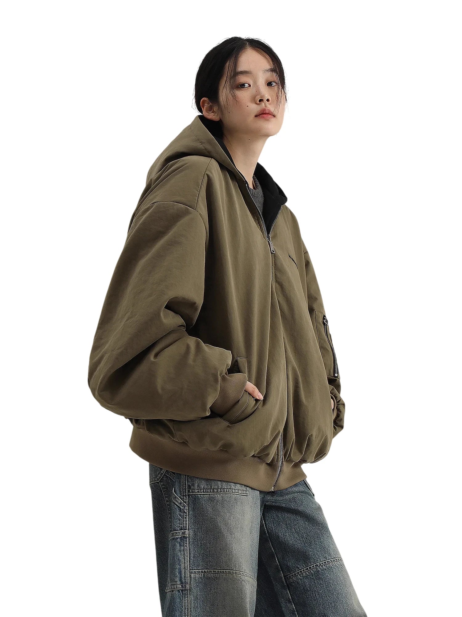Details include a zip-up front, roomy hood, and practical side pockets. This versatile piece combines functionality with fashion-forward style, making it a perfect addition to your seasonal wardrobe.