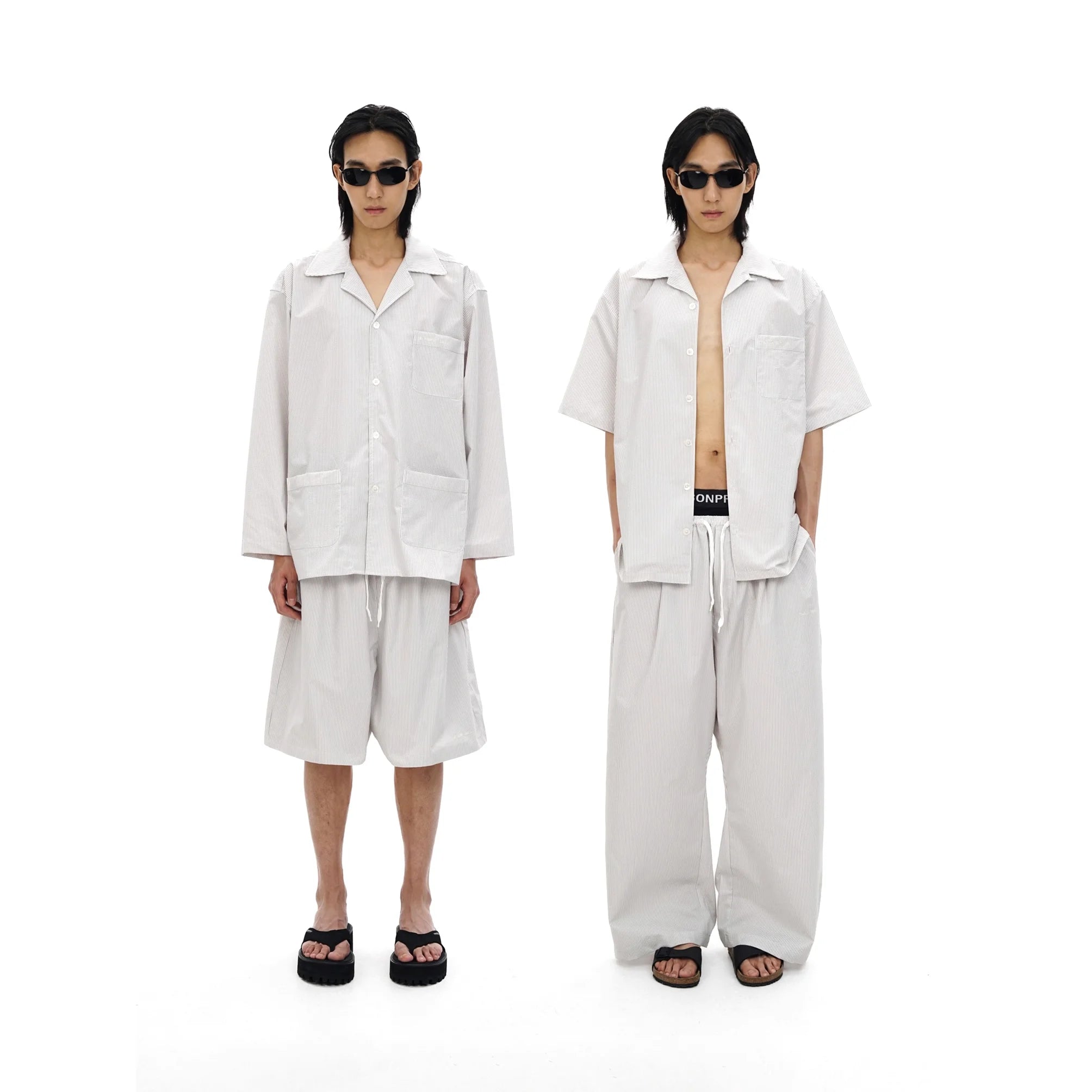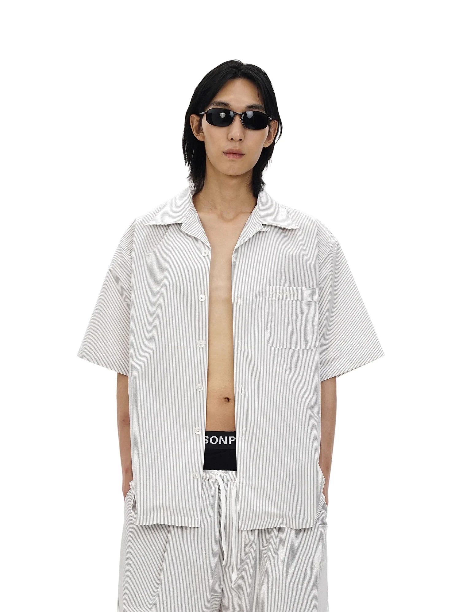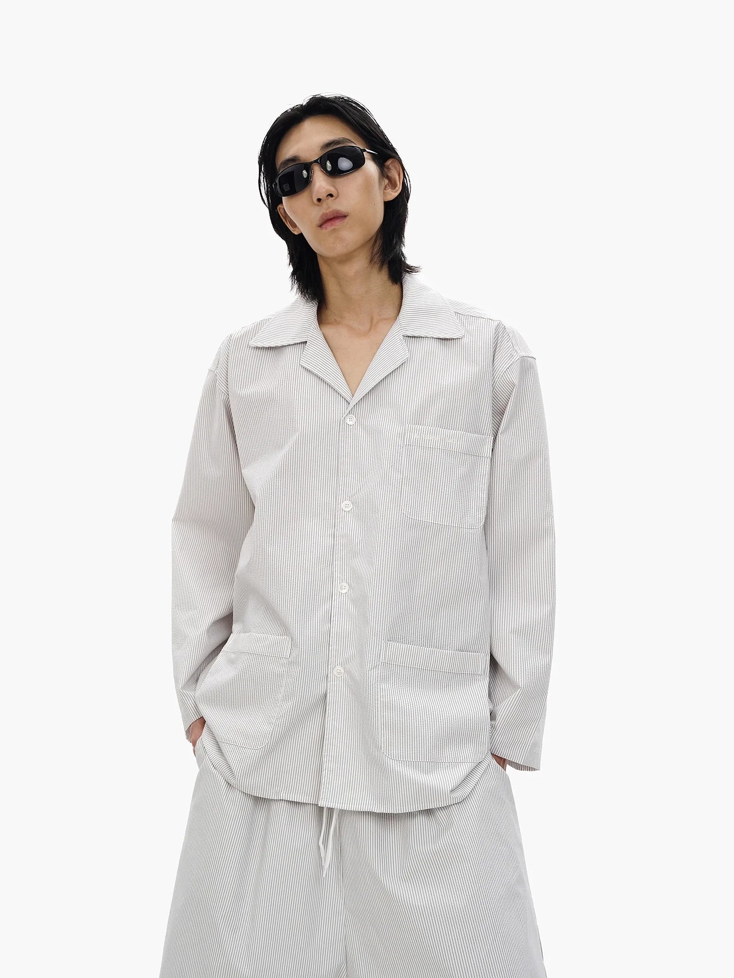 Elevate your casual wardrobe with this oversized salt-shrunk striped shirt, available in both short and long sleeve options. Designed with a relaxed unisex fit, this shirt features a subtle light grey pinstripe pattern and utilitarian-inspired patch pockets on the front. The long sleeve version includes three front pockets and pairs effortlessly with voluminous shorts, while the short sleeve style is ideal for layering over streetwear staples, like bold underwear or drawstring trousers. Styled with black slide sandals and slim black sunglasses, this look offers a modern, minimal edge perfect for everyday wear.