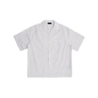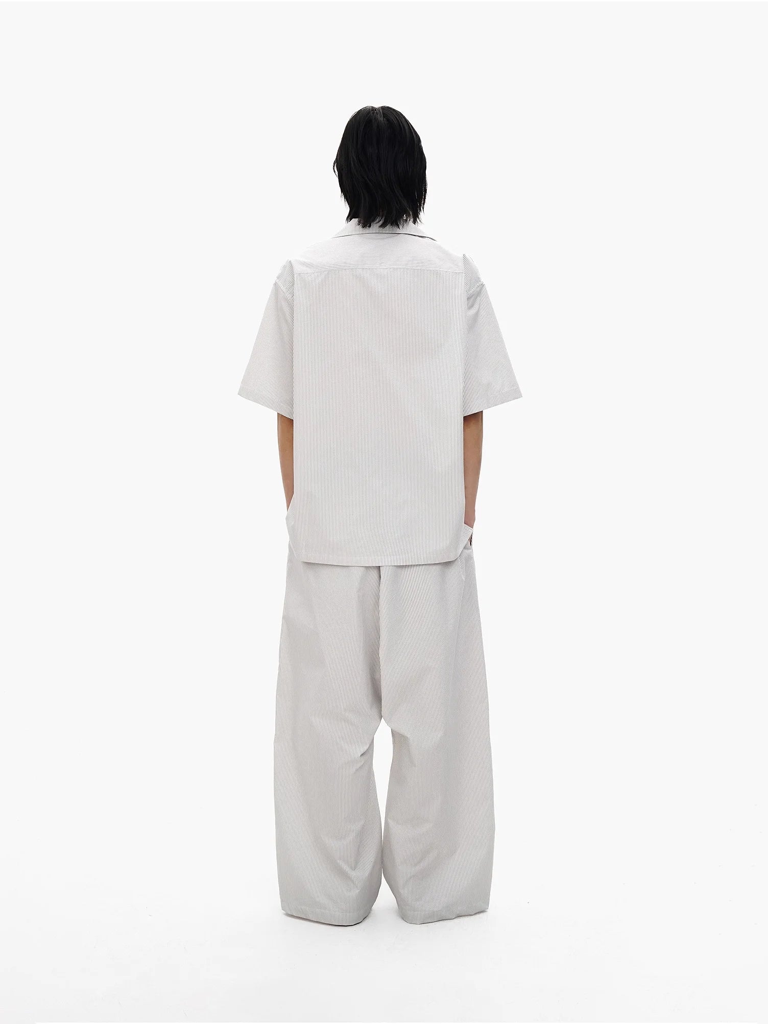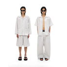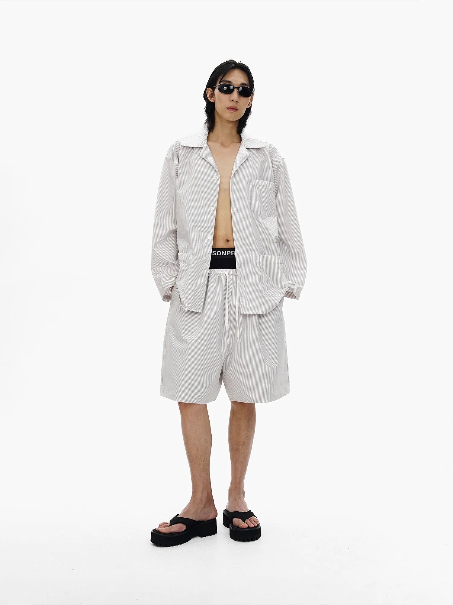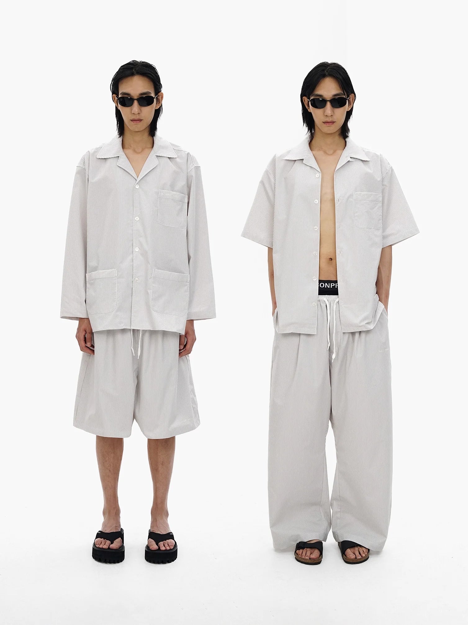 Elevate your casual wardrobe with this oversized salt-shrunk striped shirt, available in both short and long sleeve options. Designed with a relaxed unisex fit, this shirt features a subtle light grey pinstripe pattern and utilitarian-inspired patch pockets on the front. The long sleeve version includes three front pockets and pairs effortlessly with voluminous shorts, while the short sleeve style is ideal for layering over streetwear staples, like bold underwear or drawstring trousers. Styled with black slide sandals and slim black sunglasses, this look offers a modern, minimal edge perfect for everyday wear.