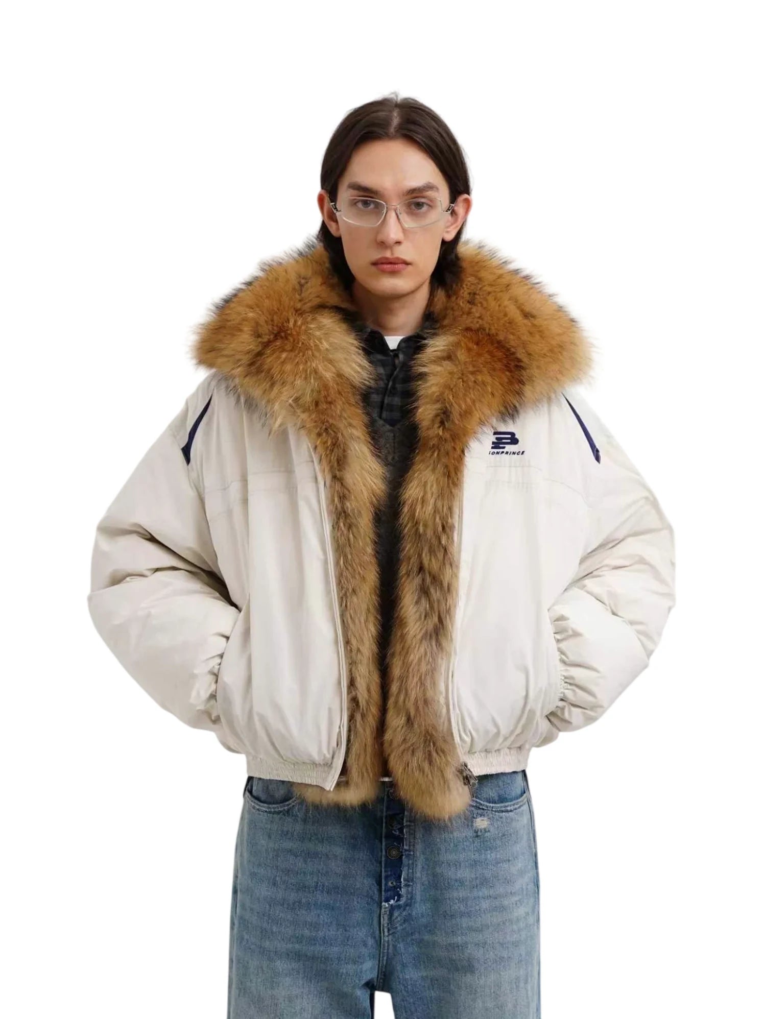 Introducing the Sport Fusion Limited Edition Down Jacket, designed with a luxurious raccoon fur collar for exceptional warmth and comfort. This heavy-duty bomber-style puffer jacket features a contemporary, gender-neutral design and is ideal for cold weather. The cream-colored outer shell is accentuated with navy blue details and a front chest logo, offering both sporty appeal and everyday versatility.