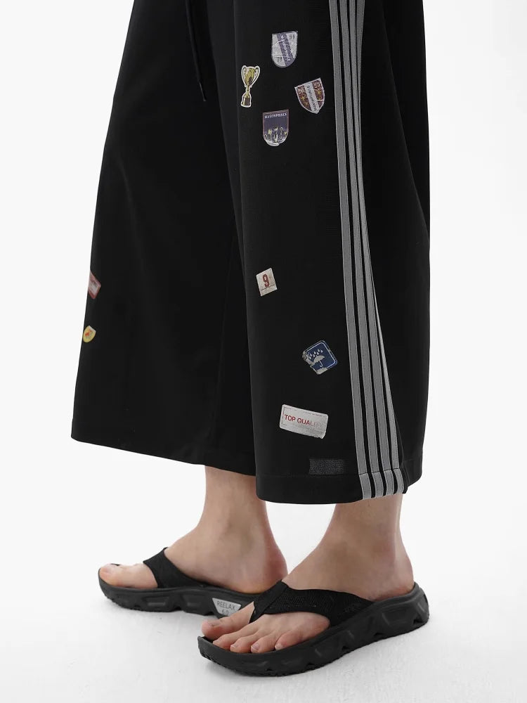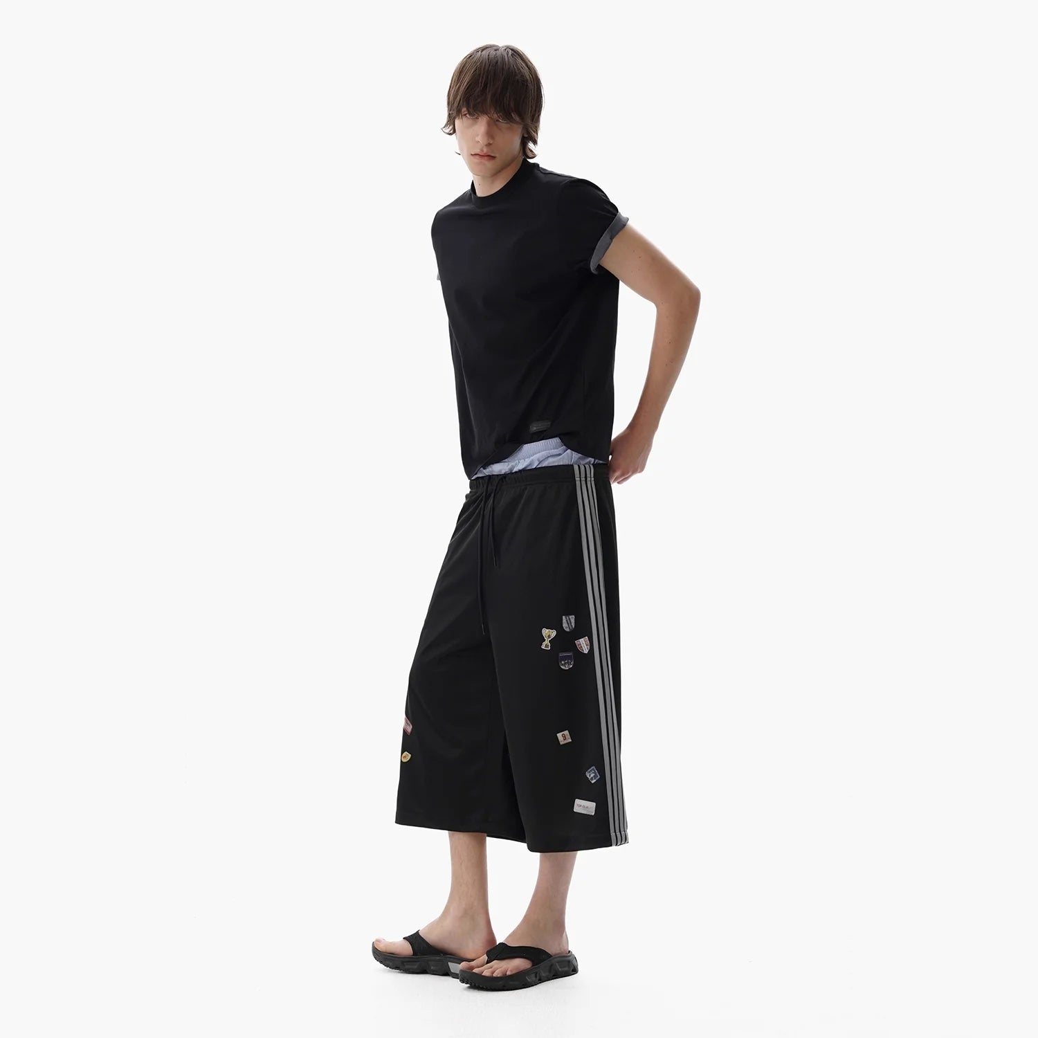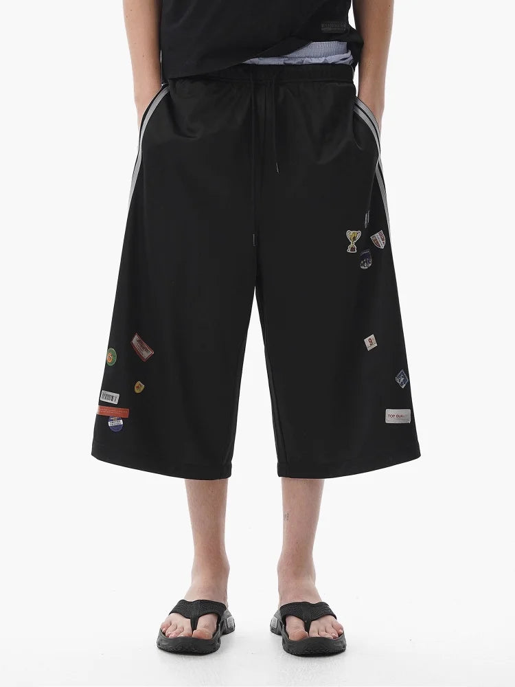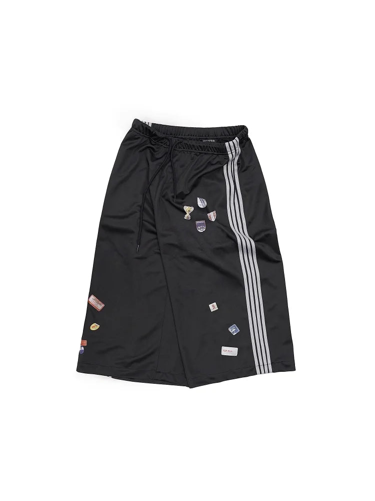 These men's cropped culotte shorts feature a modern wide-leg silhouette and a sporty aesthetic. Designed with an elastic waistband and drawstring for comfort, they are accented with signature three-stripe detailing down the sides and decorative patch elements on the front panels. Ideal for warm weather, they combine contemporary style with casual wearability.