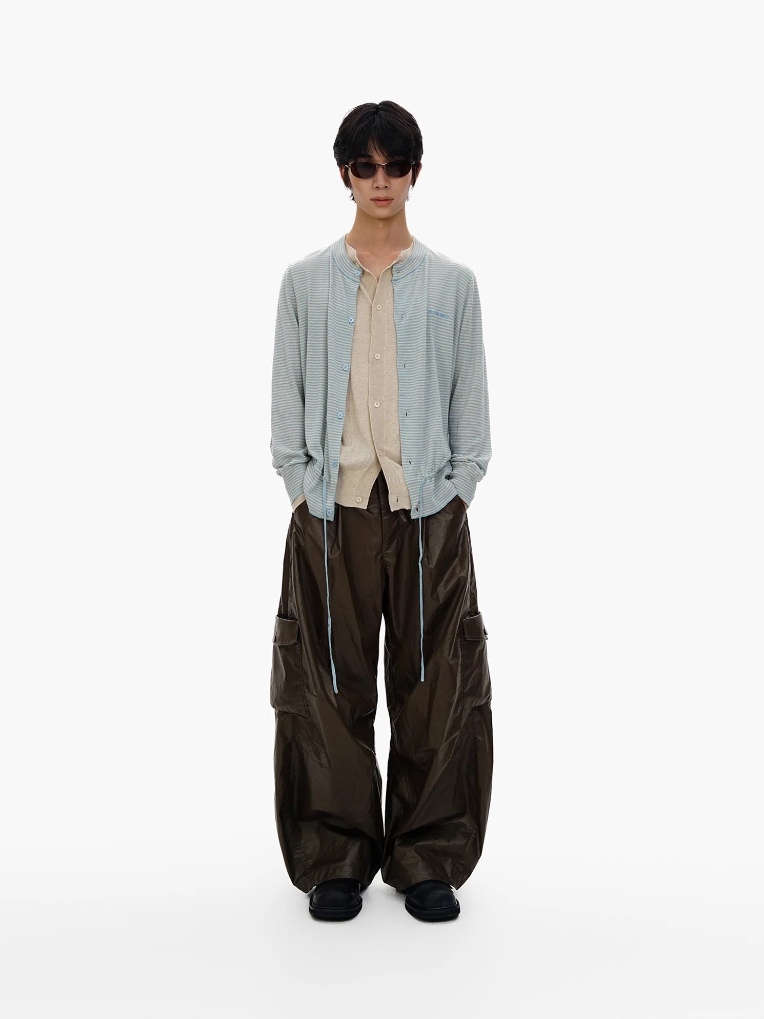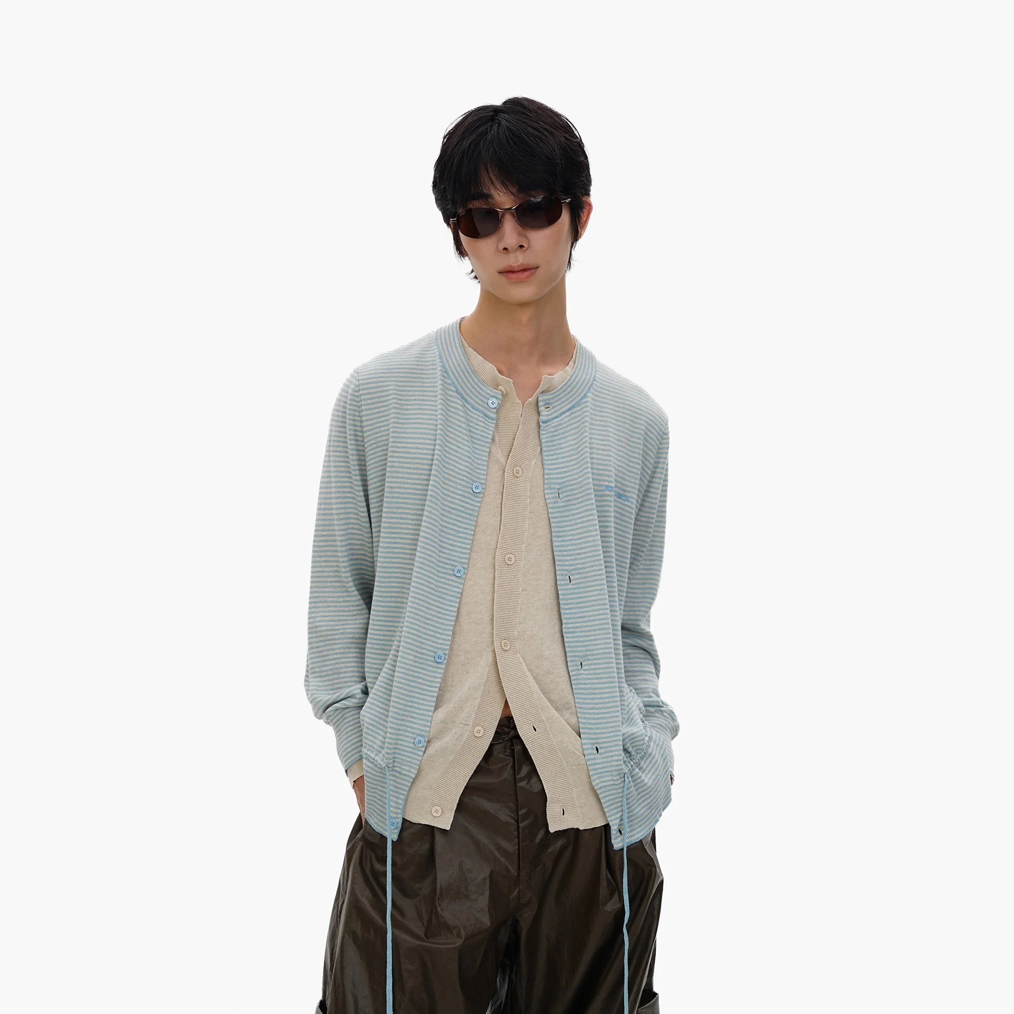 This men's knit cardigan features a stylish light blue and white striped design, creating the illusion of a layered outfit with its faux two-piece construction. Designed with a round collar and button-down front, it provides a relaxed fit ideal for casual, contemporary styling. Long sleeves and functional front pockets enhance both comfort and practicality, while its lightweight linen-cotton blend ensures breathable wear. Perfect for effortlessly polished layering.