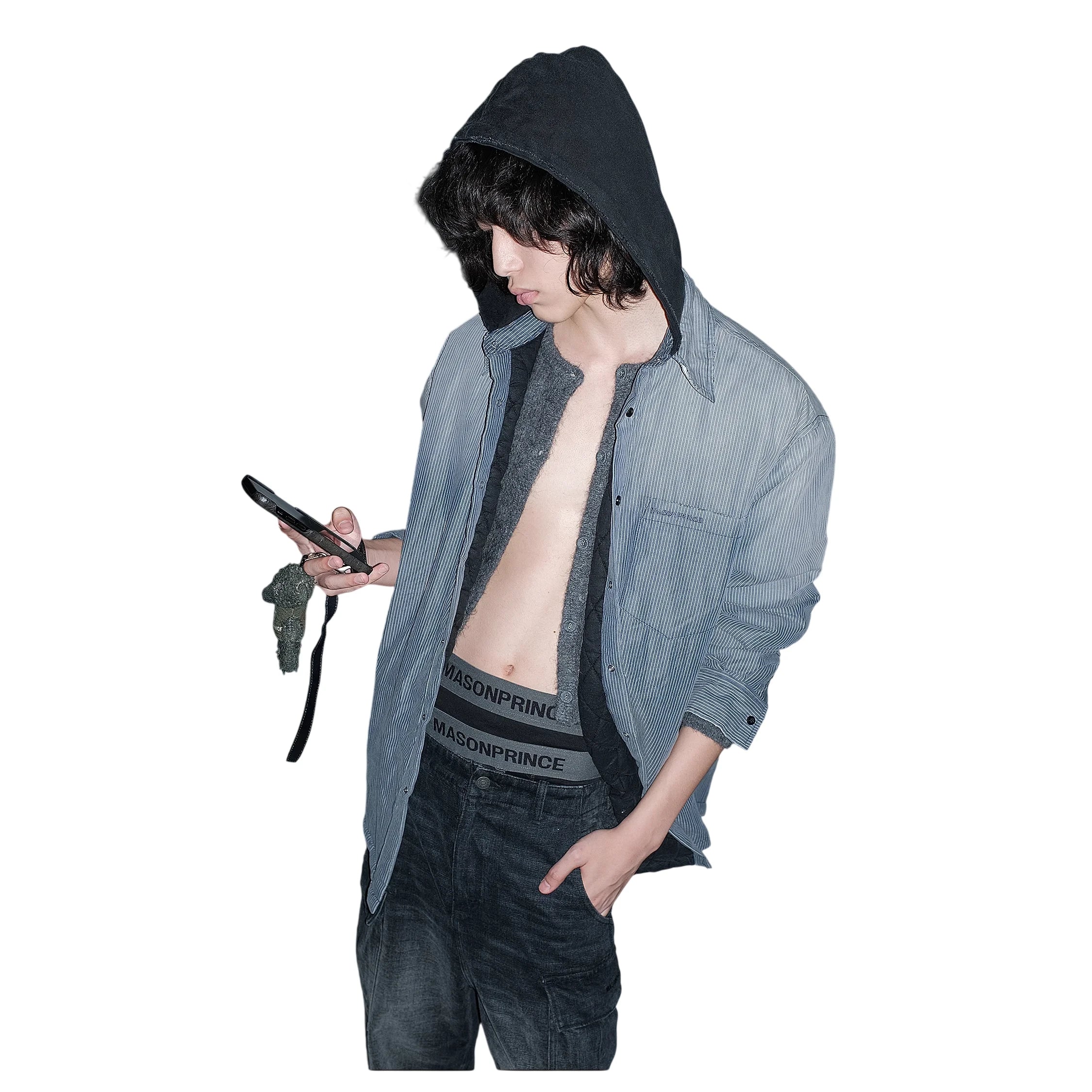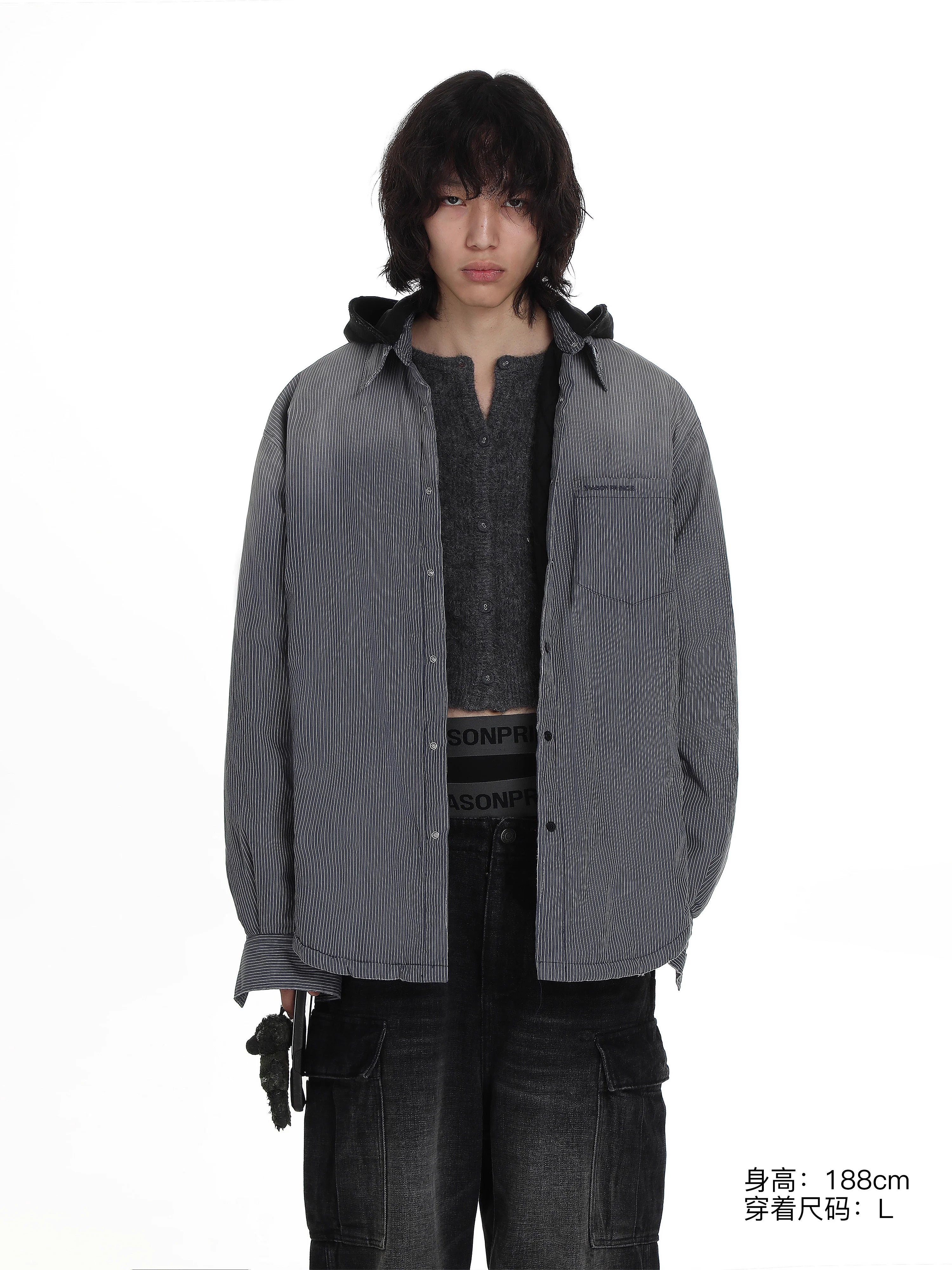 This men's hooded cotton jacket blends casual streetwear style with everyday comfort. Featuring thin stripes and a standard collar, it is designed in a lightweight, washed fabric for a relaxed and lived-in look. The open front style makes it perfect for layering over hoodies or t-shirts, ideal for laid-back outfits.