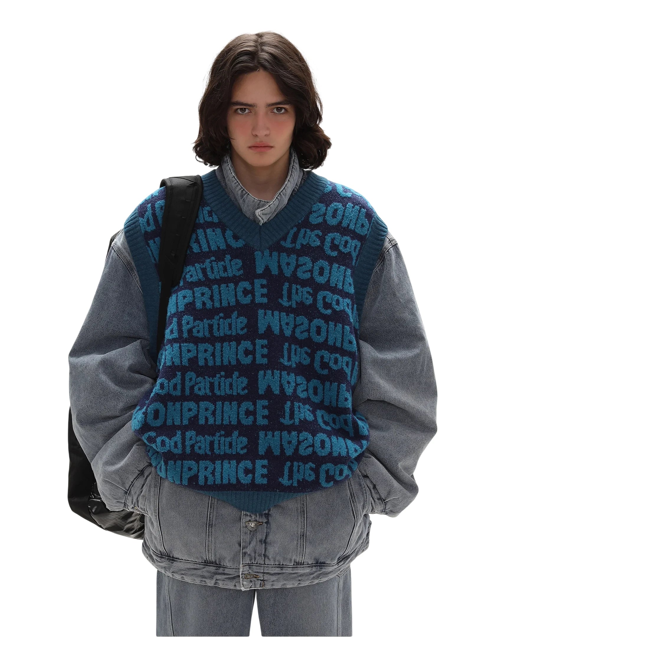 Elevate your streetwear style with this oversized V-neck knit vest, featuring a bold, all-over typographic design in varying fonts. Crafted in a textured wool blend, this fashion-forward piece makes a statement with abstract phrases for an edgy and artistic appeal. Layered effortlessly over a light denim jacket and paired with relaxed-fit jeans, it captures a contemporary, urban aesthetic perfect for casual everyday wear. Suitable for all genders, the look is completed with a laid-back backpack accessory.